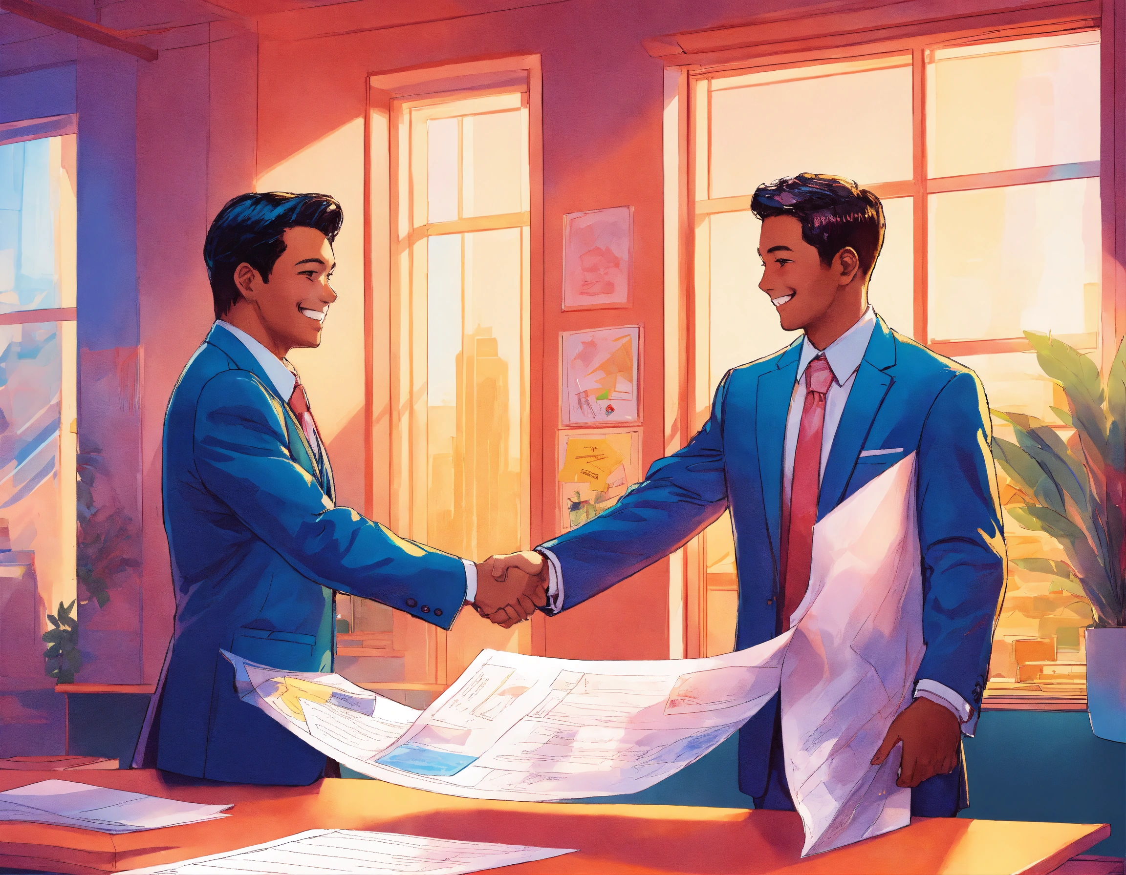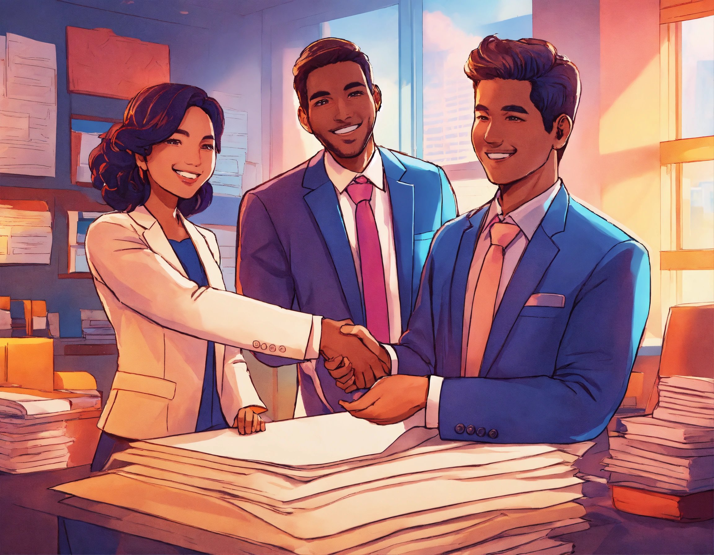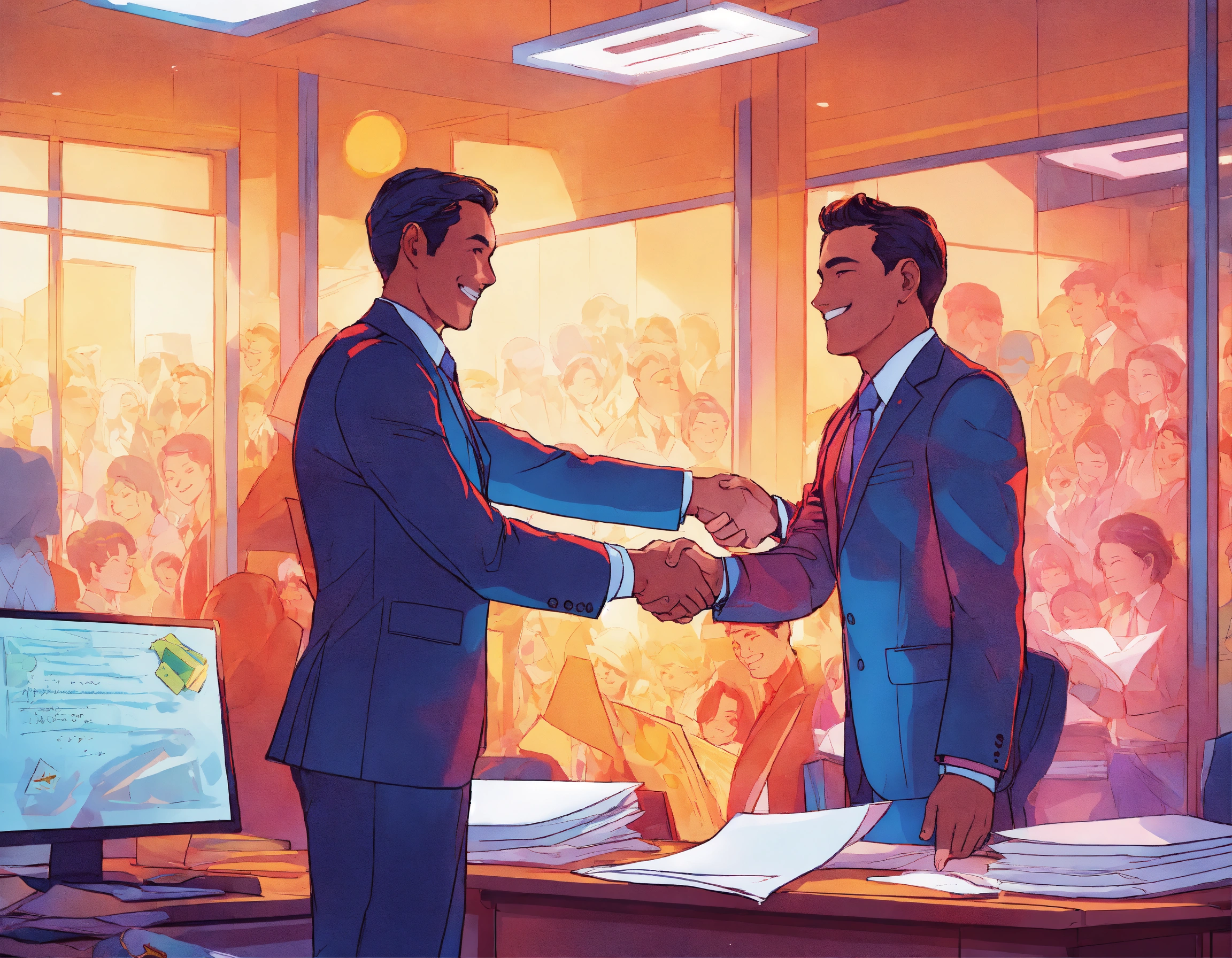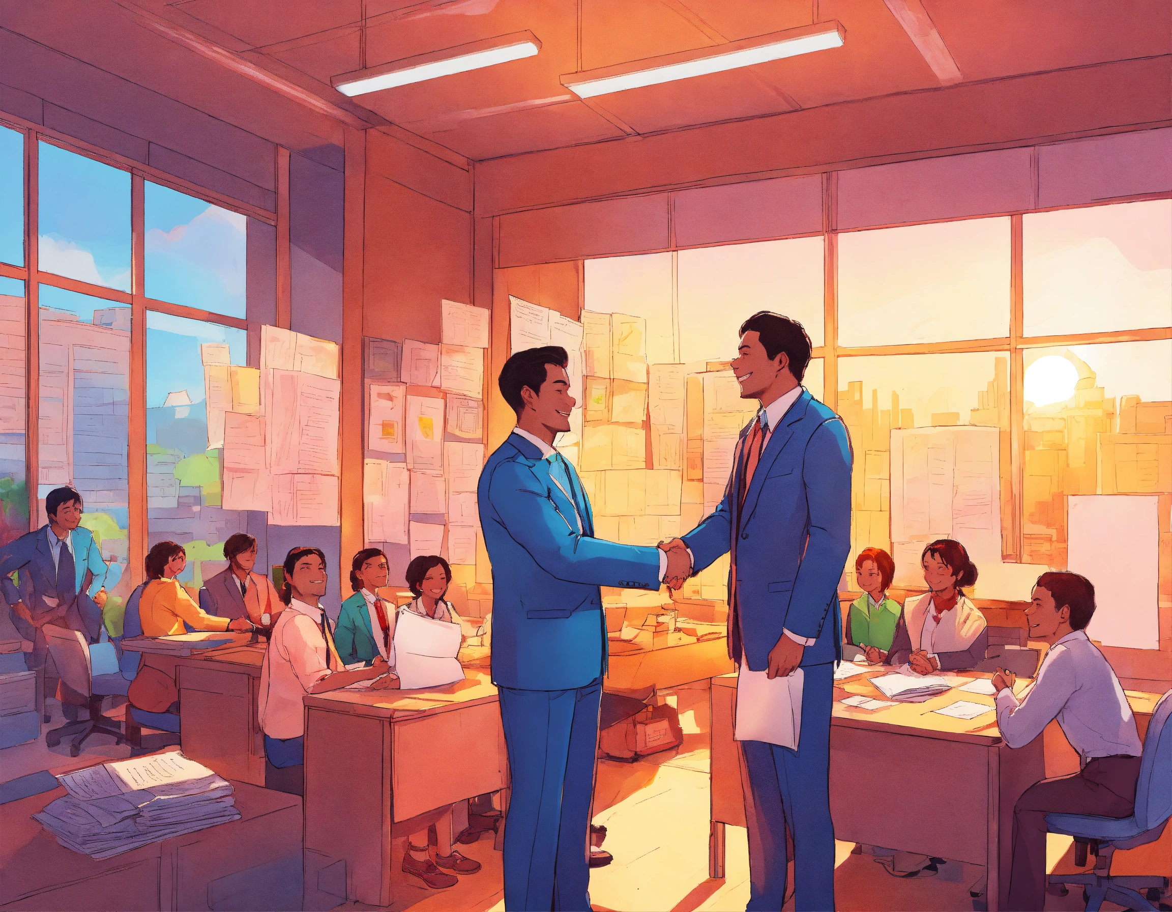 2 workers wearing suits shaking hands, behind workers holding sheets of paper, smiling, indonesian faces, indoor background in office, dramatic light, storybook illustration, 8k, by lisa frank