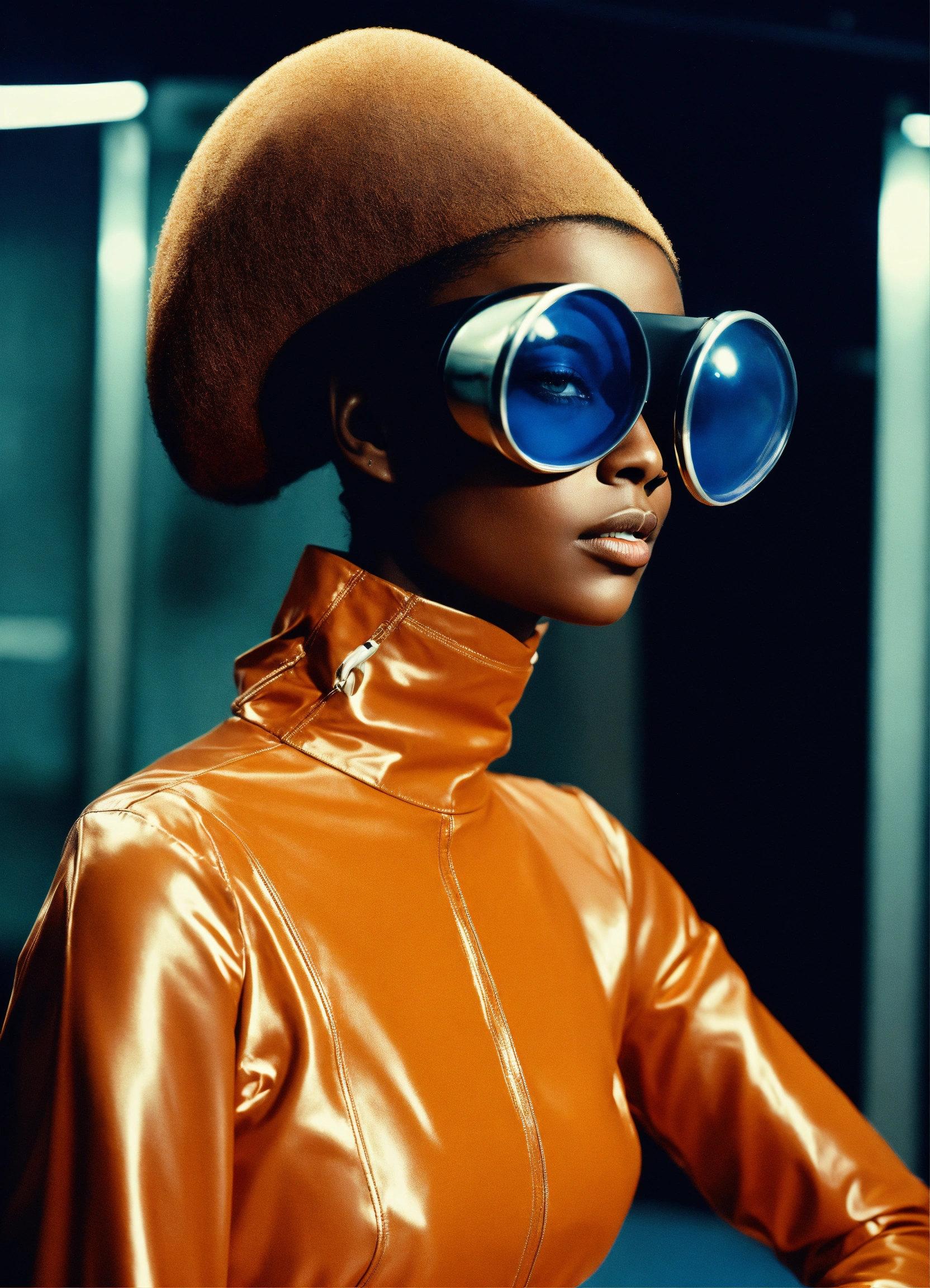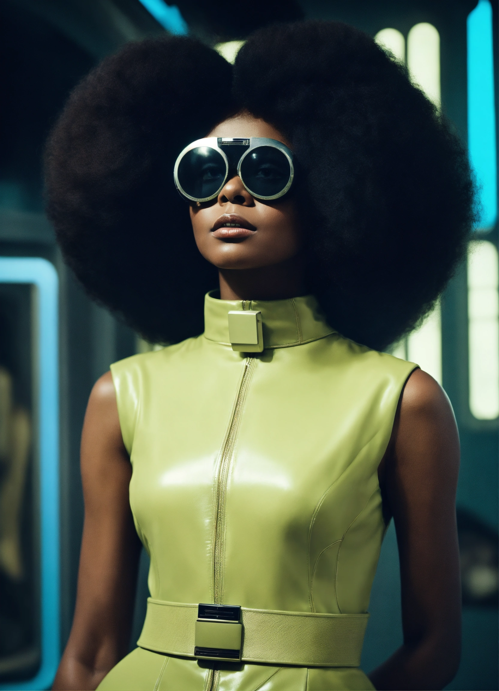 Scene retro future movie from the 1960s sci fi film, black woman, futuristic 60’s mod fashion avant-garde couture photography, sleek oversized flowing hair, minimalism