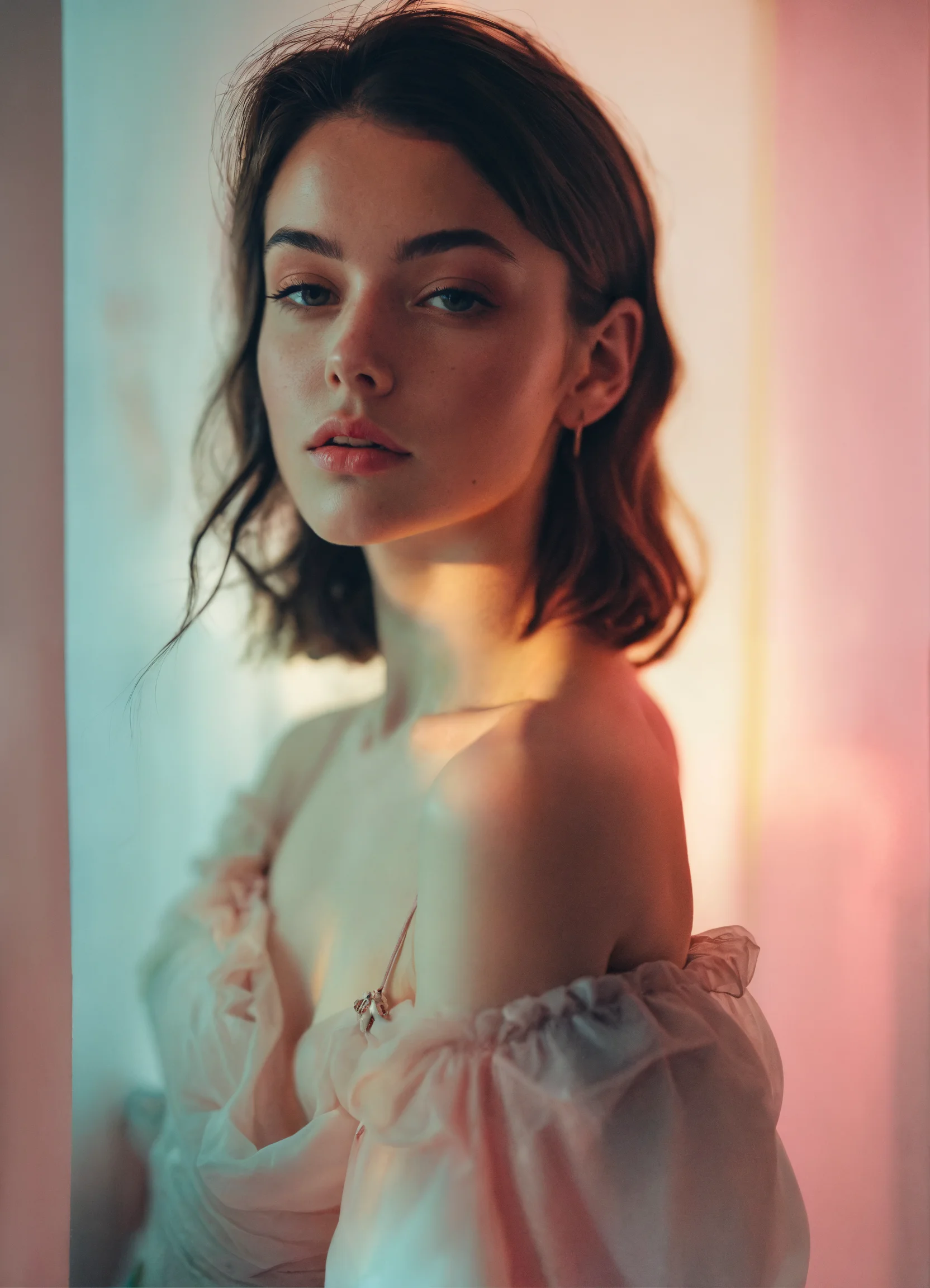 Attractive female model full body portrait, shot on leica, gorgeous lighting, subtle pastel hues, 8k, glossy lips