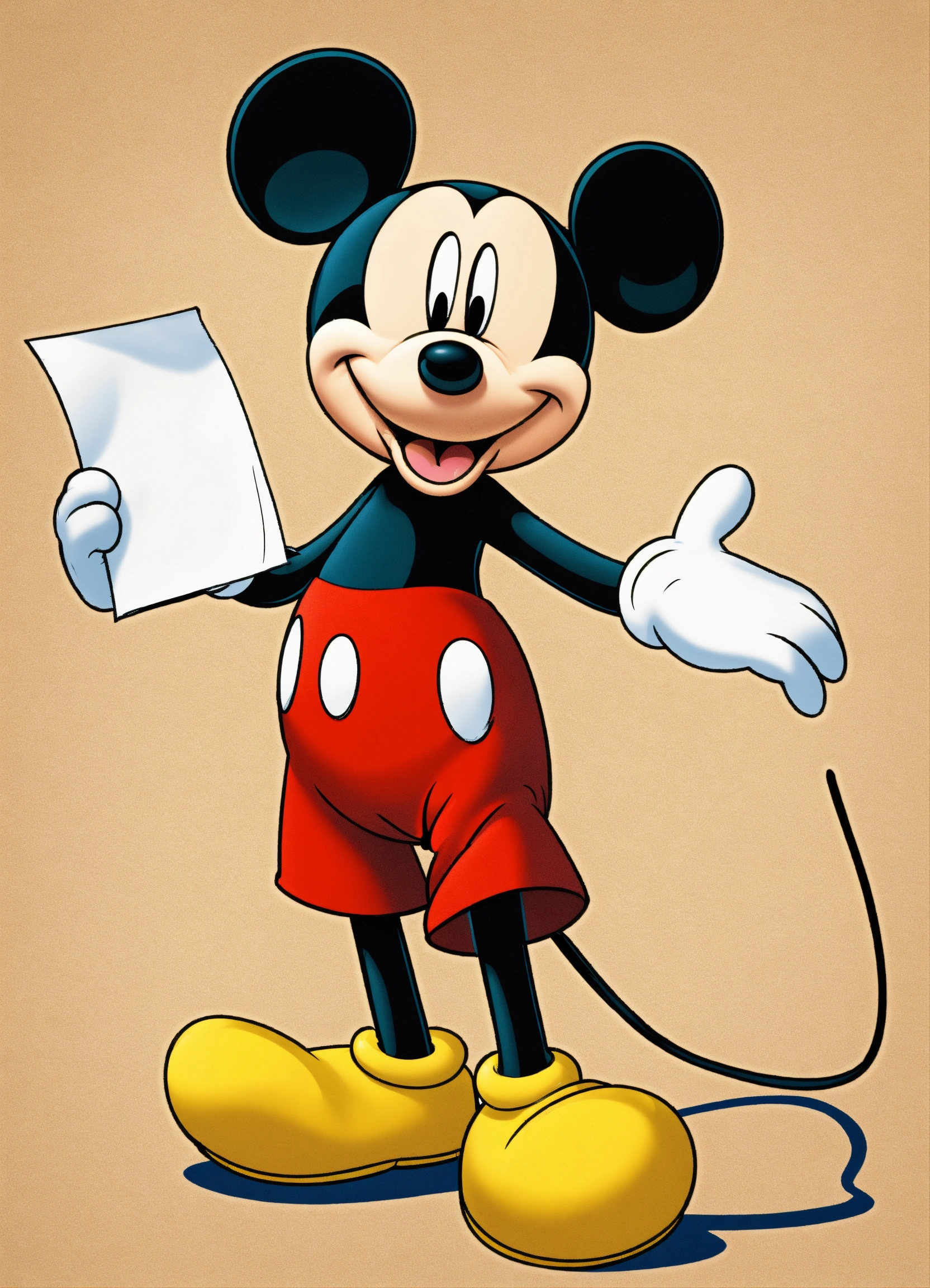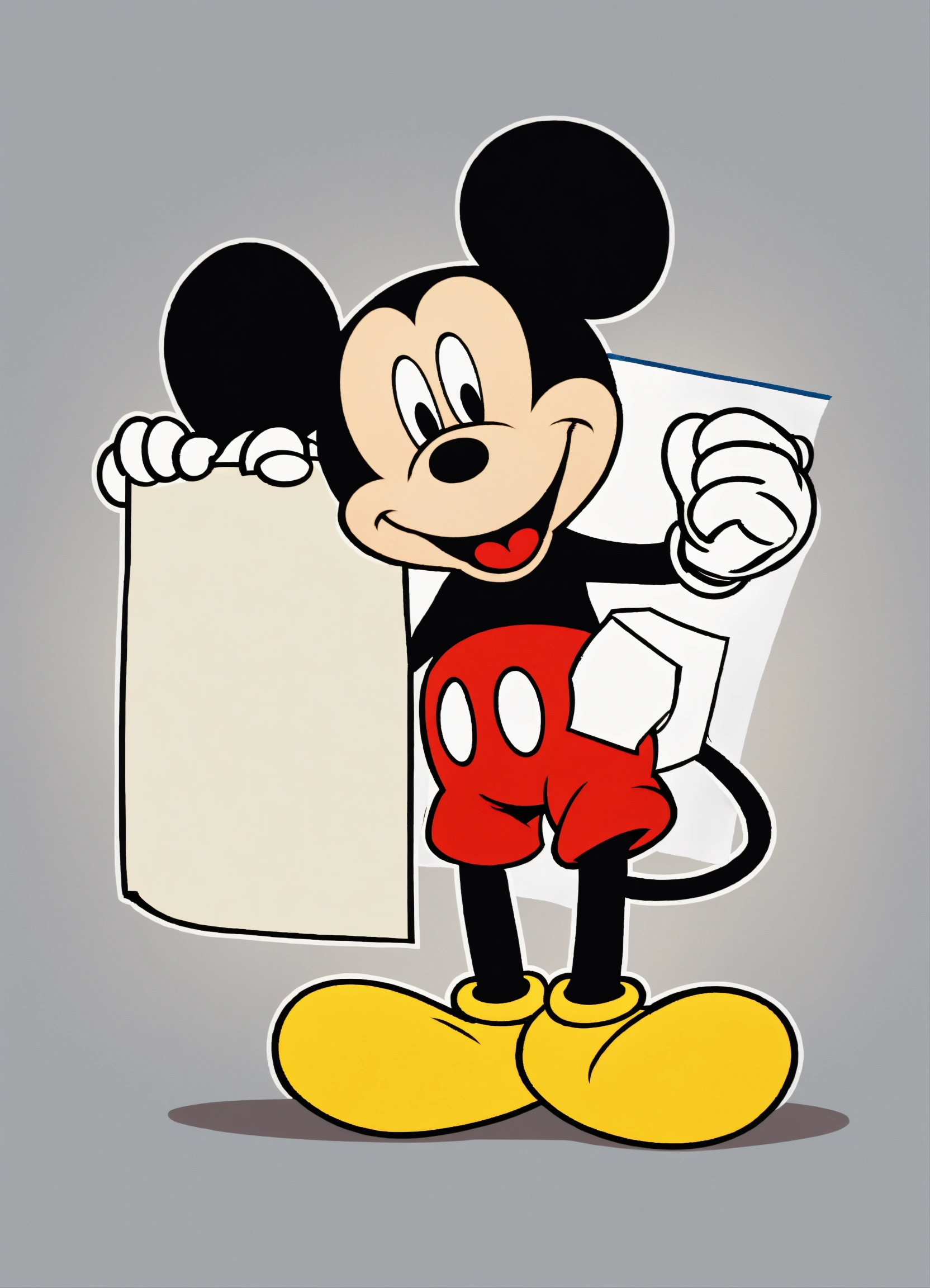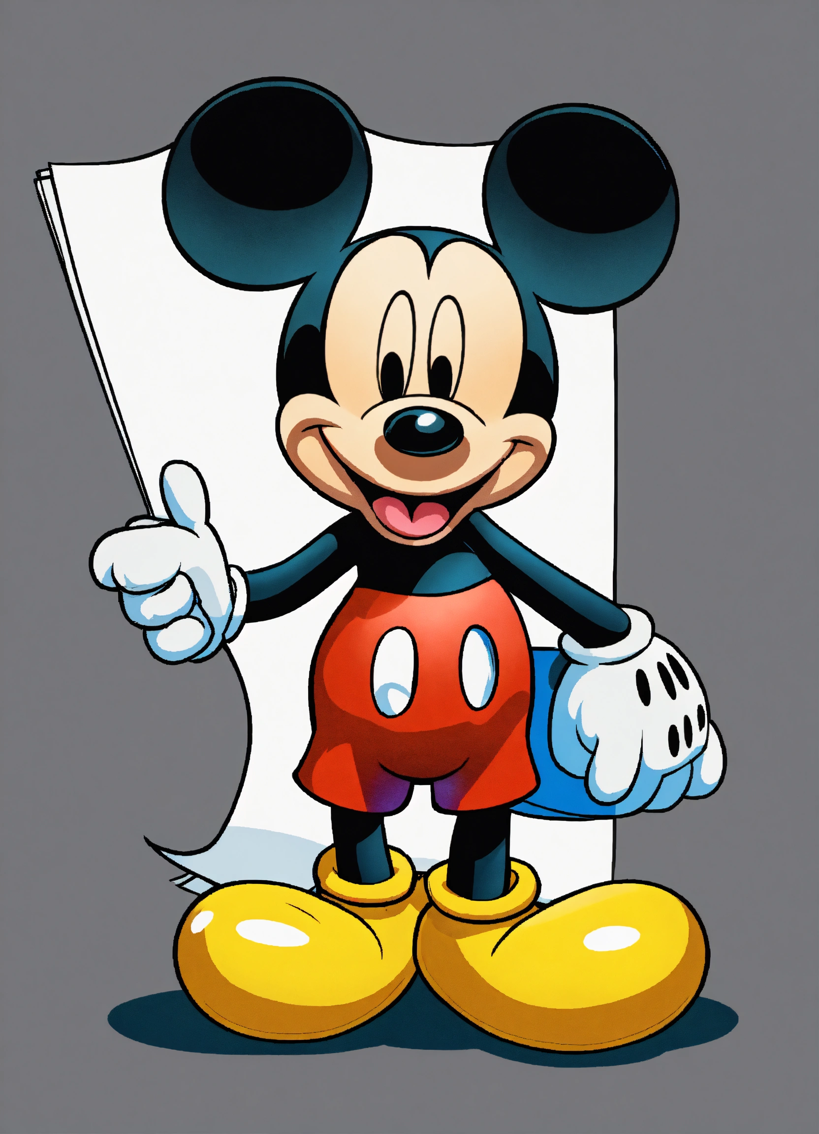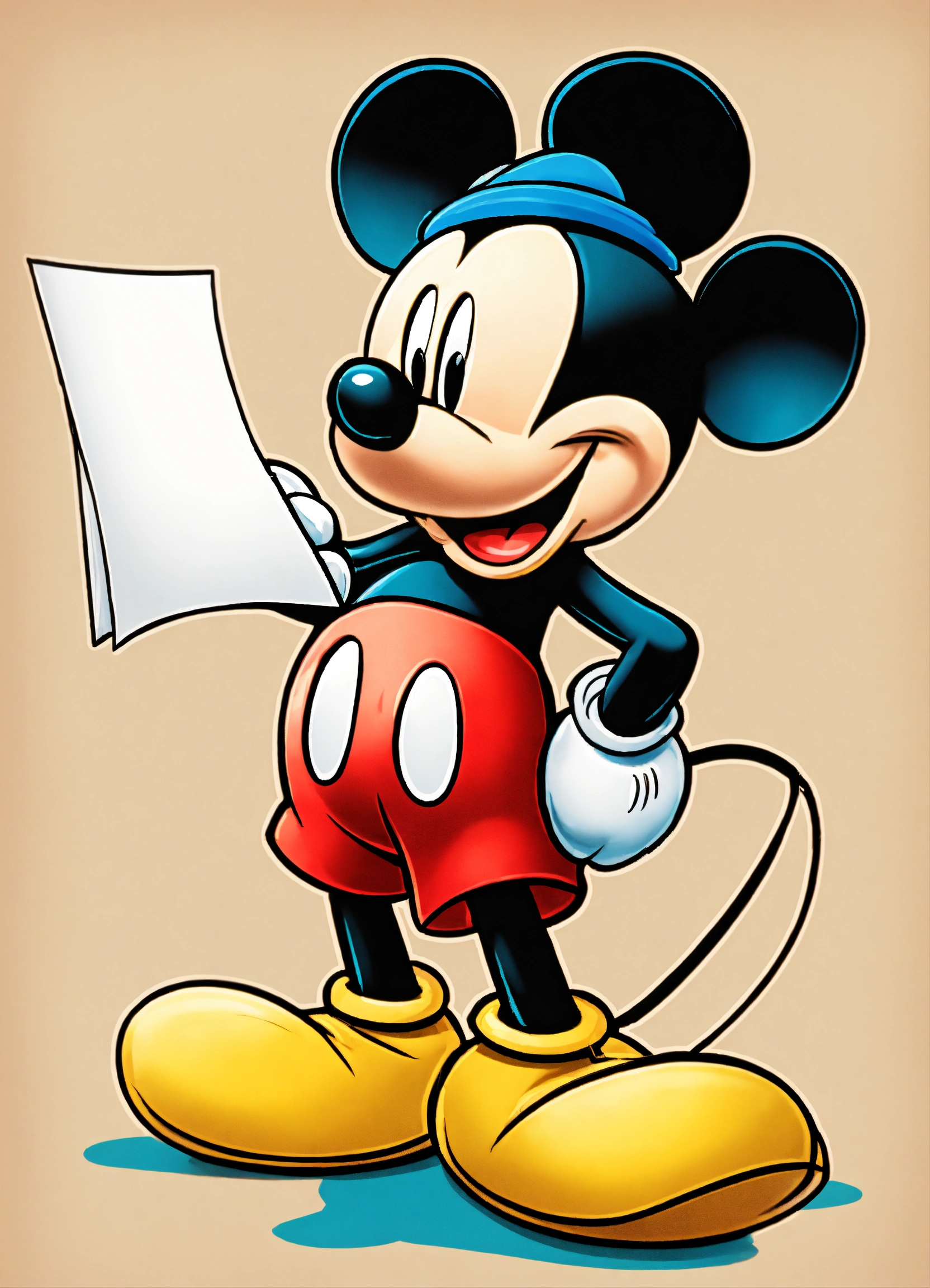 2d mickey mouse holding a sheet of paper in his hands, 8 k, high detail. full length. background colored colors simple