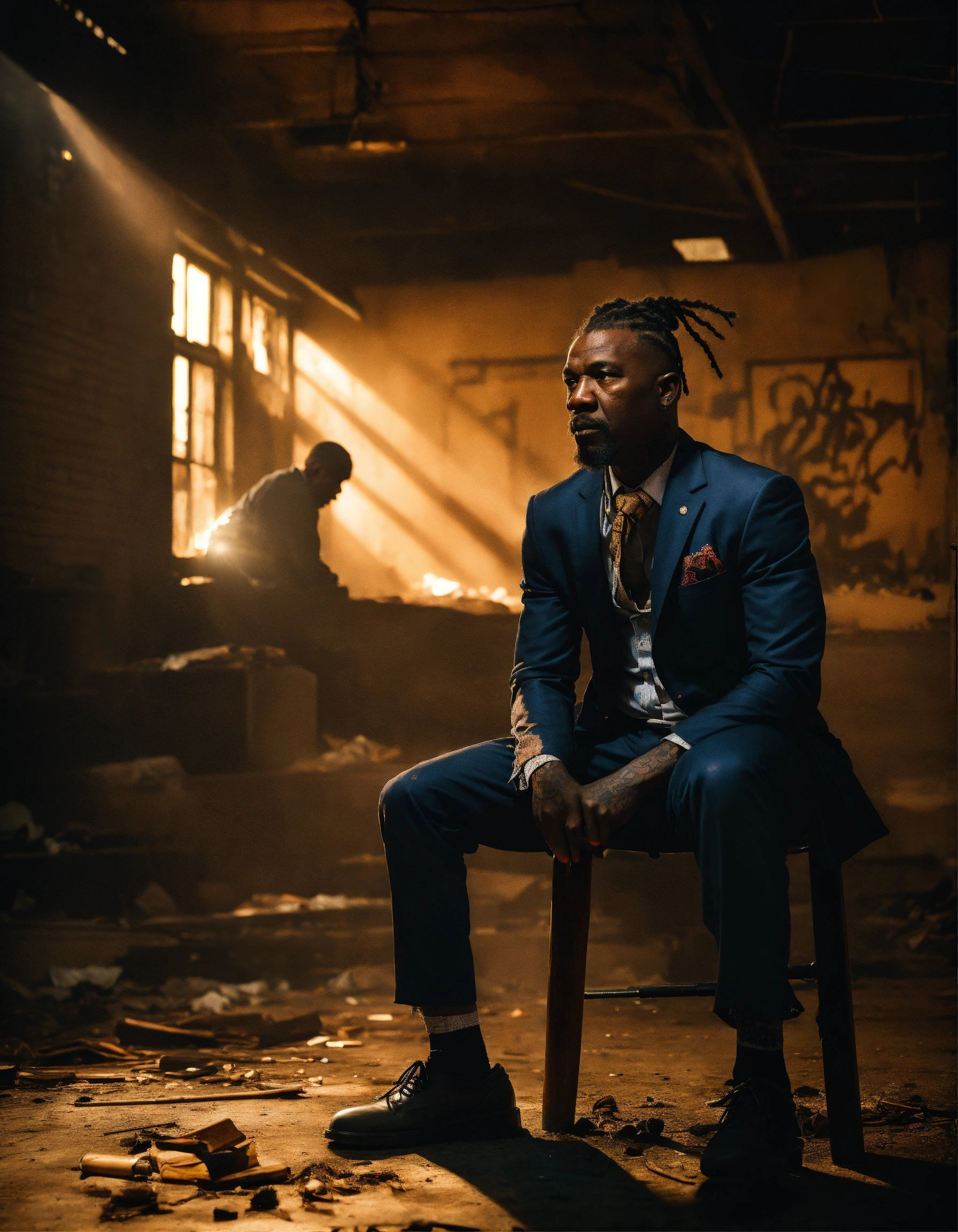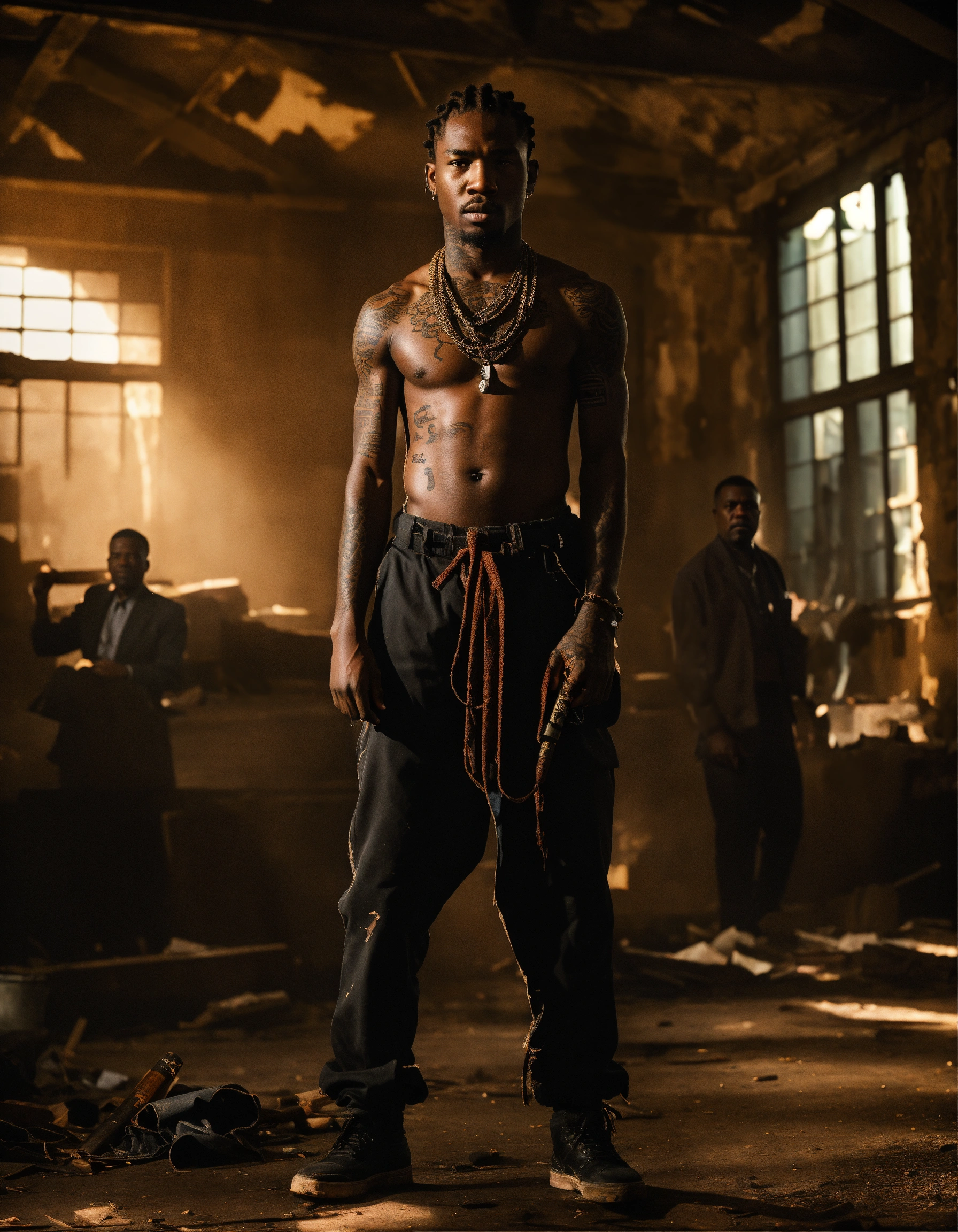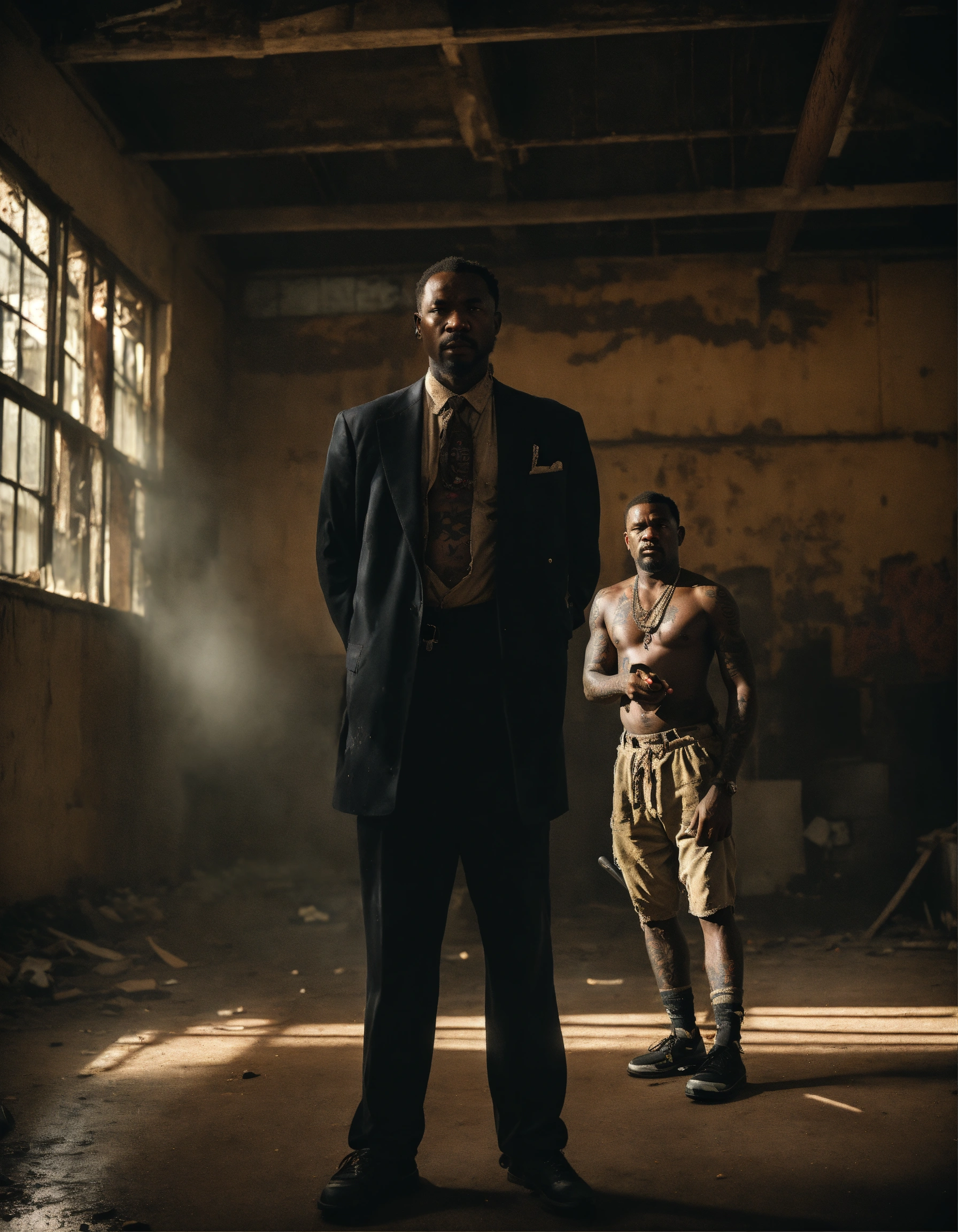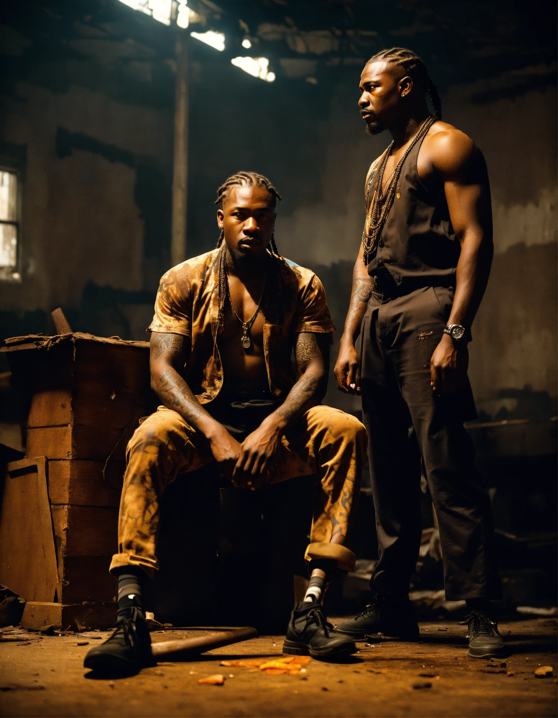 A shirtless young african american gang member with cornrows covered in tattoos ominously stands in the shadows in a dark abandoned warehouse in front of a seated old black man in a torn and tattered suit, the old black man is being held hostage, the gang member menacingly holds a wooden baseball bat over his shoulder ready to attack the old man