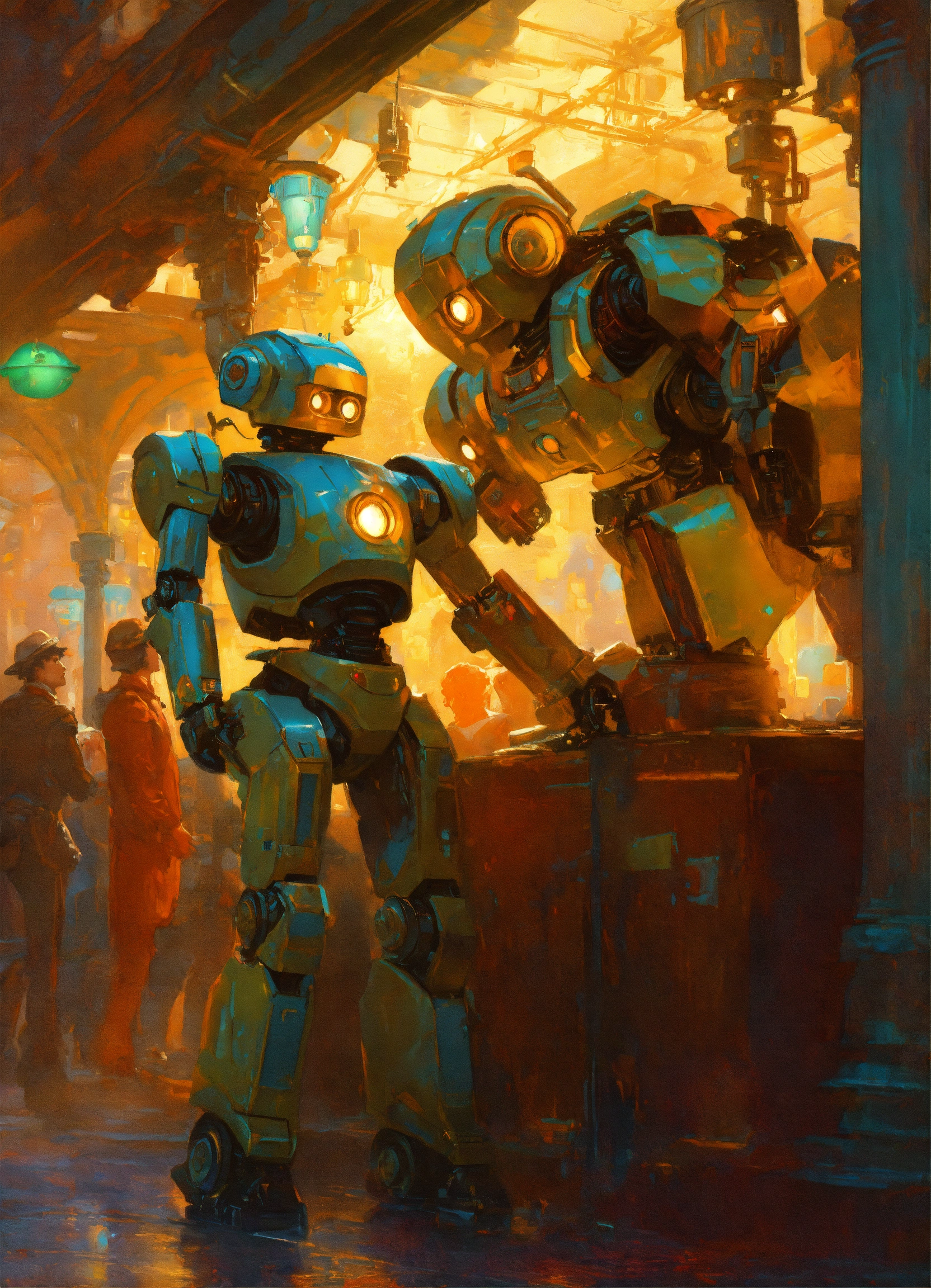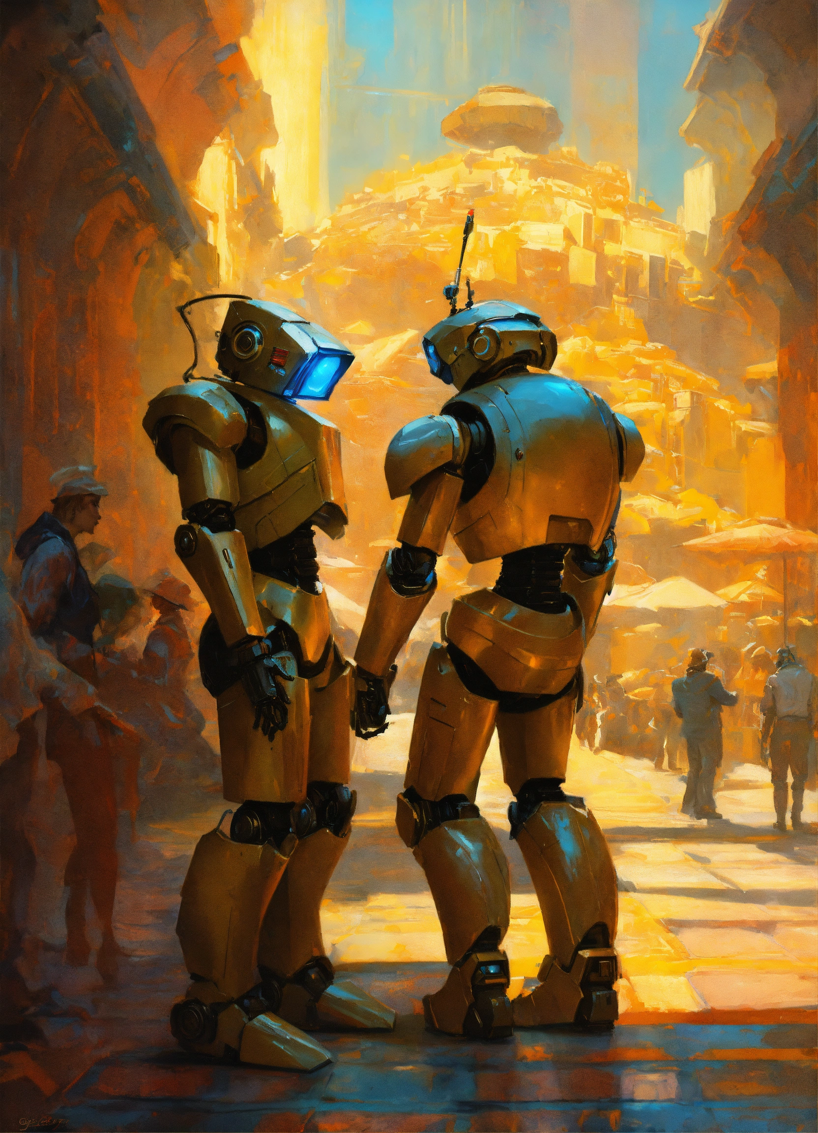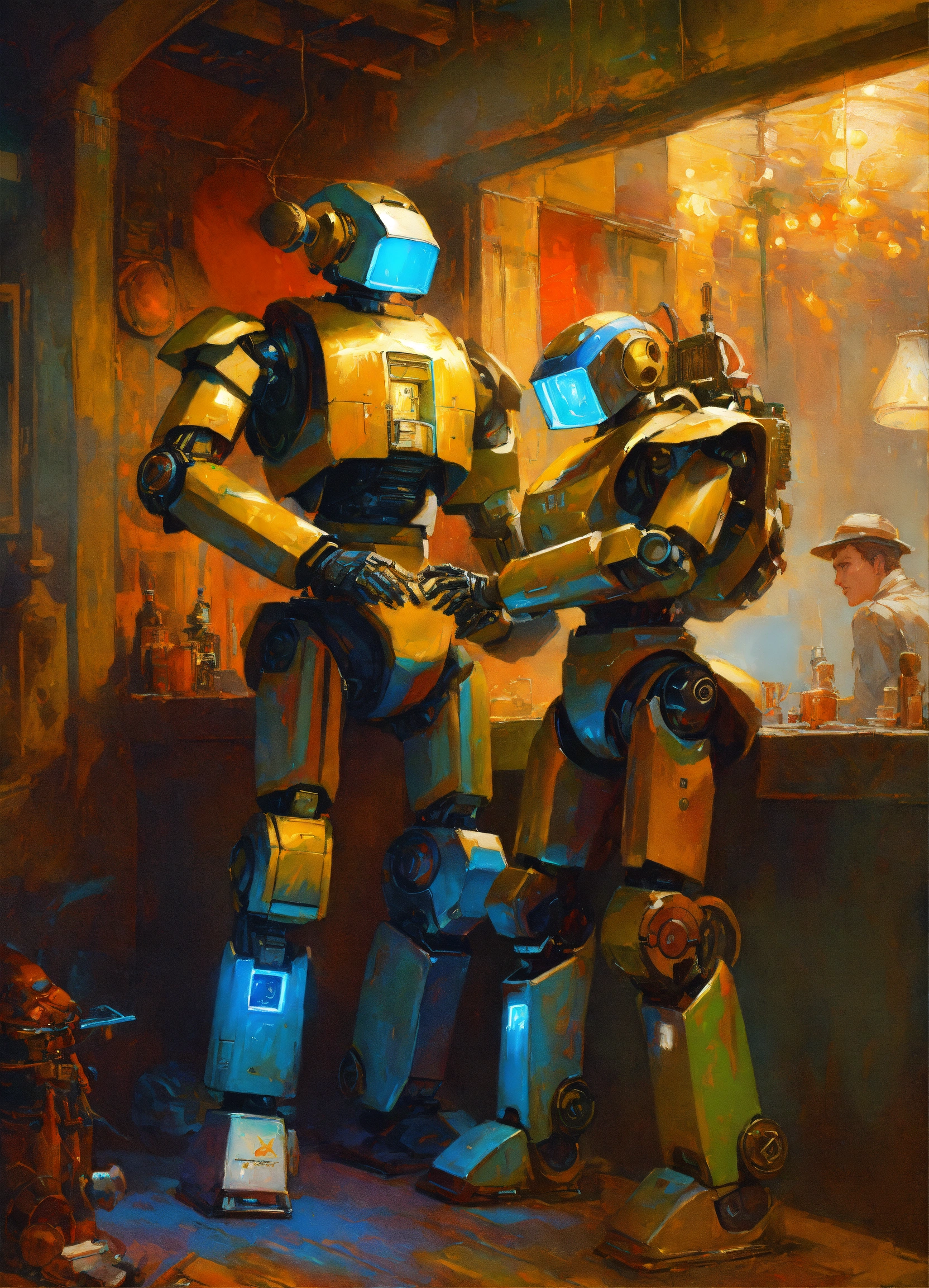 Robots embracing, painting by gaston bussiere, craig mullins, j.c. leyendecker, 8k, dynamic lighting, colorfull lighting