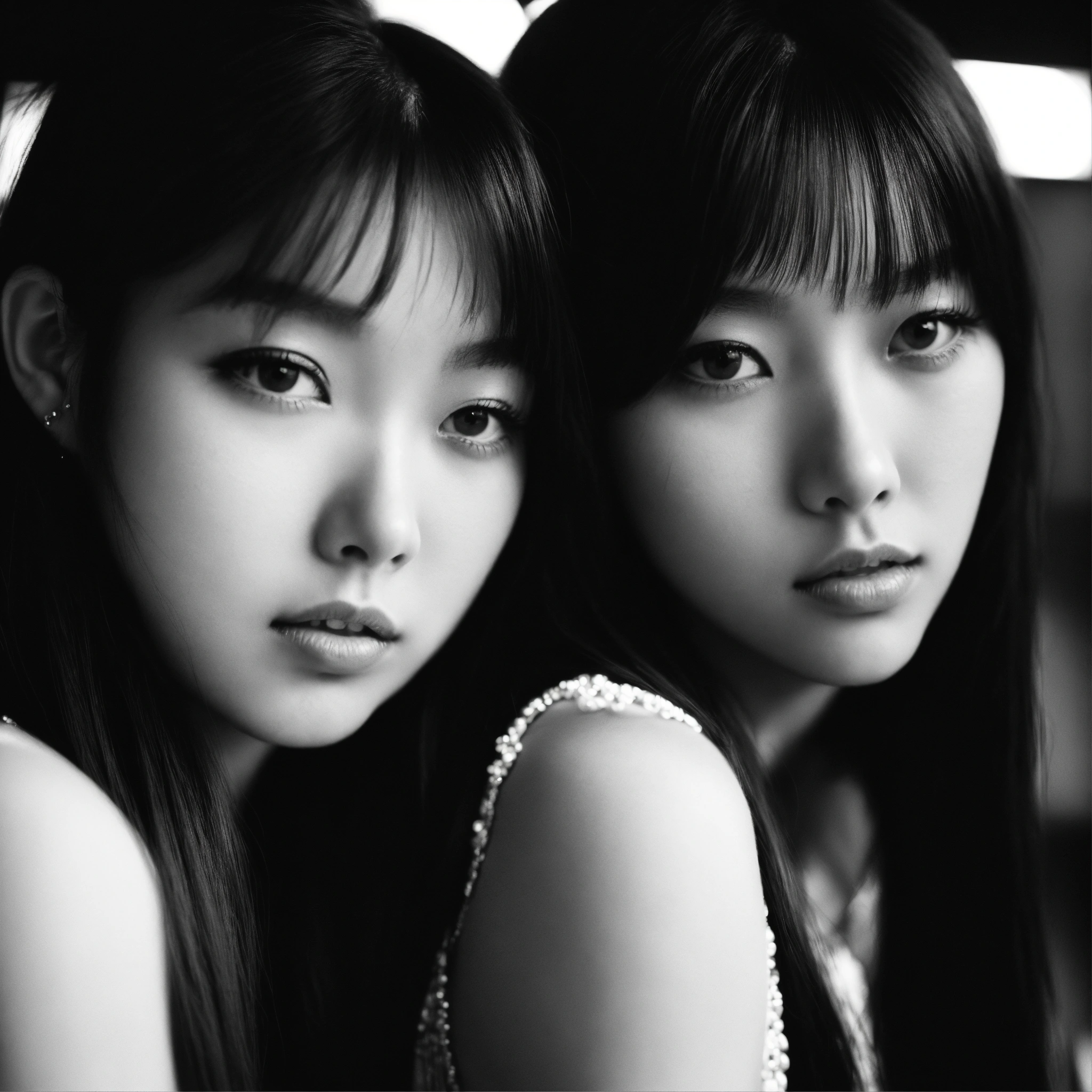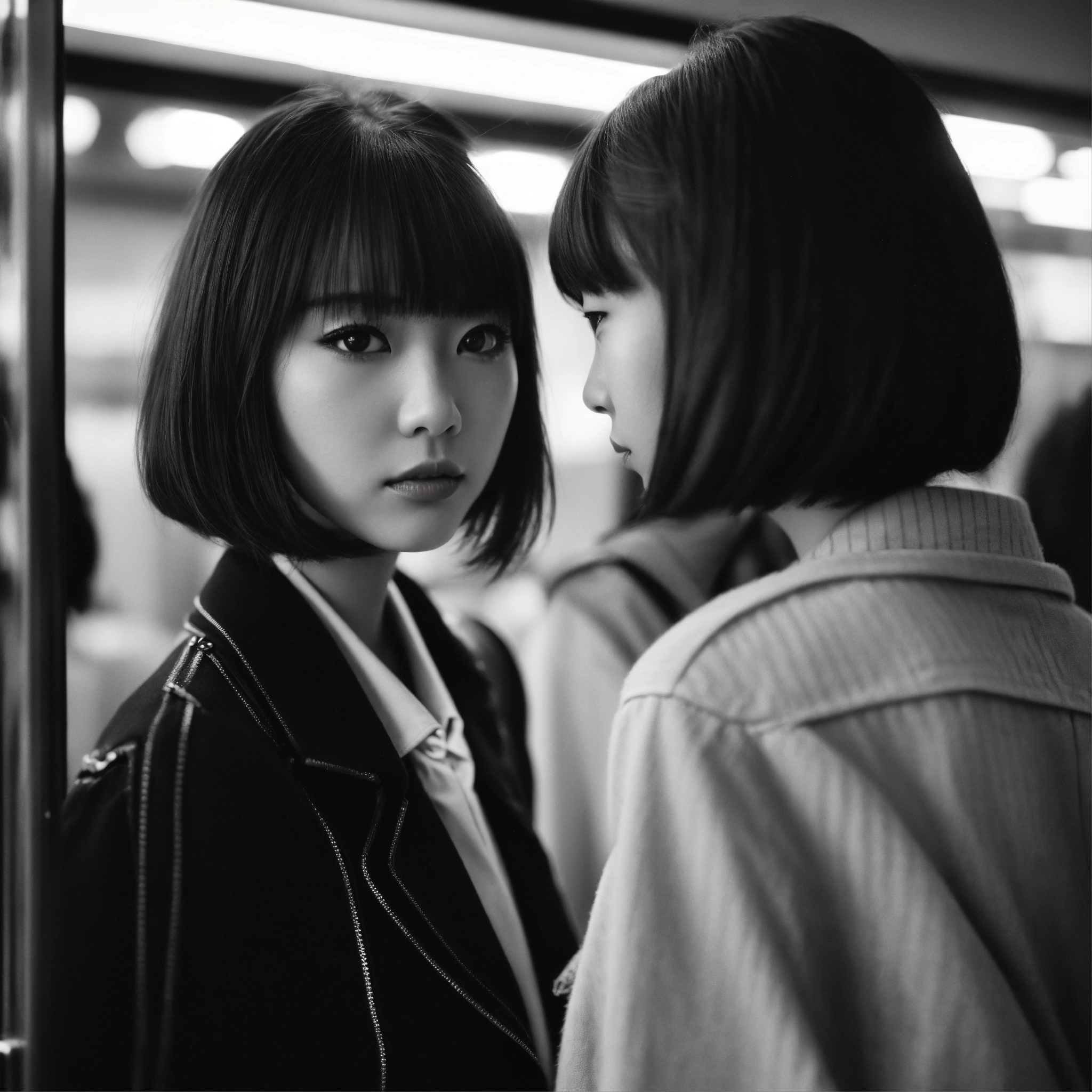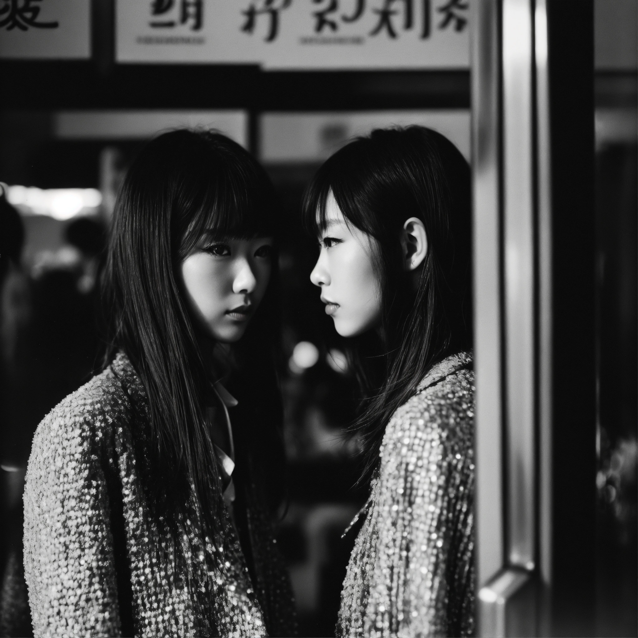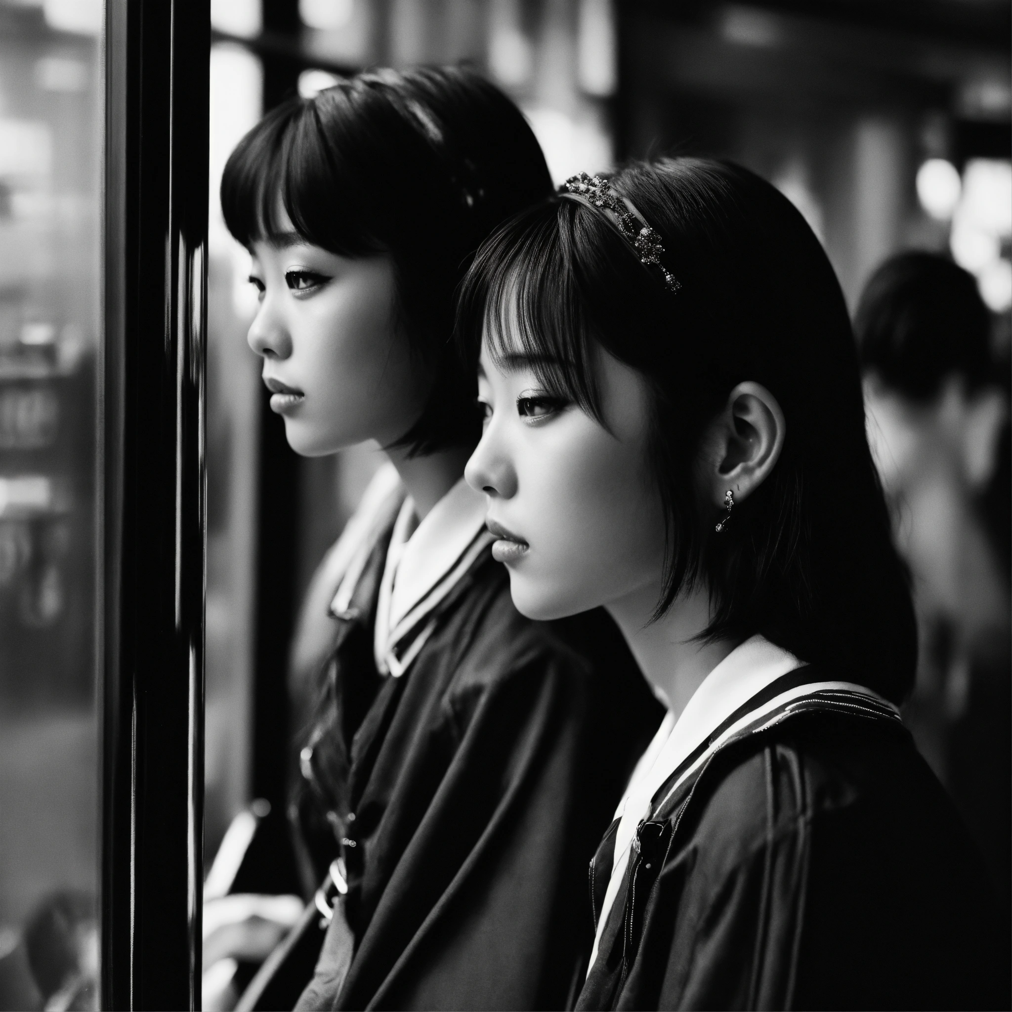 Extremely detailed photographic image, grained image, beautifully composed, monochrome image, 00's fashionable image, fashionable magazine photography, leica summicron 35mm f2.0, kodak 400tx, fashion photography, fashionable model, two beautiful japanese kawaii high school girls with close to face to face across the glass without any intimacy