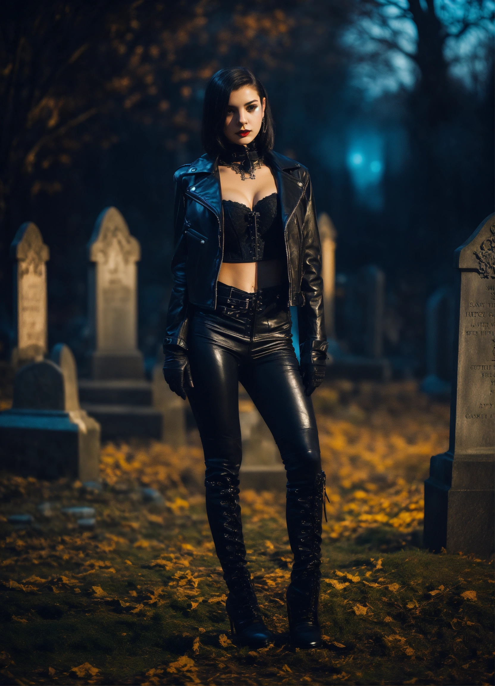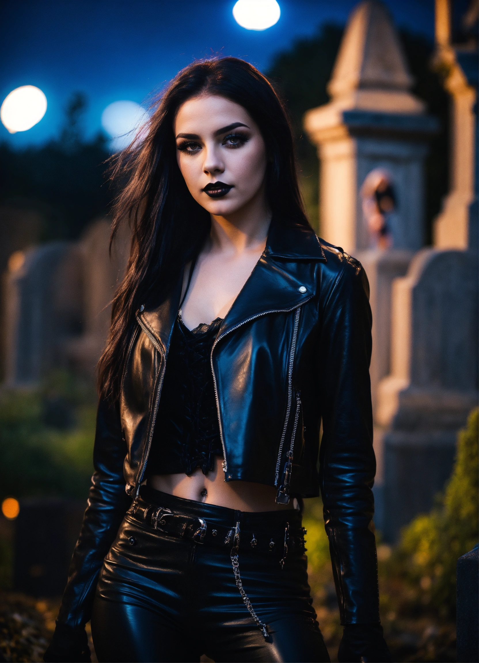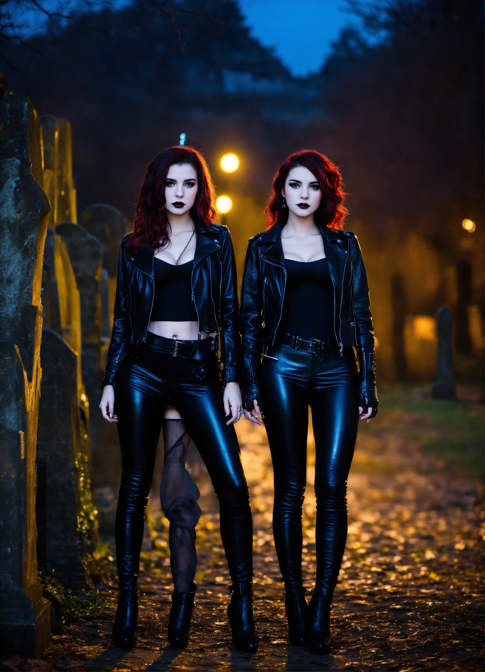 Three stunning young gothic girls posing in the graveyard, wearing a black leather jackets and black leather pants or black leather miniskirts corsets, black leather gloves, hyper-realistic, photographic portrait, bokeh at night