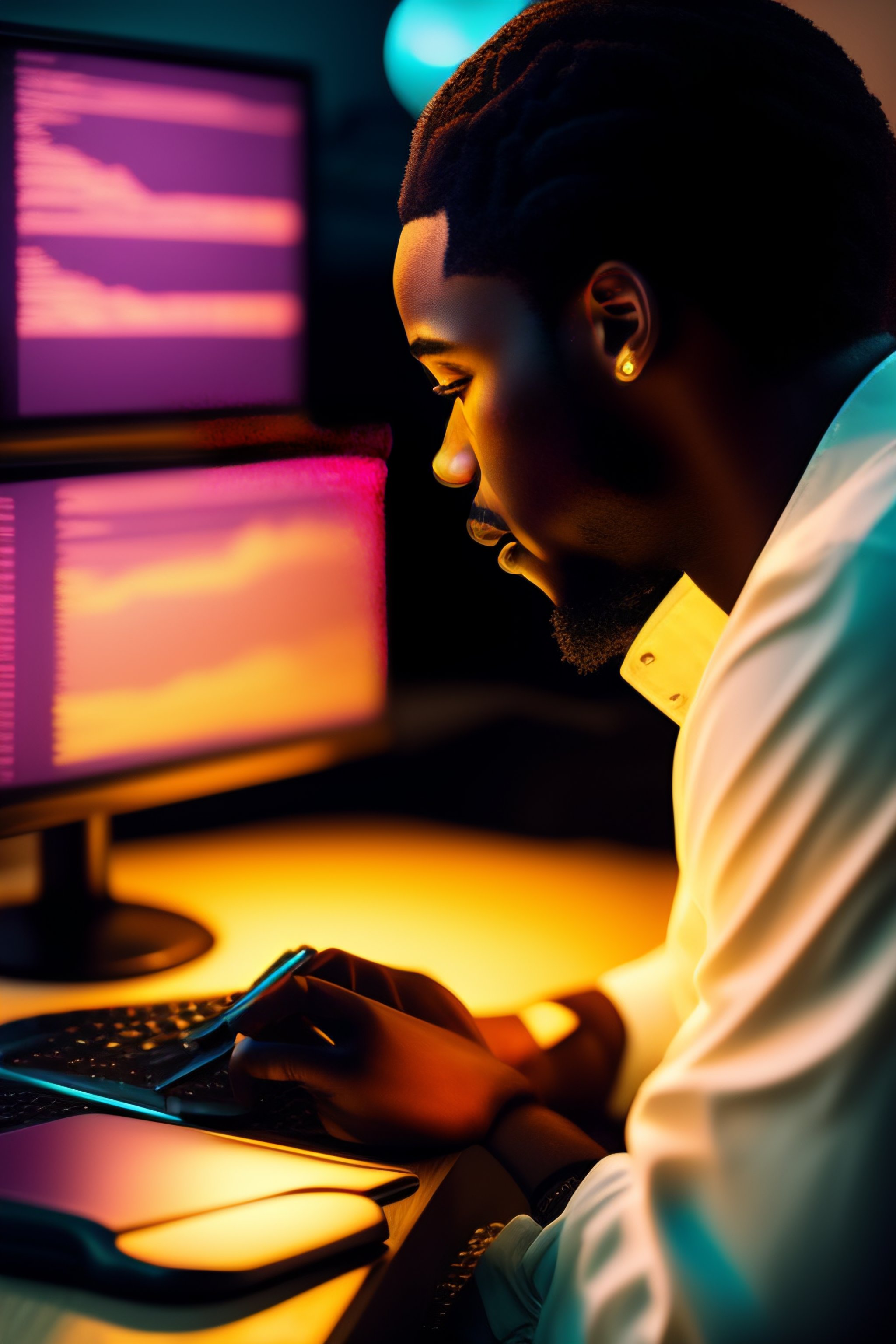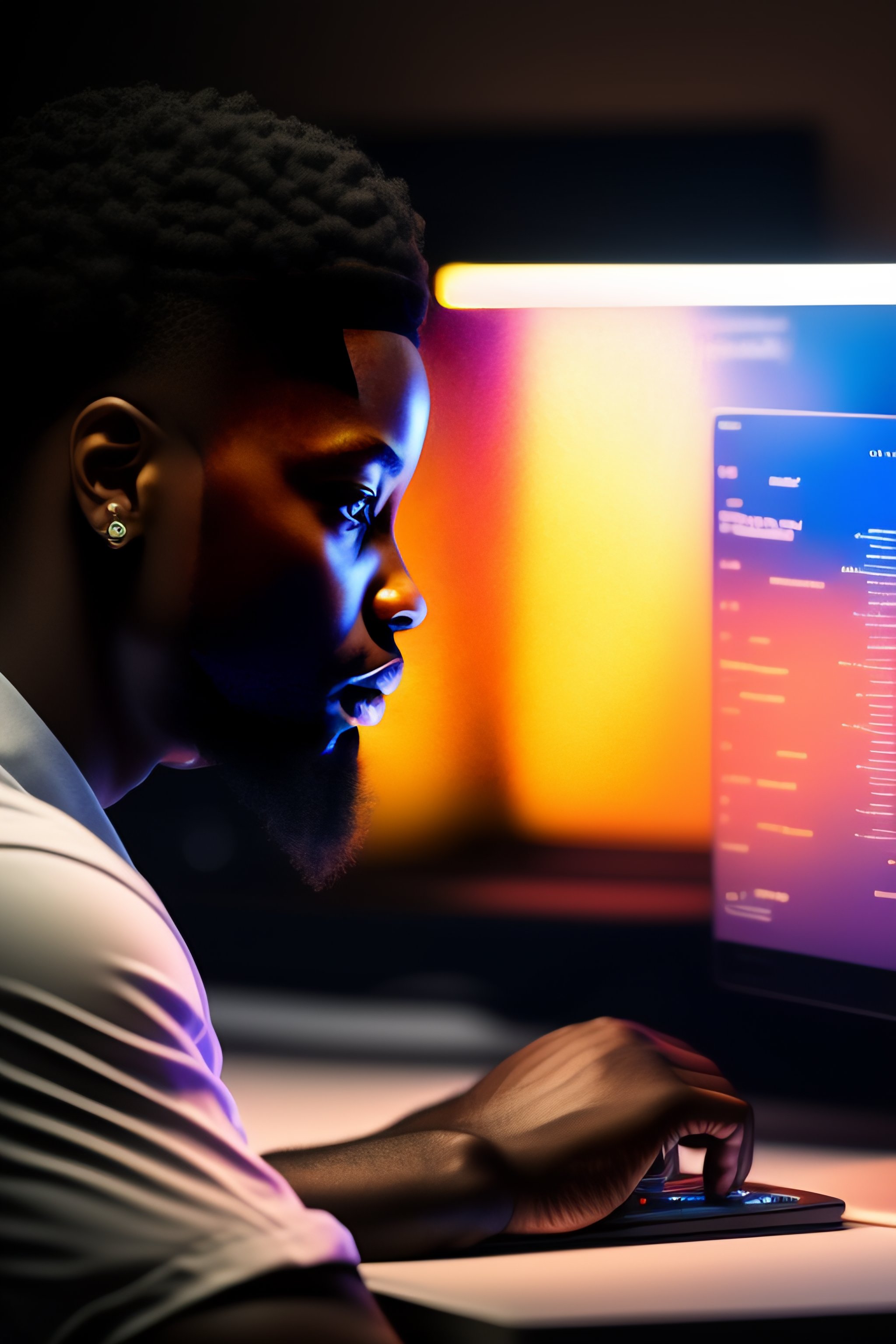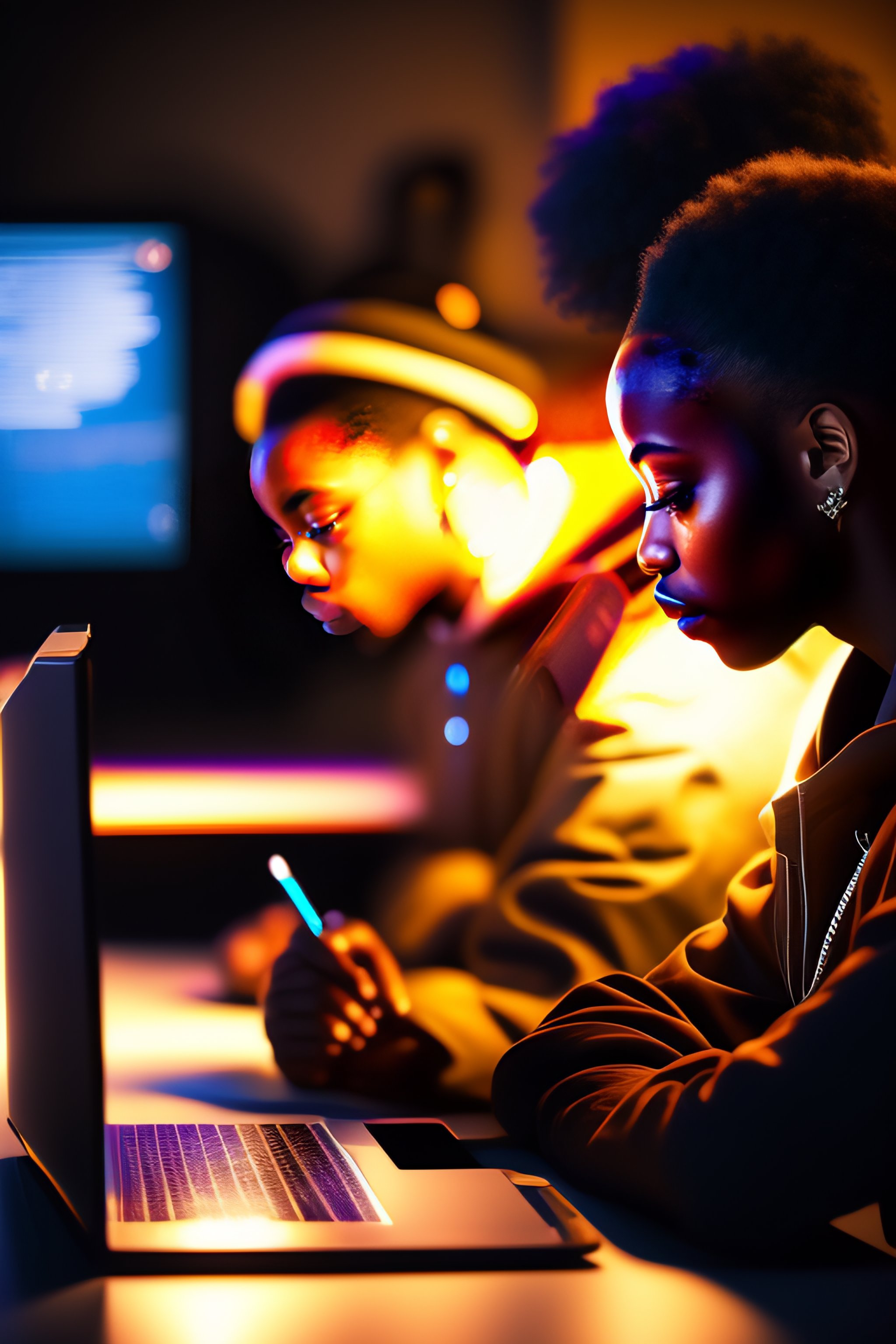 5 black people writing code on laptops in a dimly lit room at night, computer screens illuminate their faces