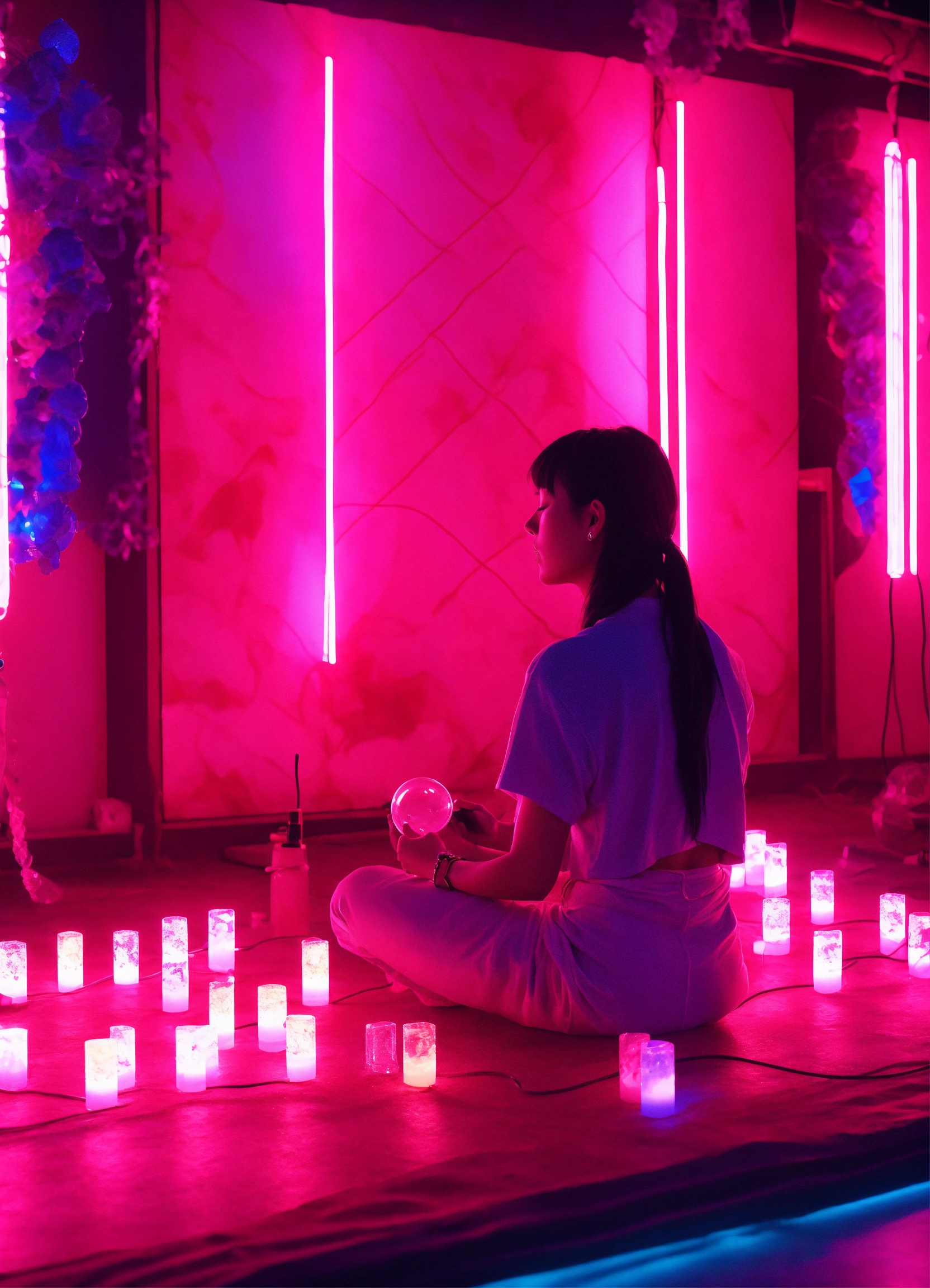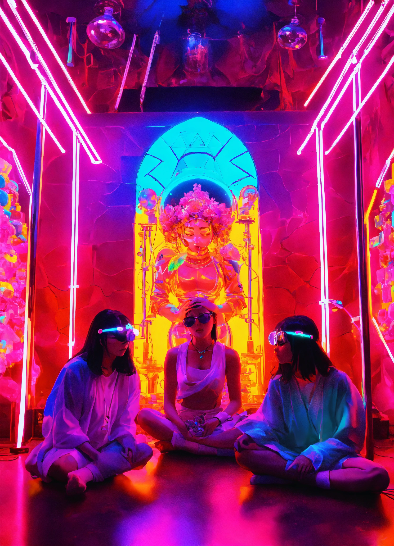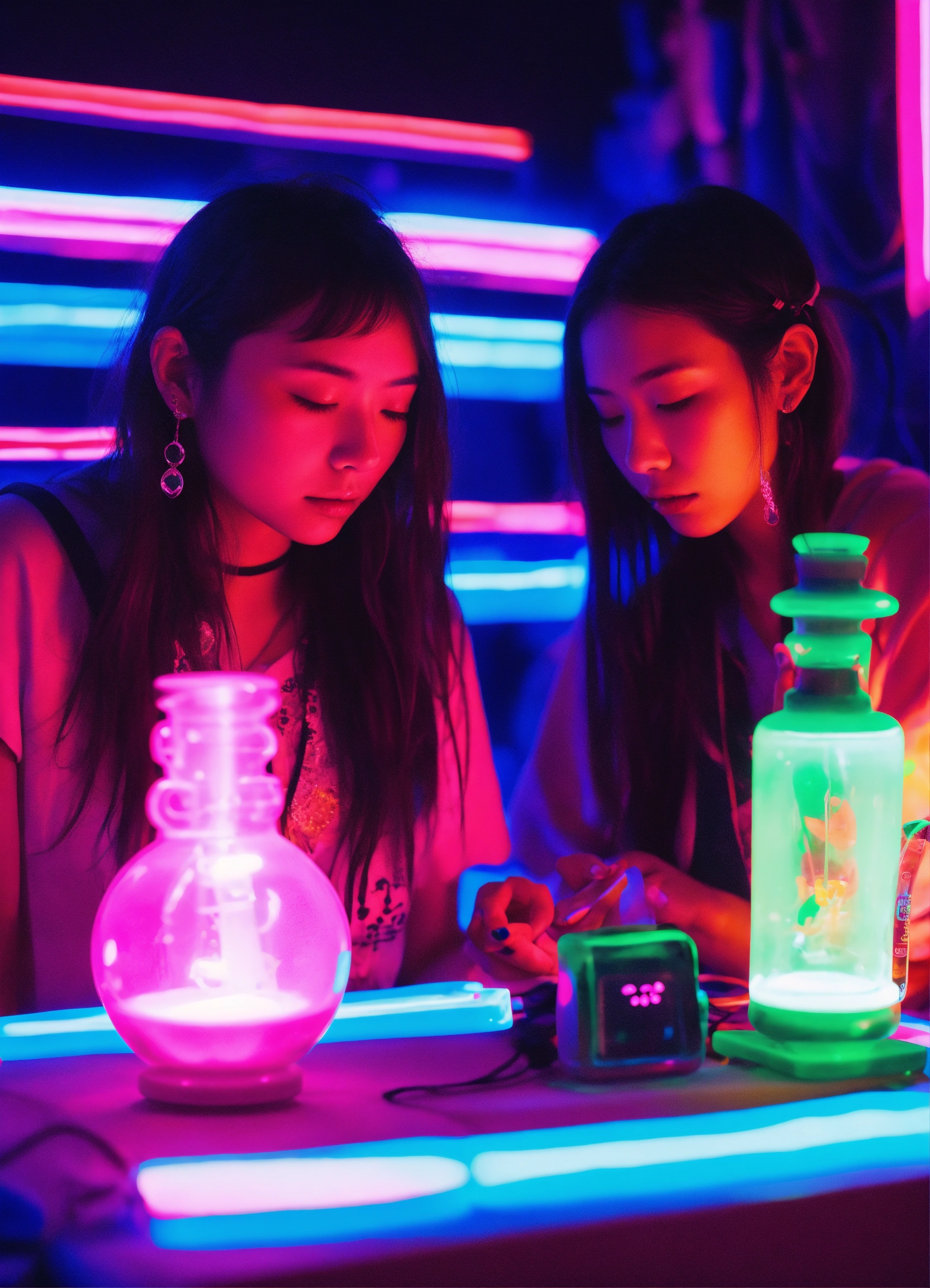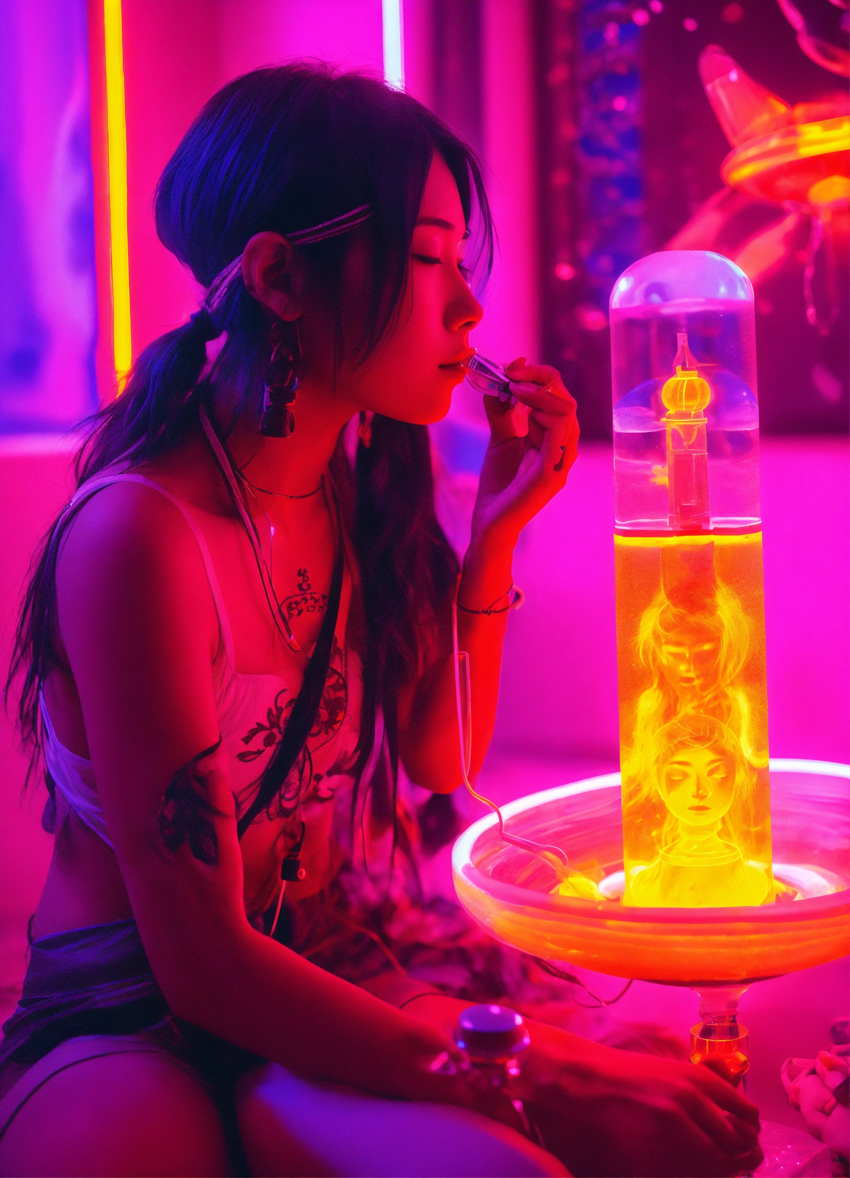 Photorealistic a female tokyo festival raver quartz twosome meditating deeply in quartz bongs in a neon room experiencing quartz neon ascension
