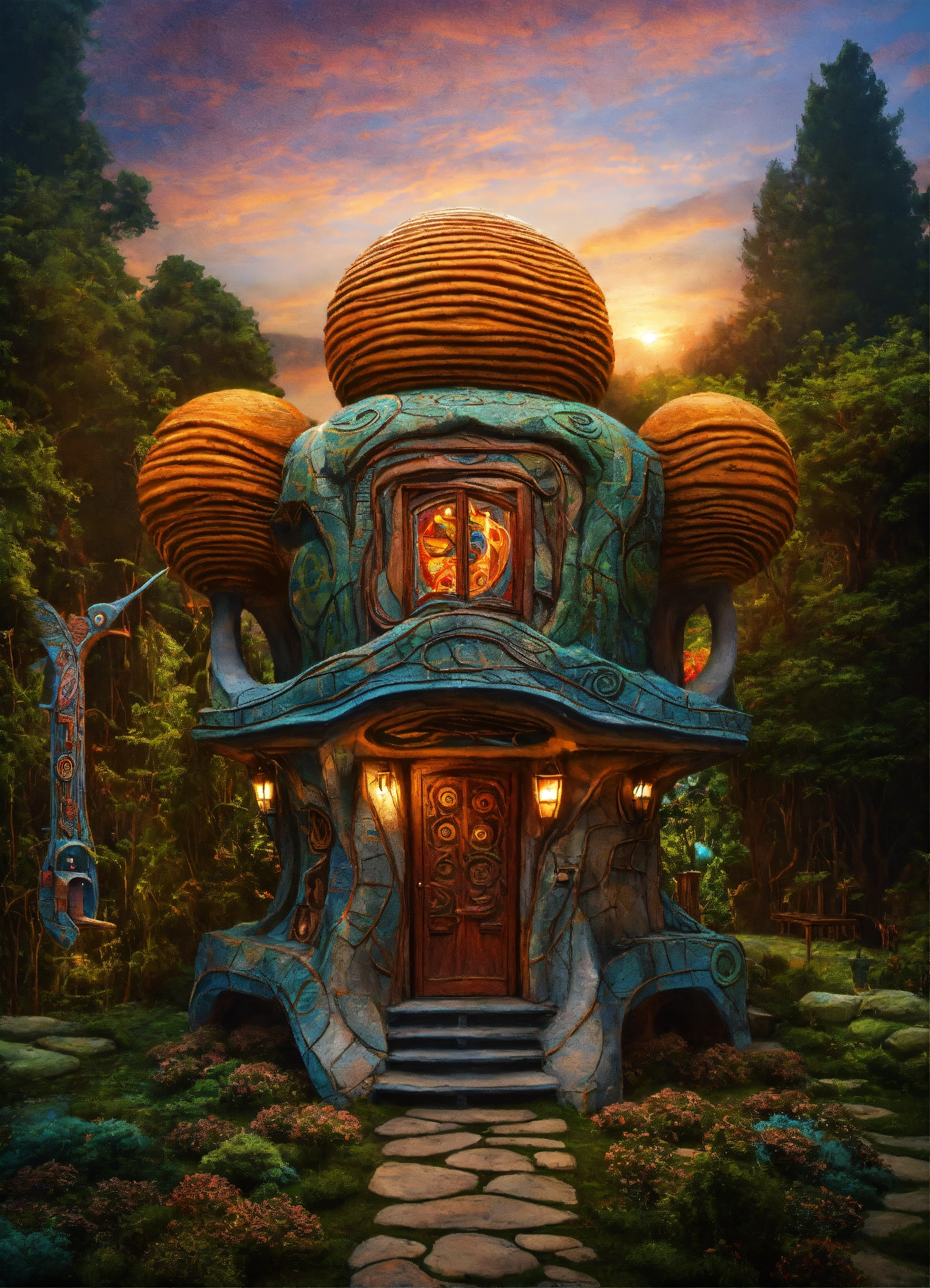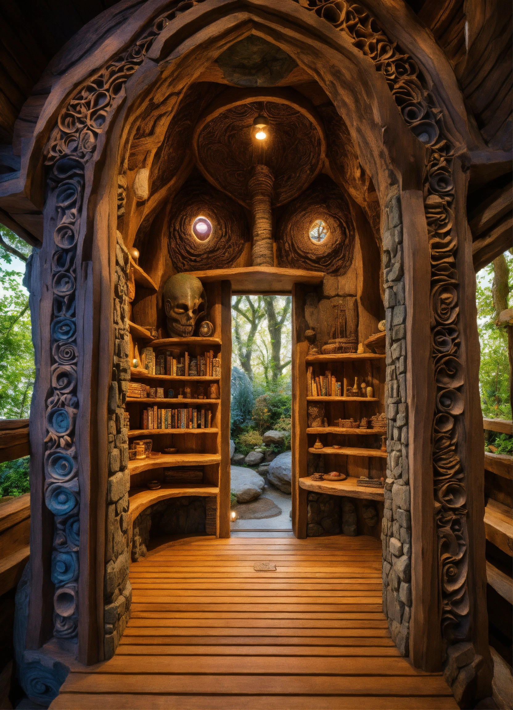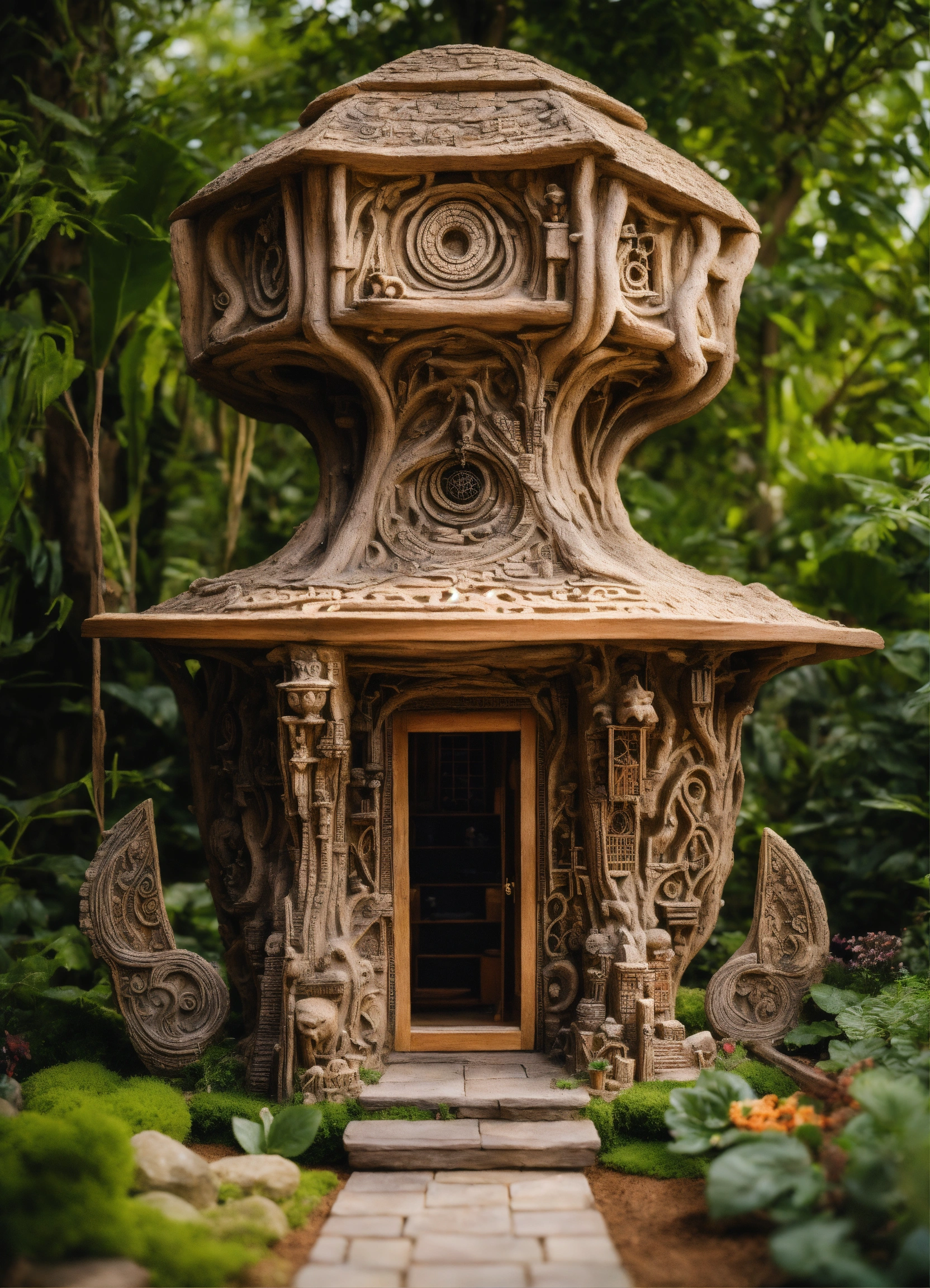 An ancient wood and stone hand made meditative garden sculptured tiny house in the style of alex grey, lsd, dmt, giger