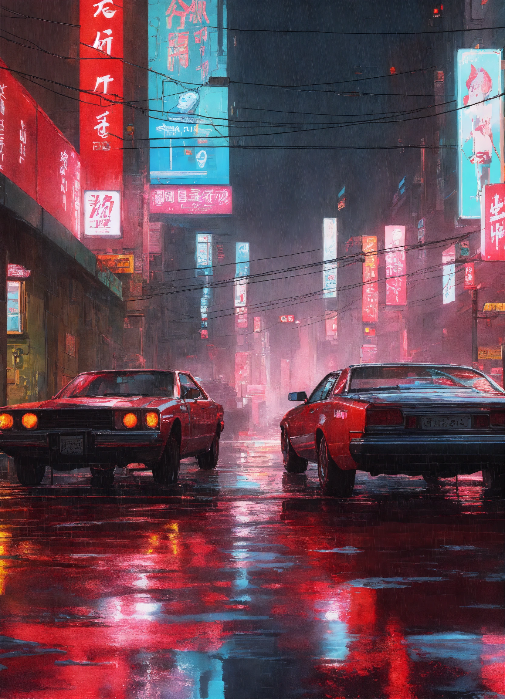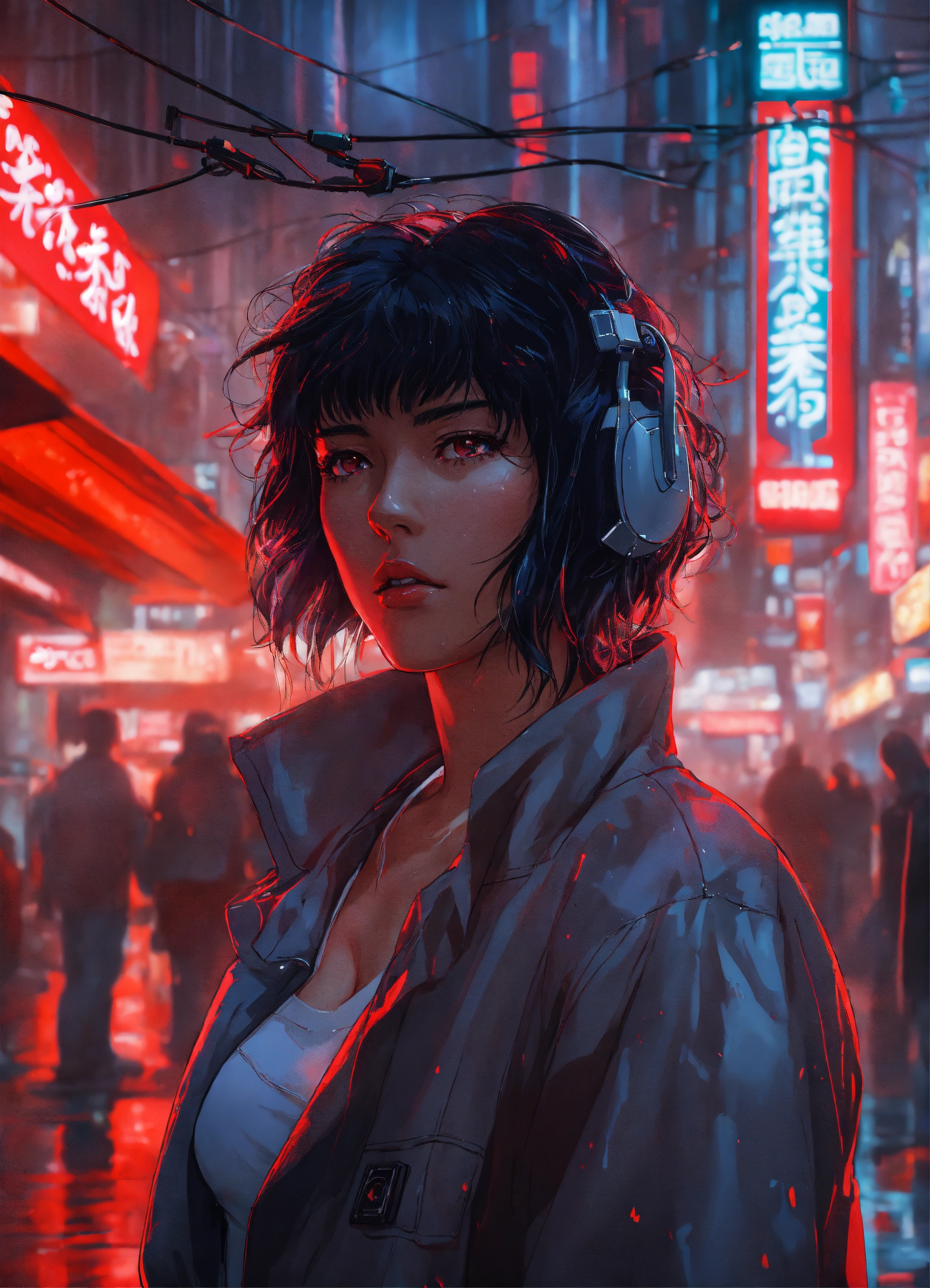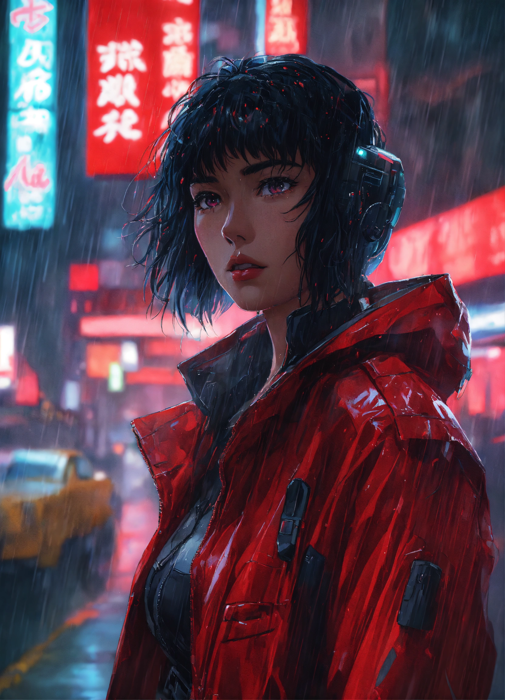 Anime art of ghost in the shell, detailed scene, red, perfect face, intricately detailed photorealism, trending on artstation, neon lights, rainy day, ray-traced environment, vintage 90's anime artwork.