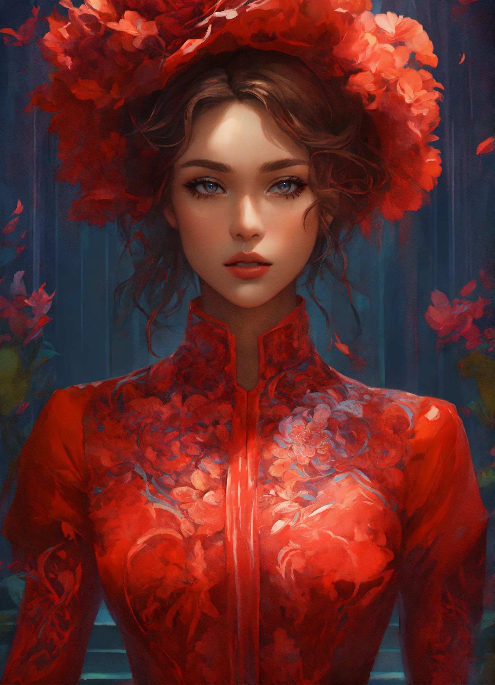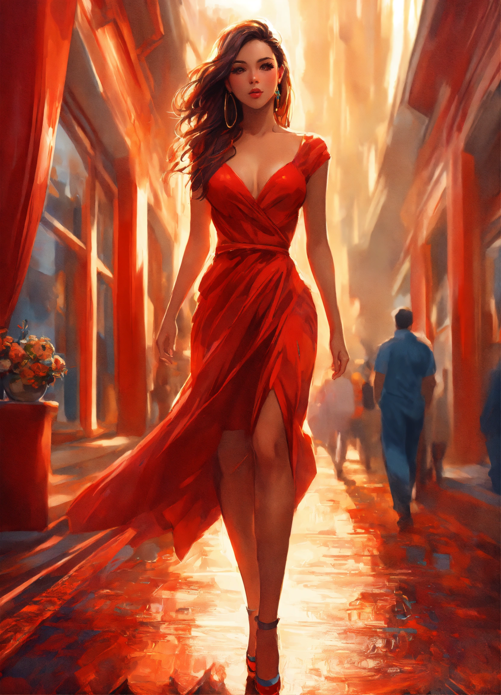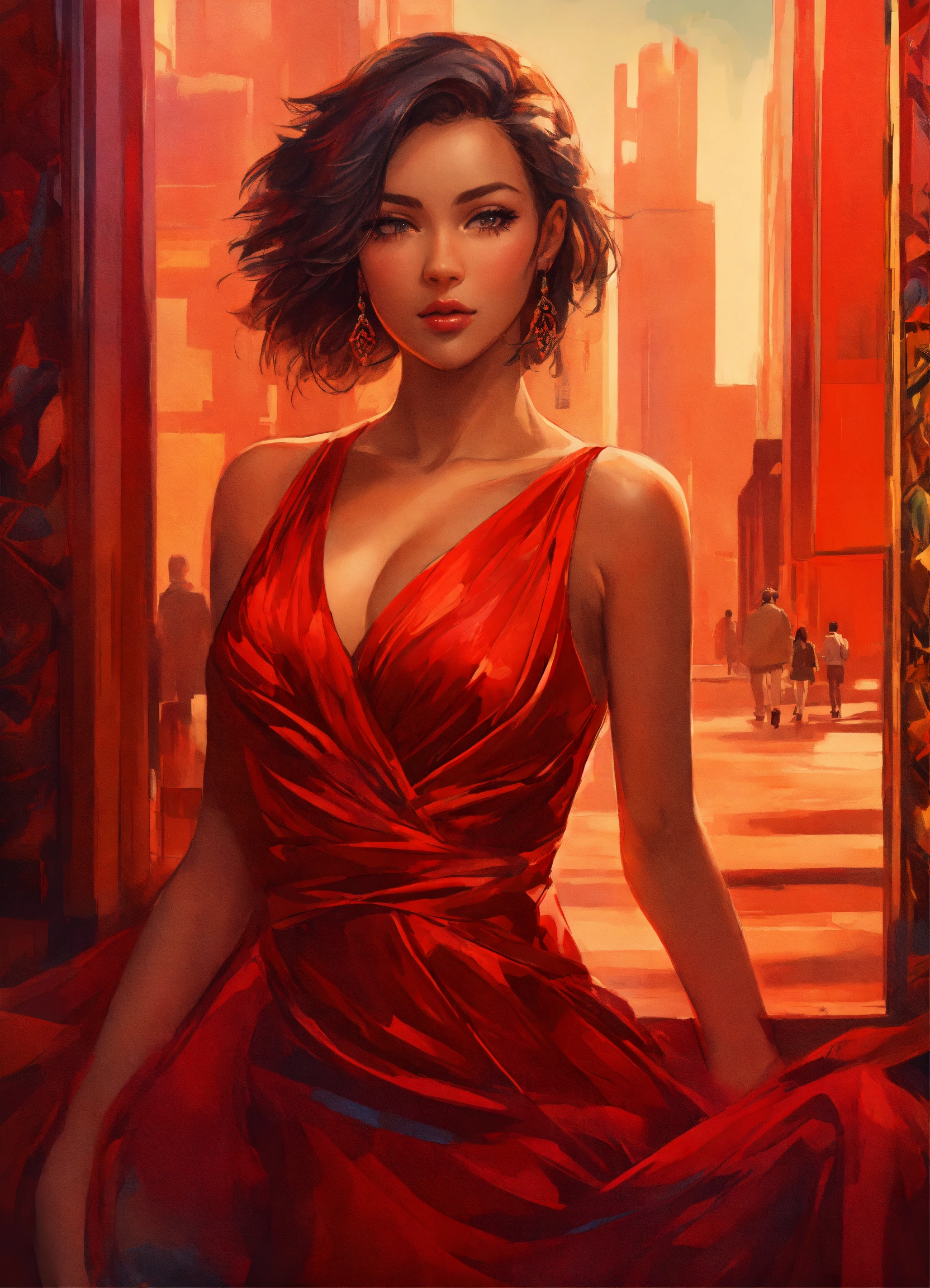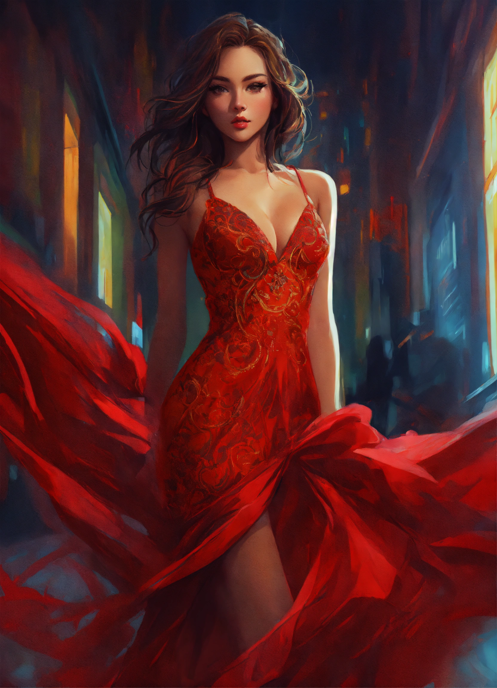 Hyper detailed ultra sharp, vibrant, intricate, digital painting, concept art, smooth, sharp focus, illustration, hot, looking into the camera, women, red dress