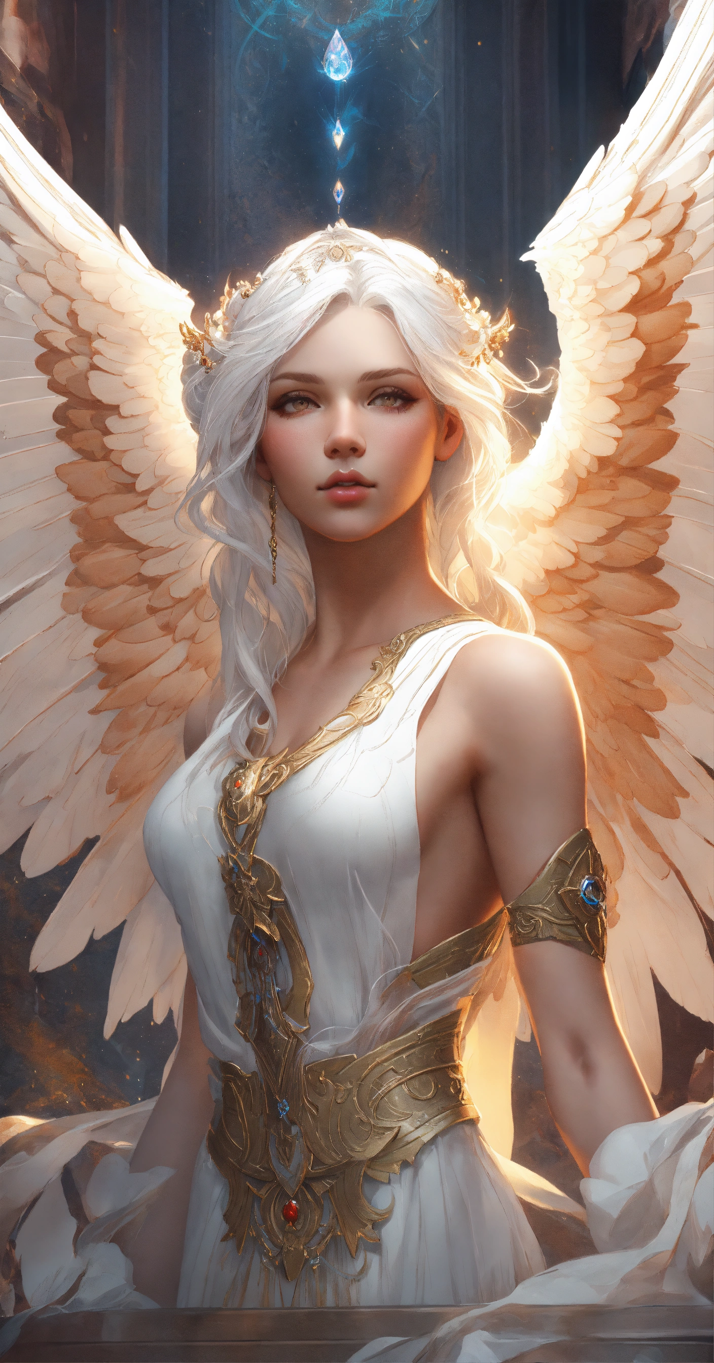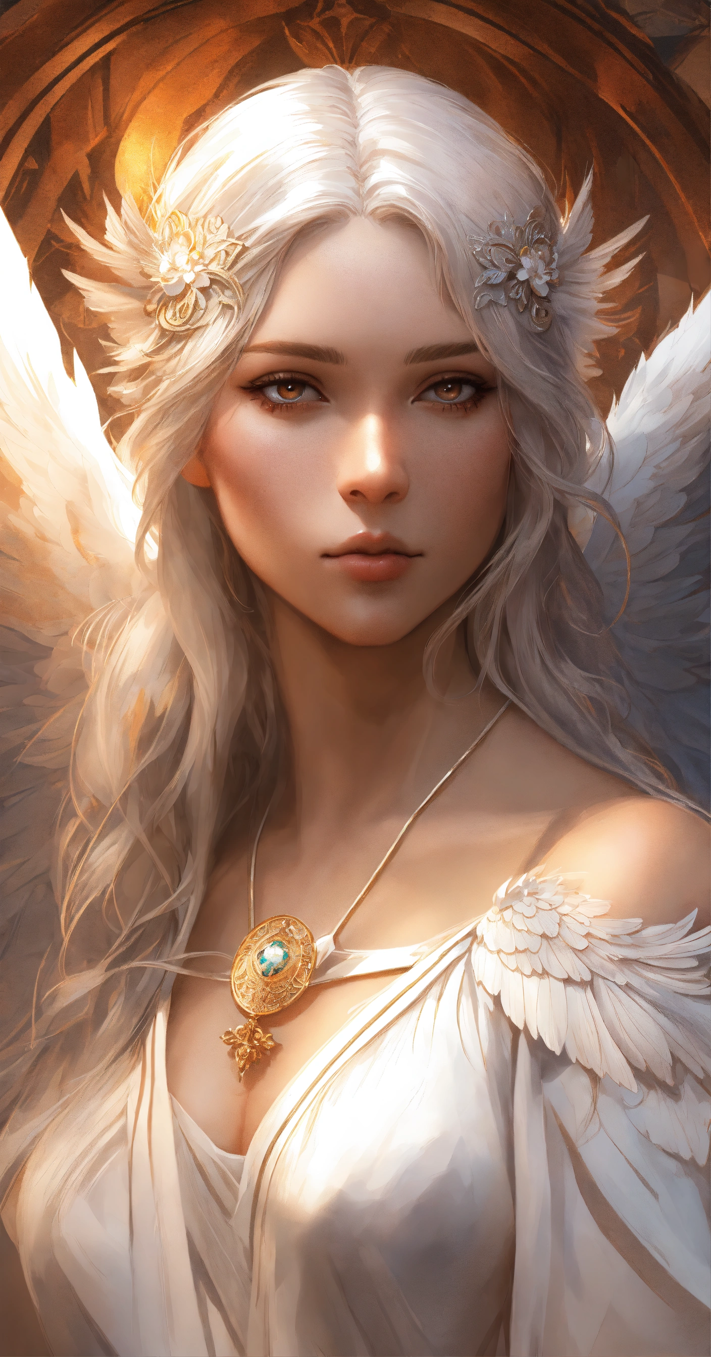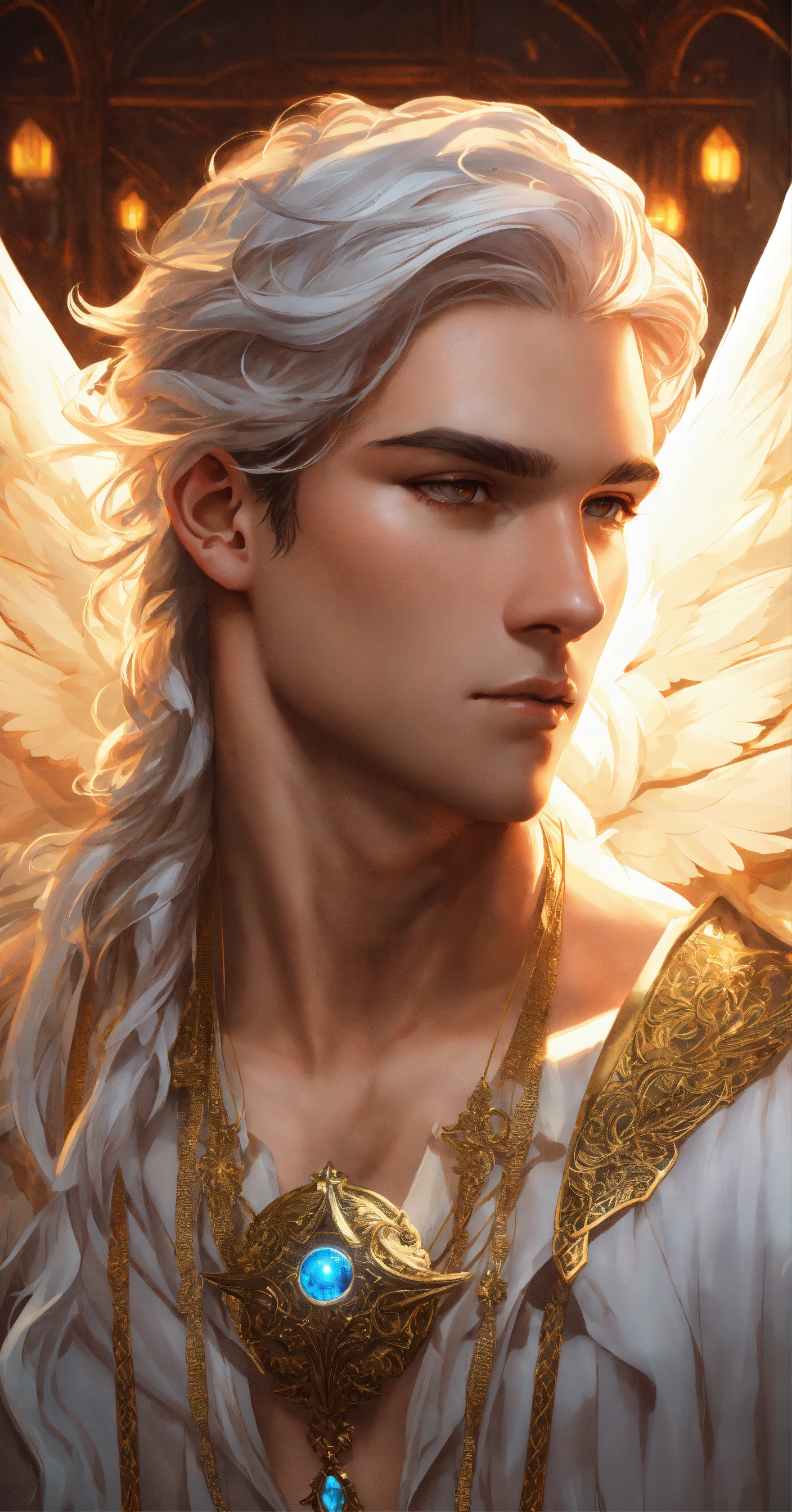 Men angel, wings, intricate, headshot, highly detailed, digital painting, art station, real, 3d, large full white wings, white hair, white eyes and deep gaze, jewel in third eye, mystical, sharp focus, cinematic lighting, 8k, illustration, art by artgerm and greg rutkowski, alphonse mucha, cgsociety