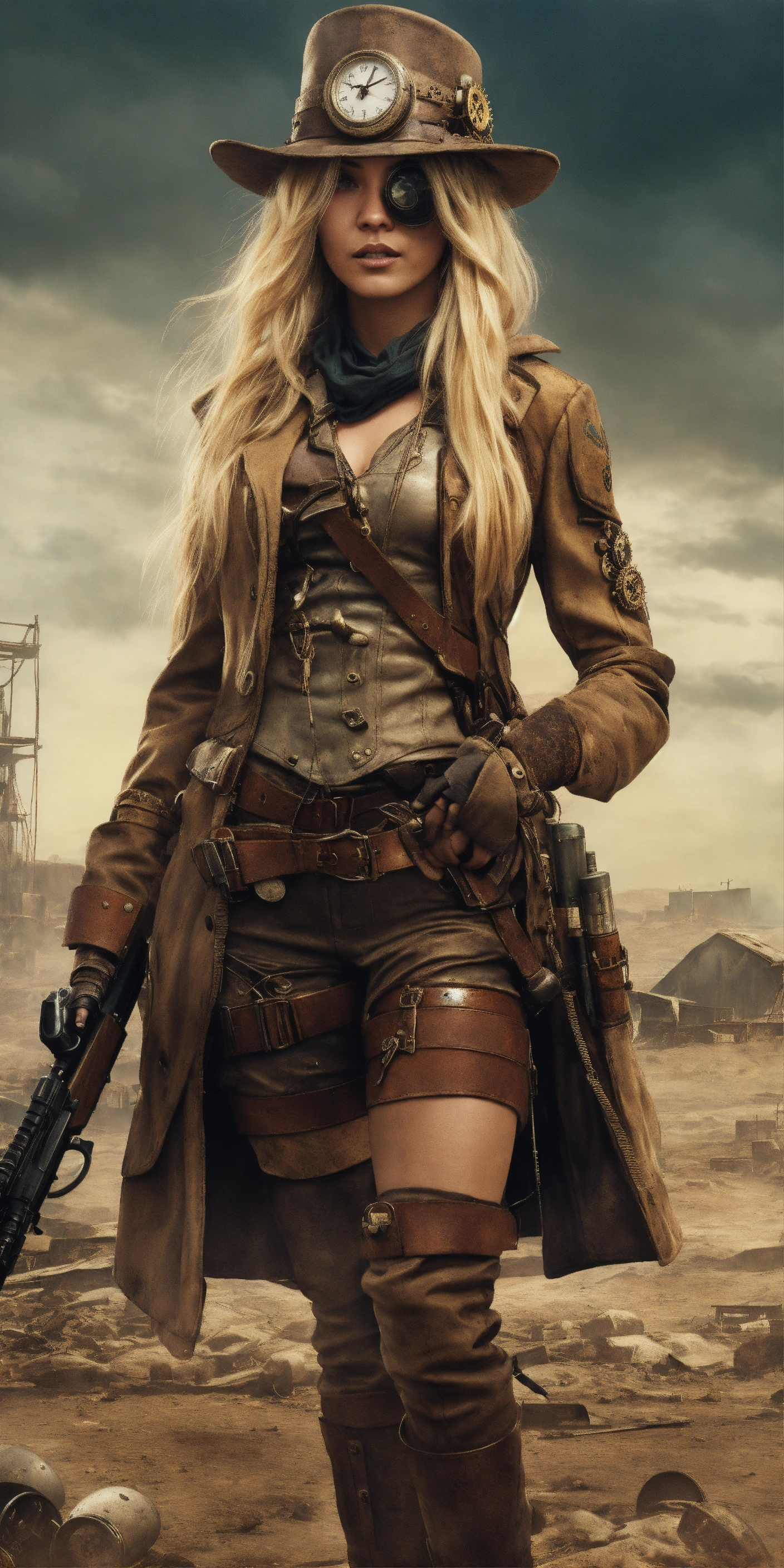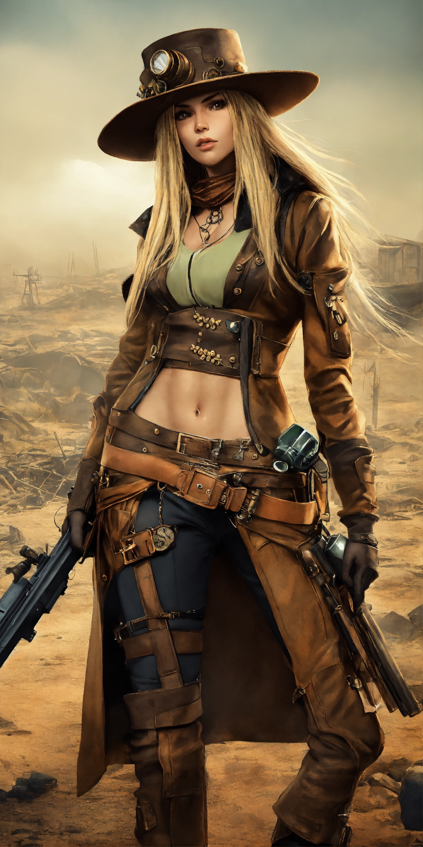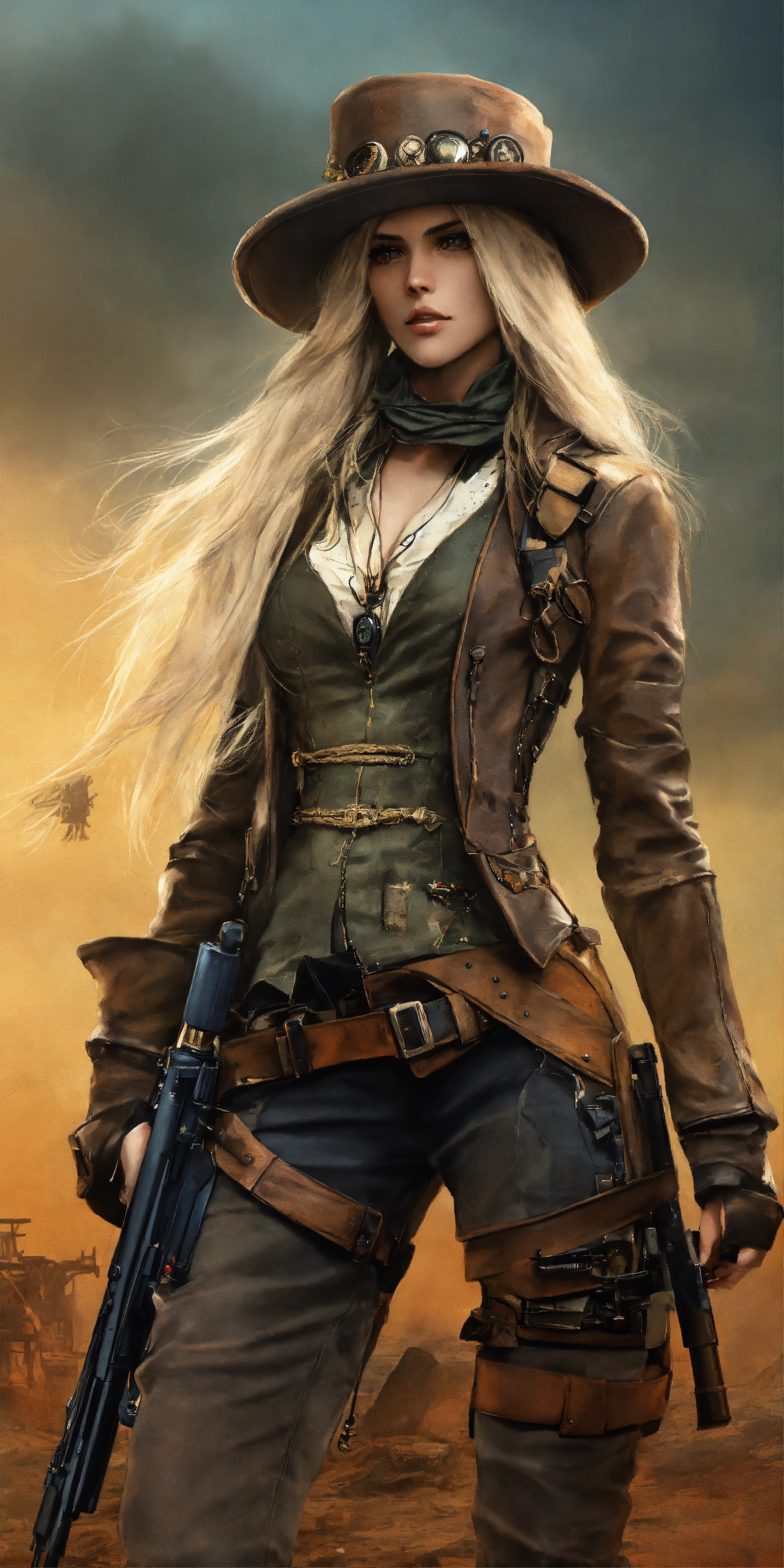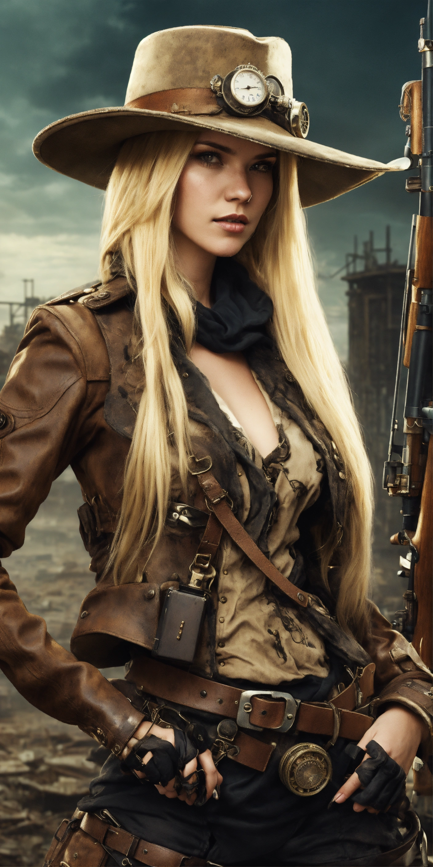 A female sniper bandit with long blond hair with hat in a farwest steampunk outfit in a post-apocalyptic wasteland