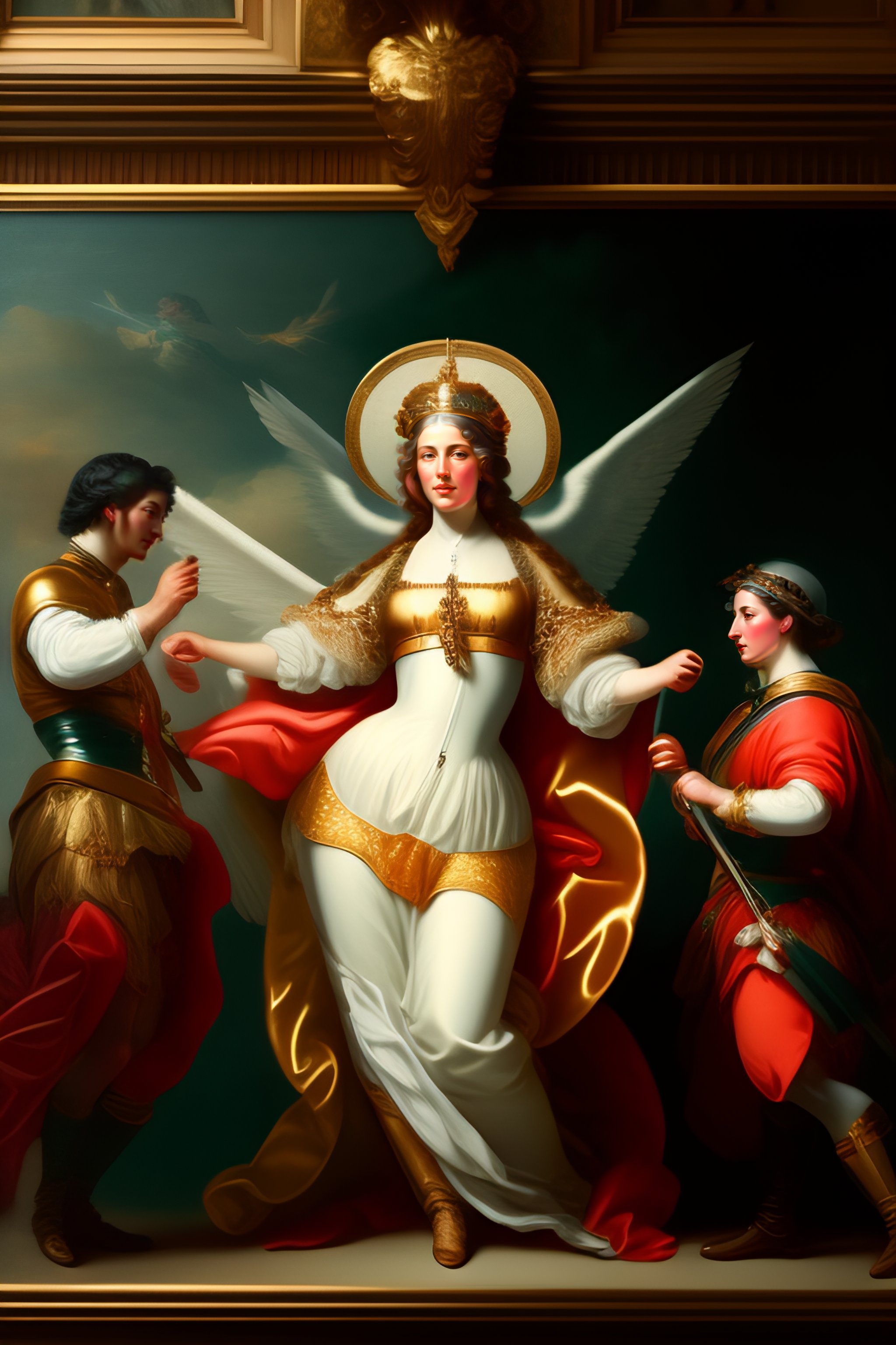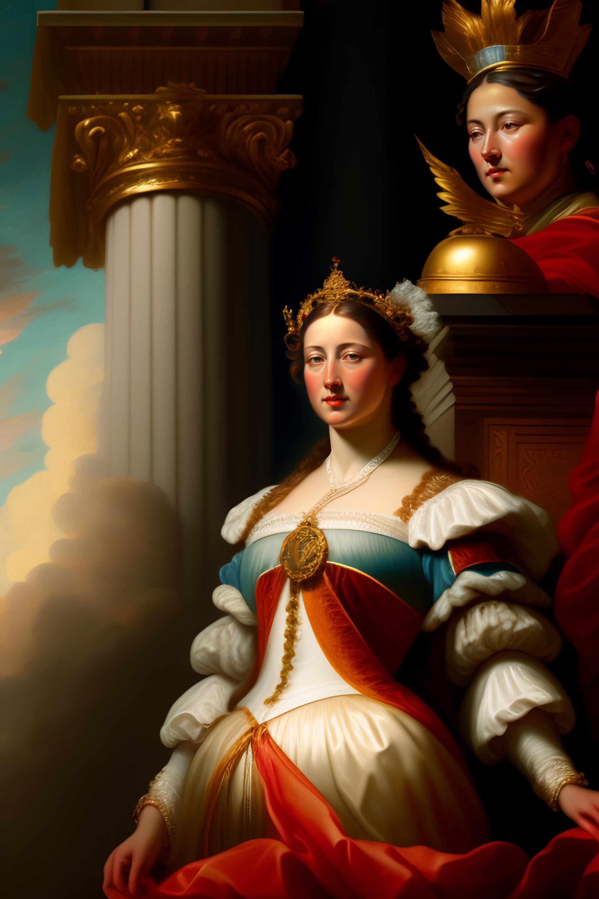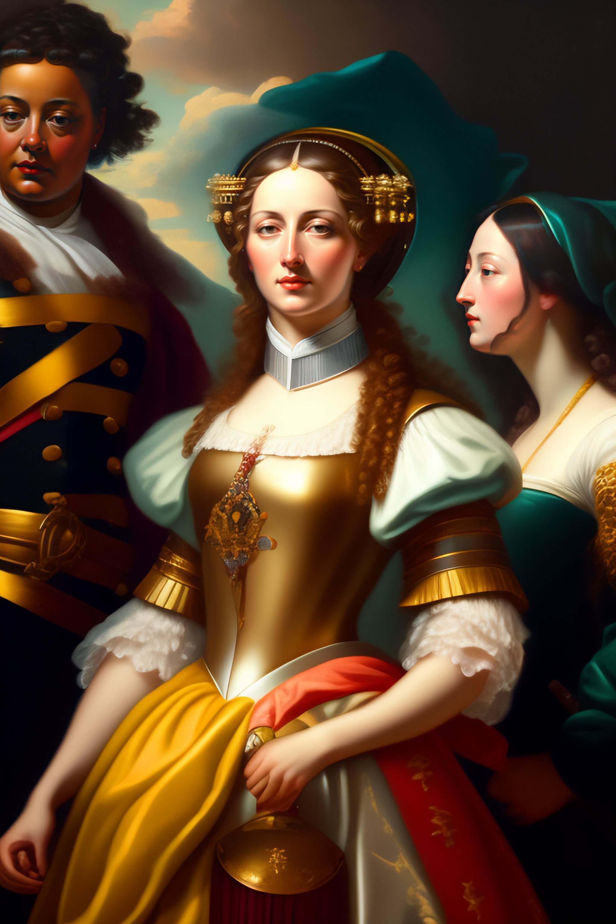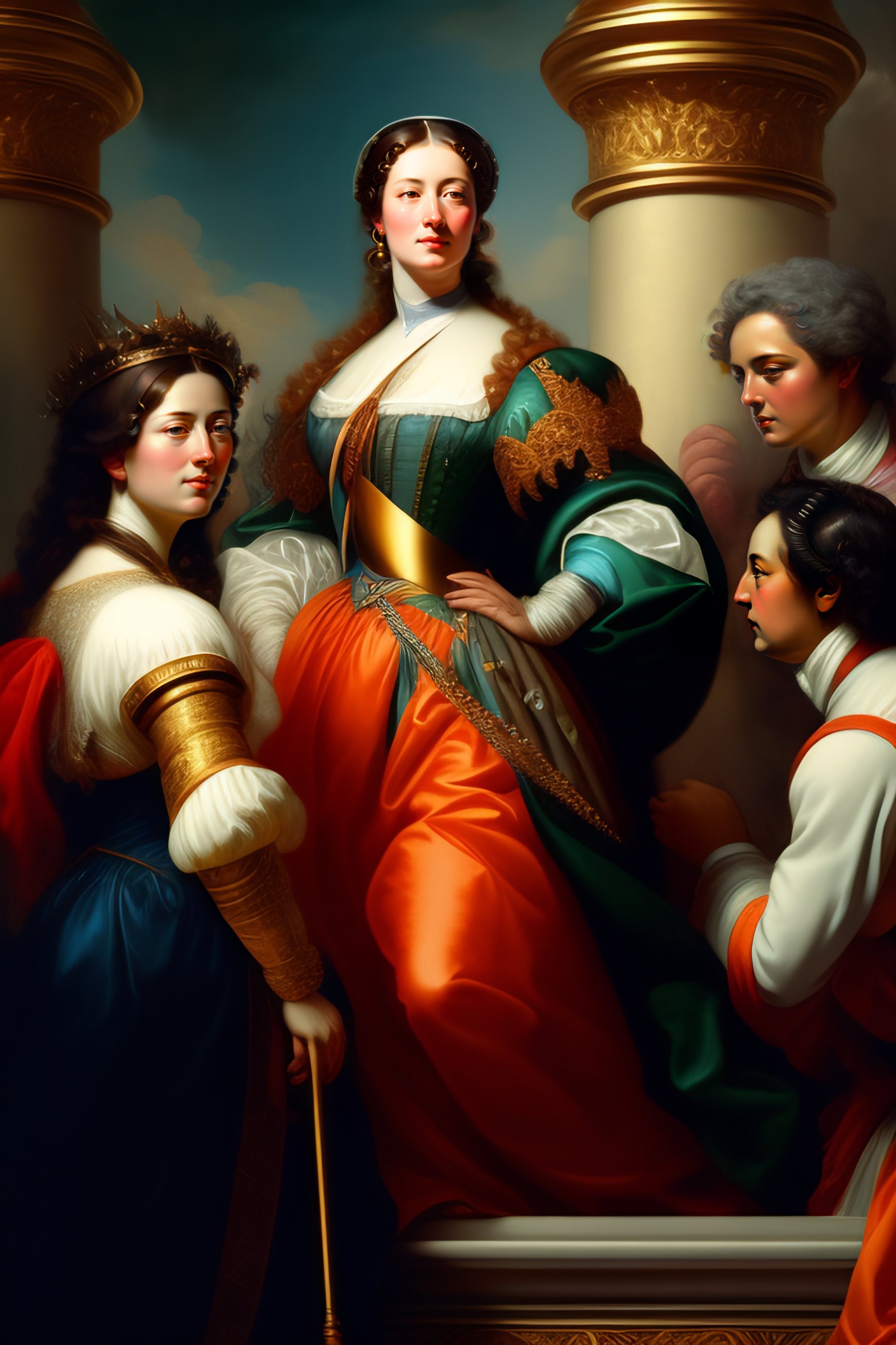 A painting of a woman surrounded by other people, inspired by sebastiano ricci, renaissance, joan of arc, 1128x191 resolution, guanyin of the southern seas, martyrdom, queen victoria, murals, no watermarks, bottom angle, baroque object, 1840580735