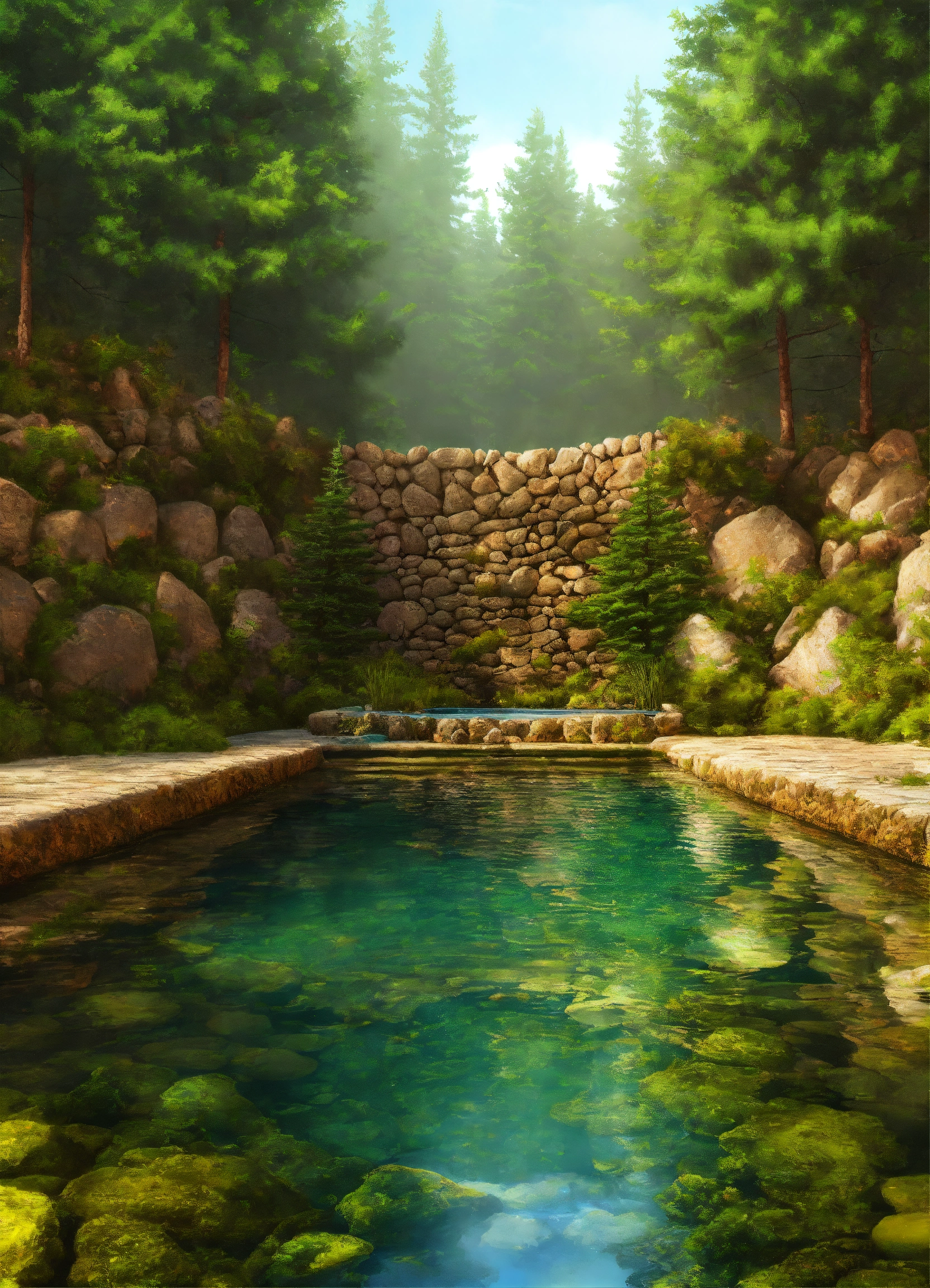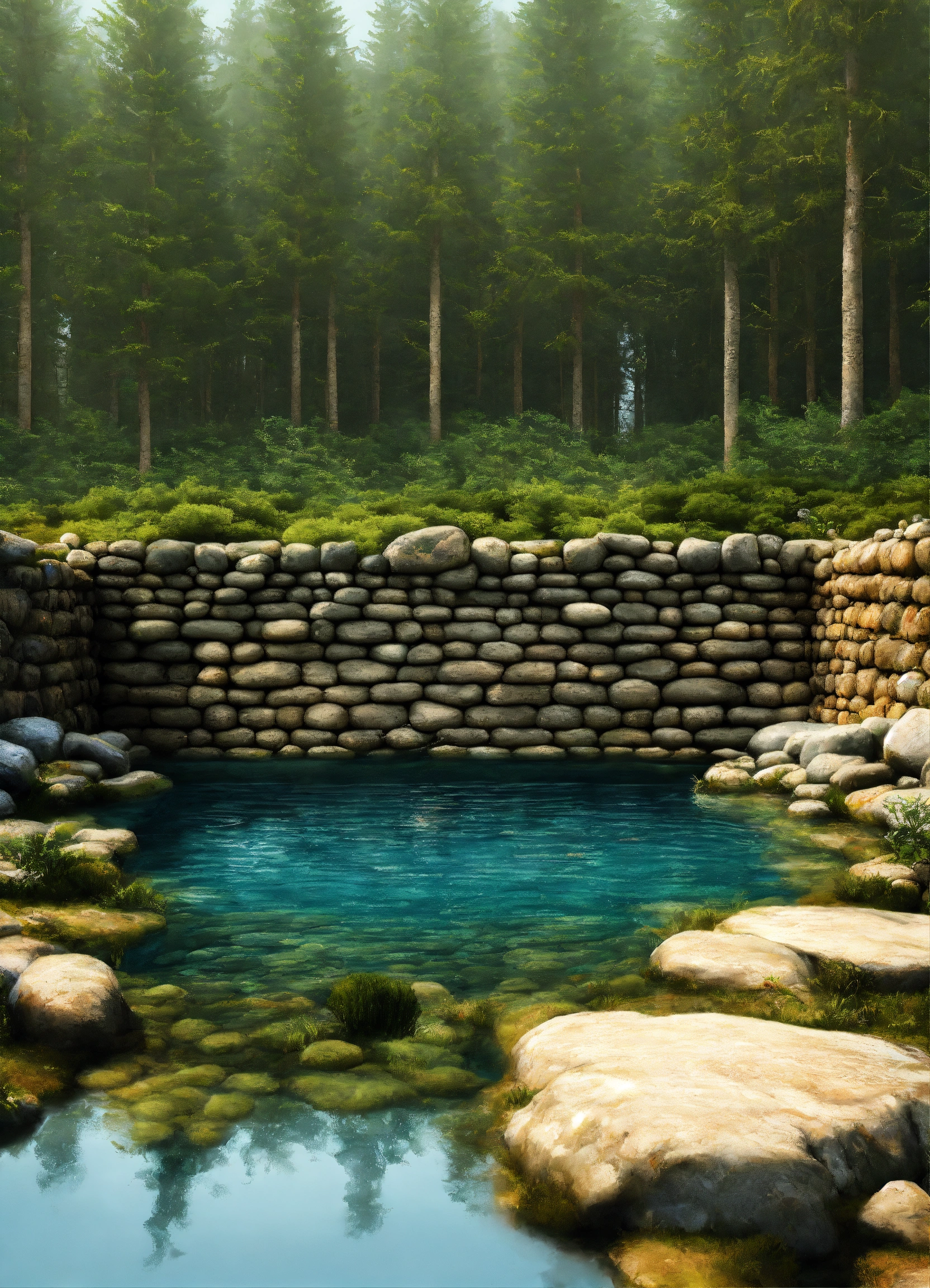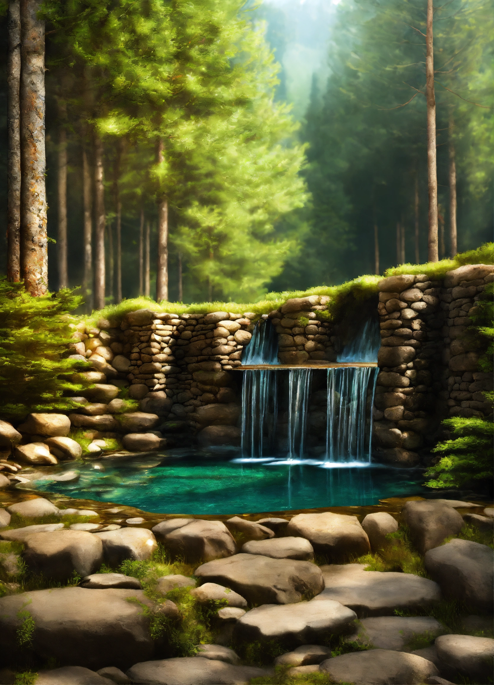 Very high stone wall in fir tree forest with small pool of water in front in digital art