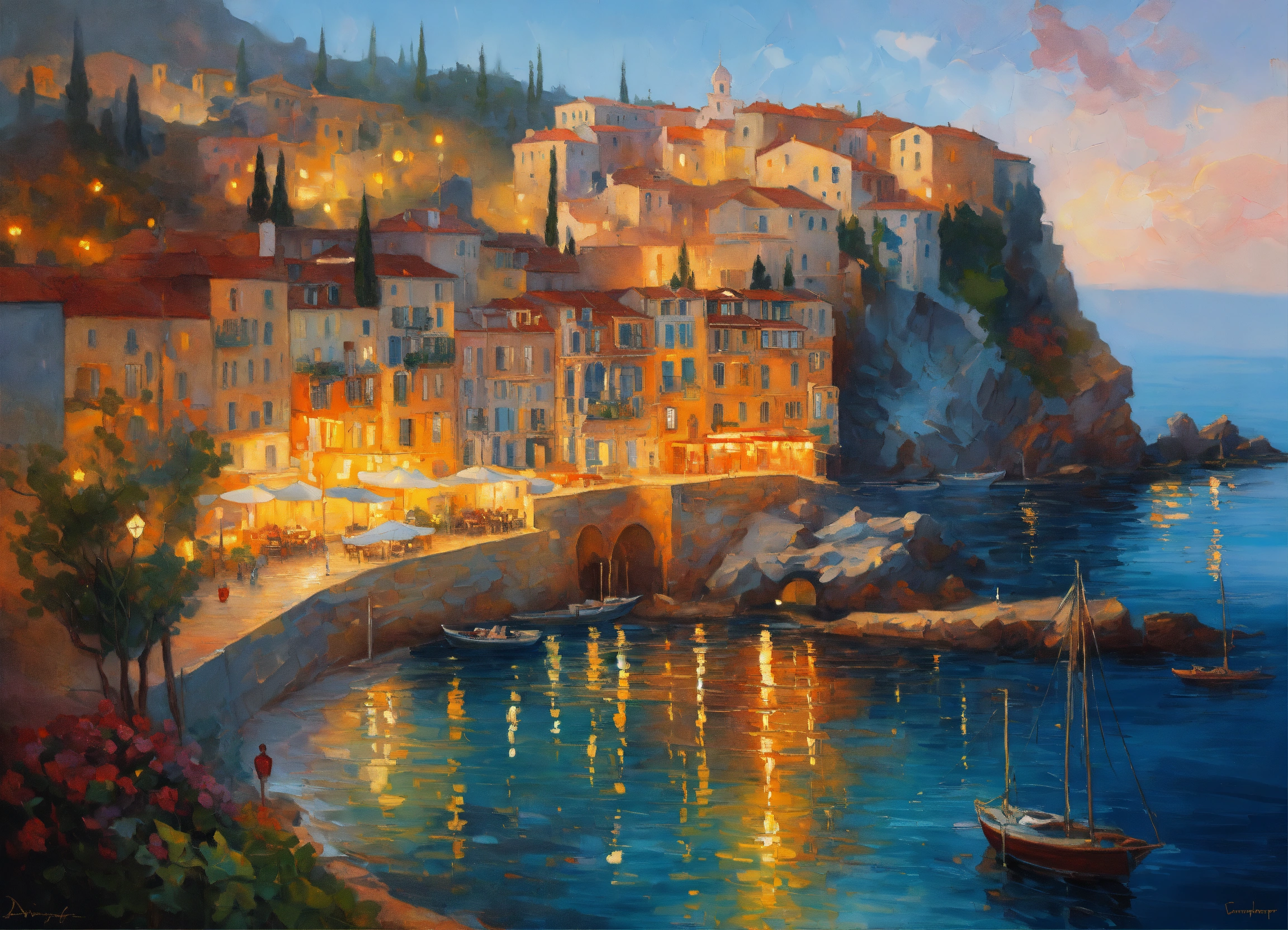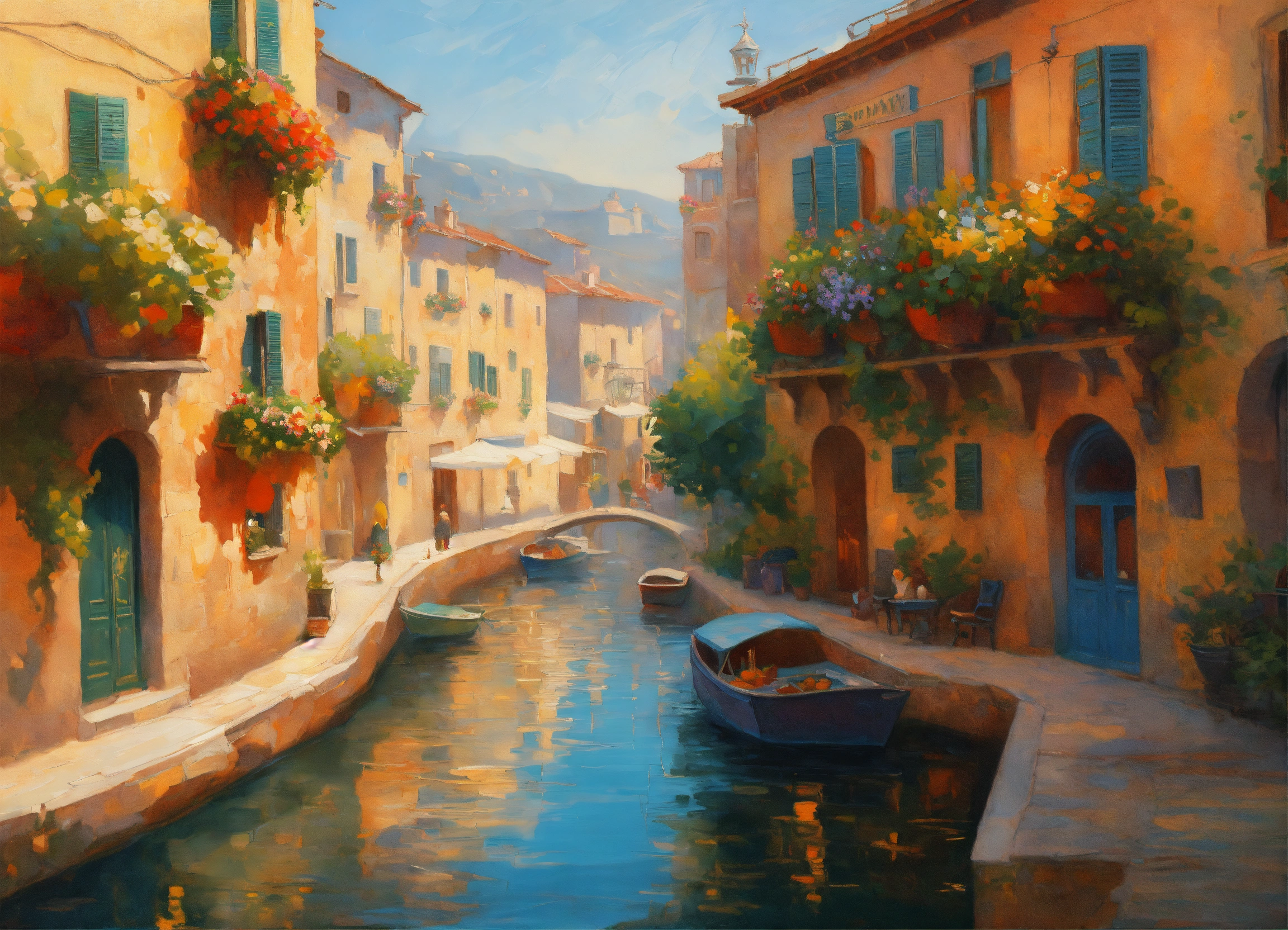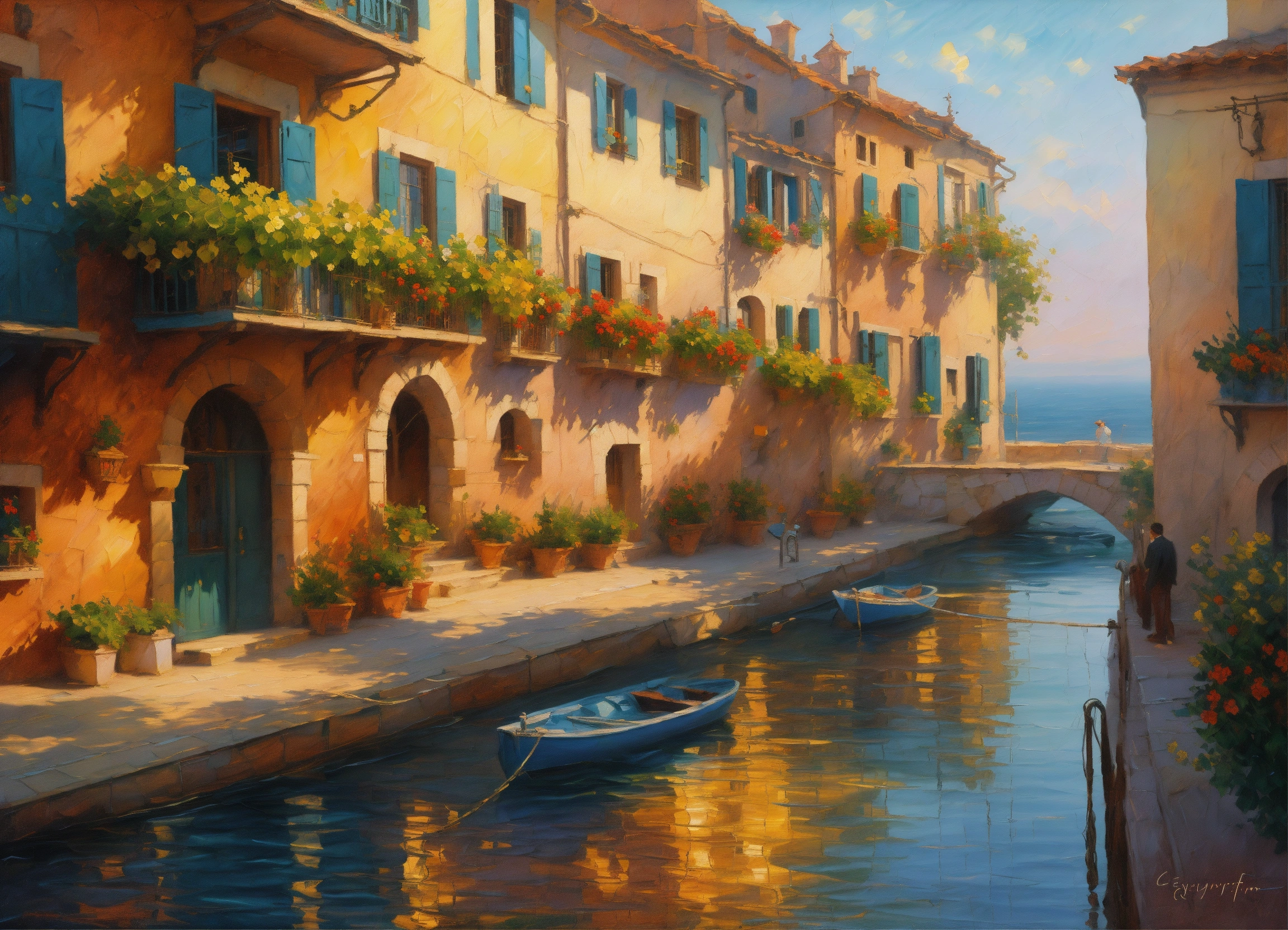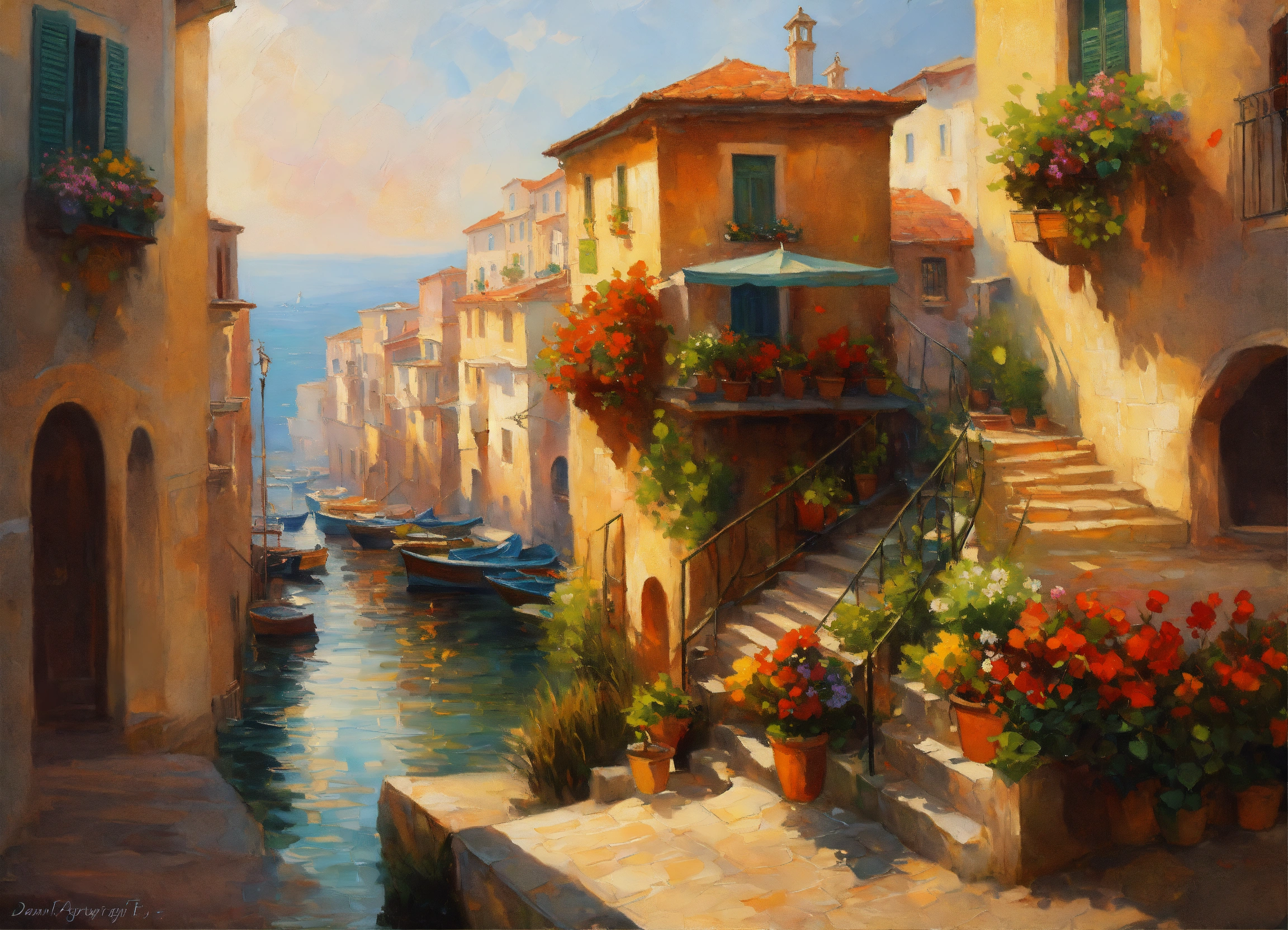 A painting of a mediterranean city, in the day with sun, painting by evgeny lushpin and daniel f. gerhartz and claude monet and leonid afremov, high details
