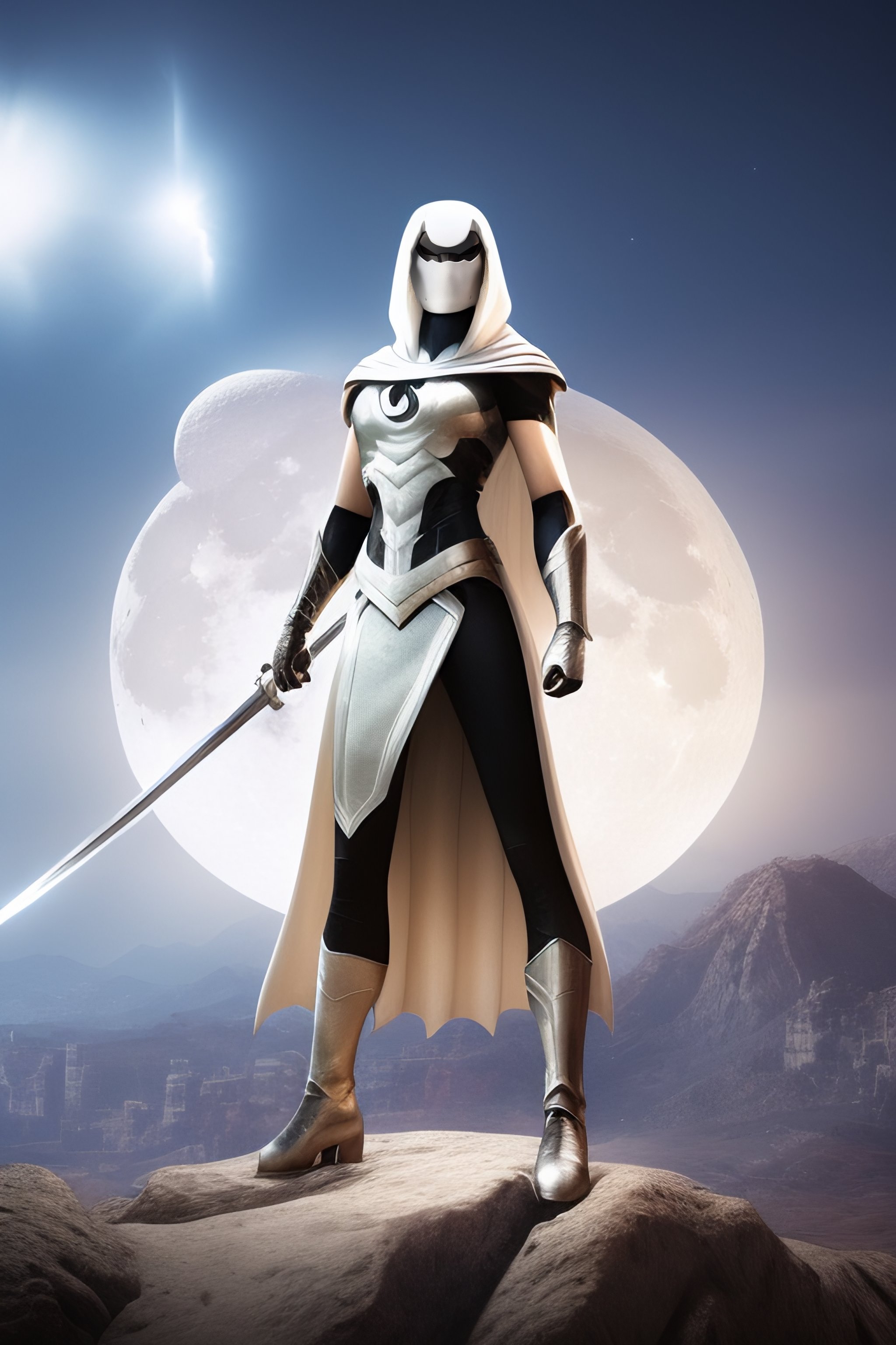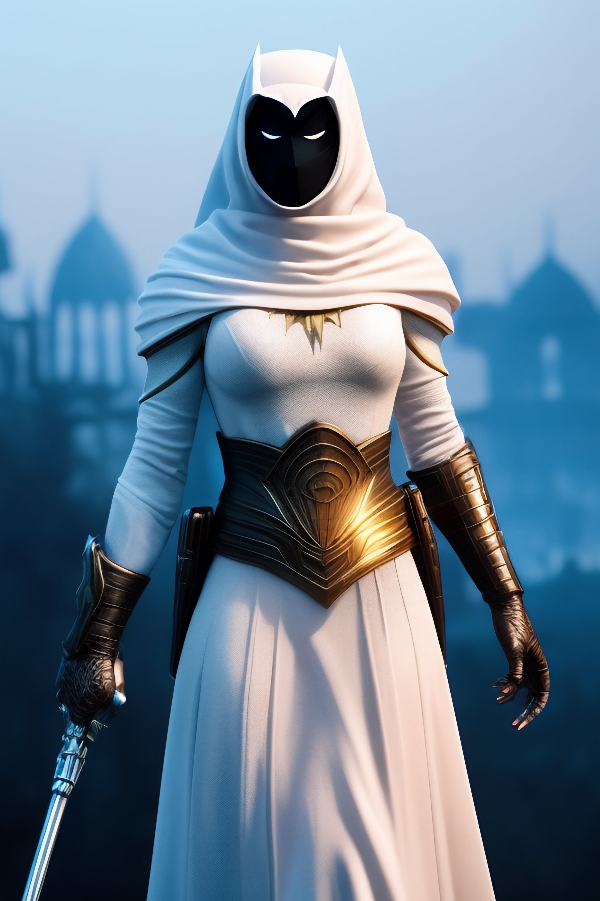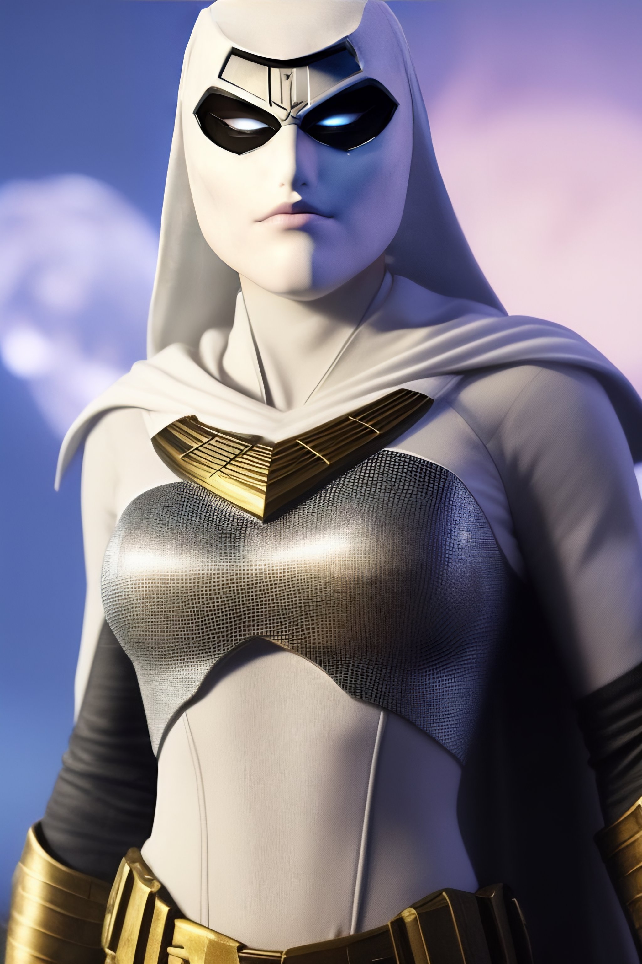 Female moon knight, hyper detailed, digital art, trending in artstation, cinematic lighting, studio quality, smooth render, unreal engine 5 rendered, octane rendered, alphonse much a