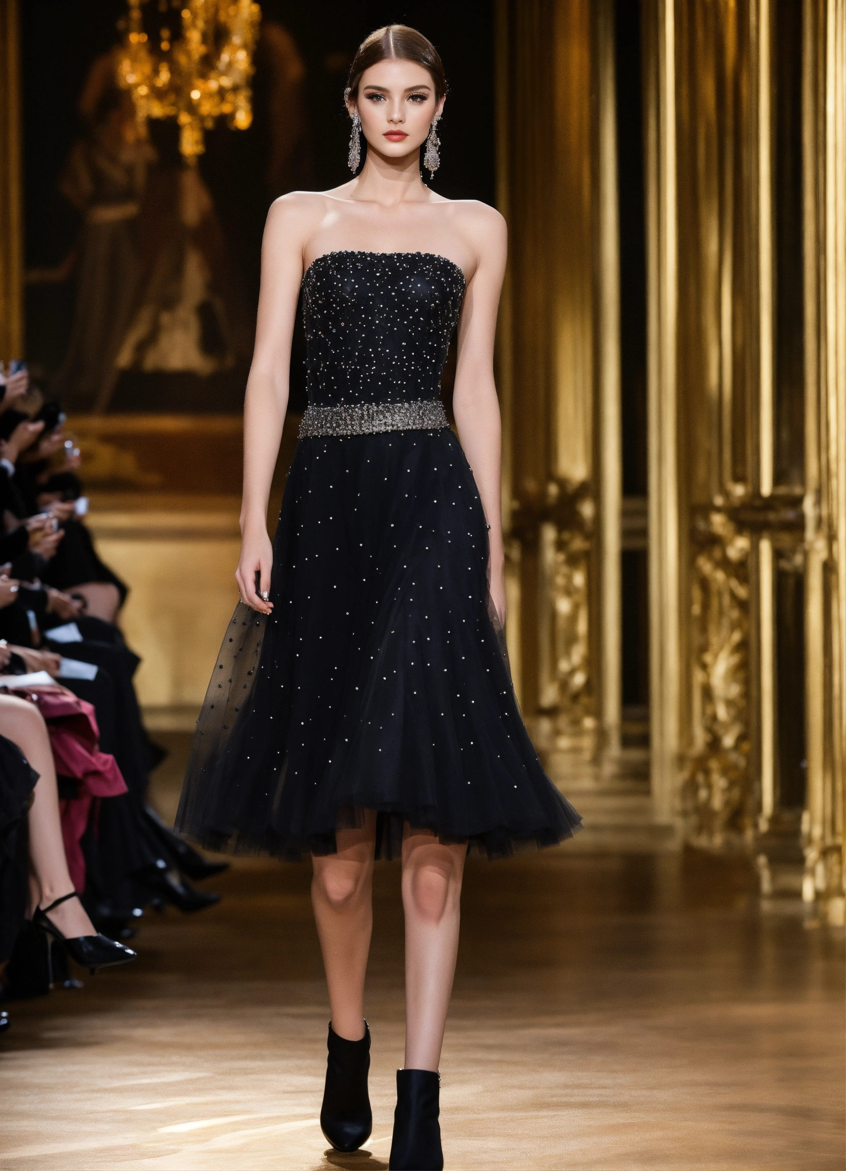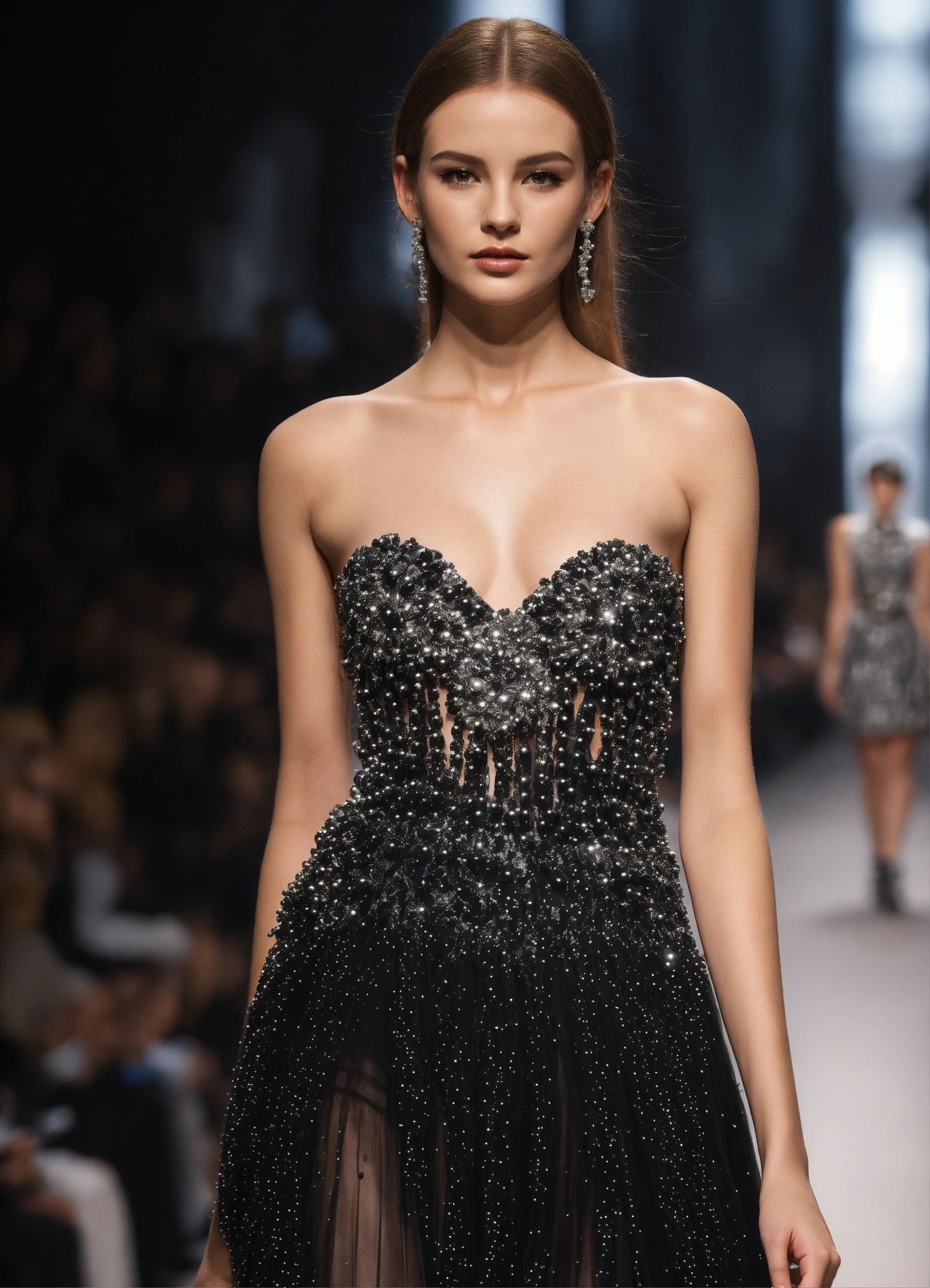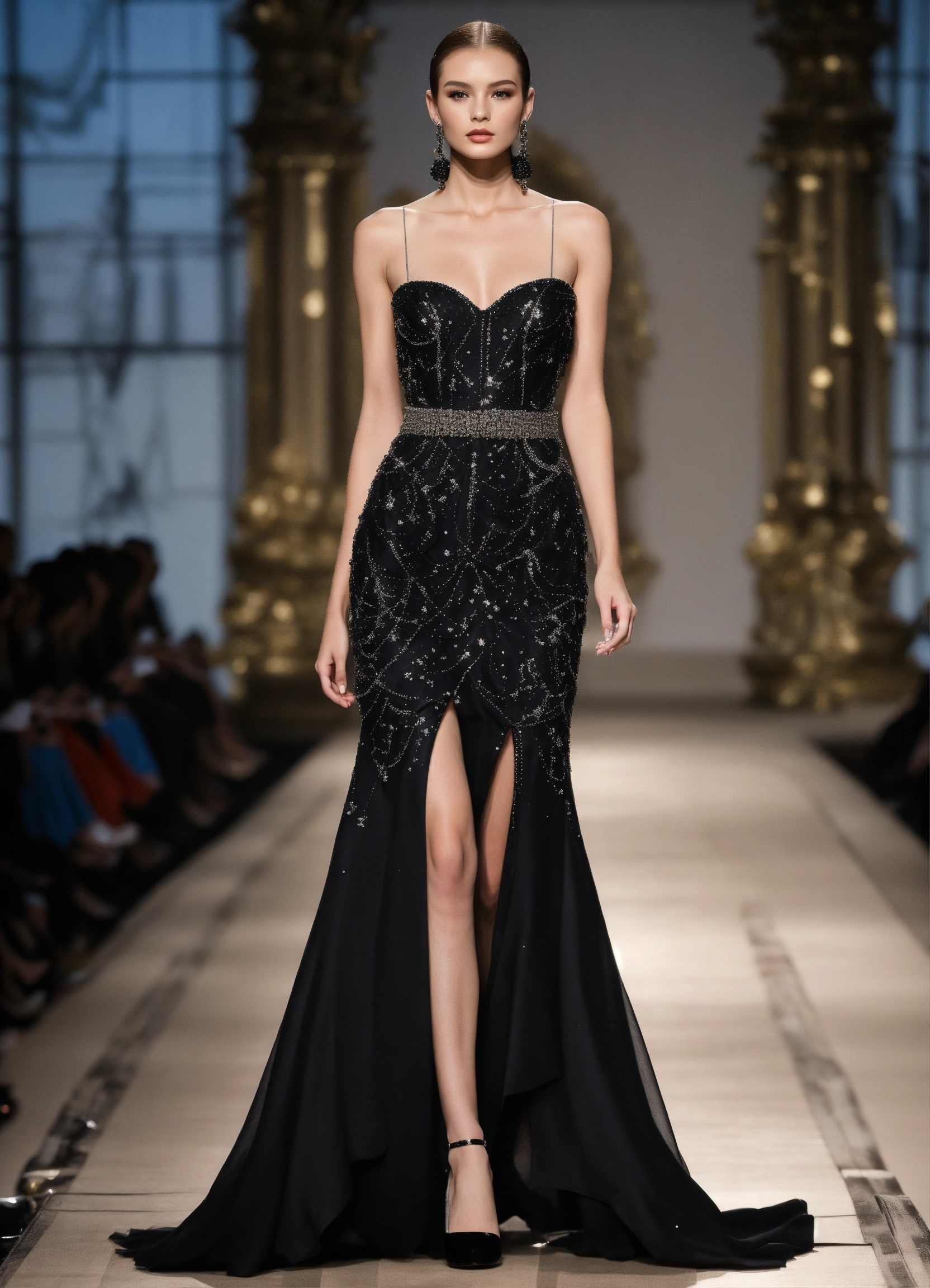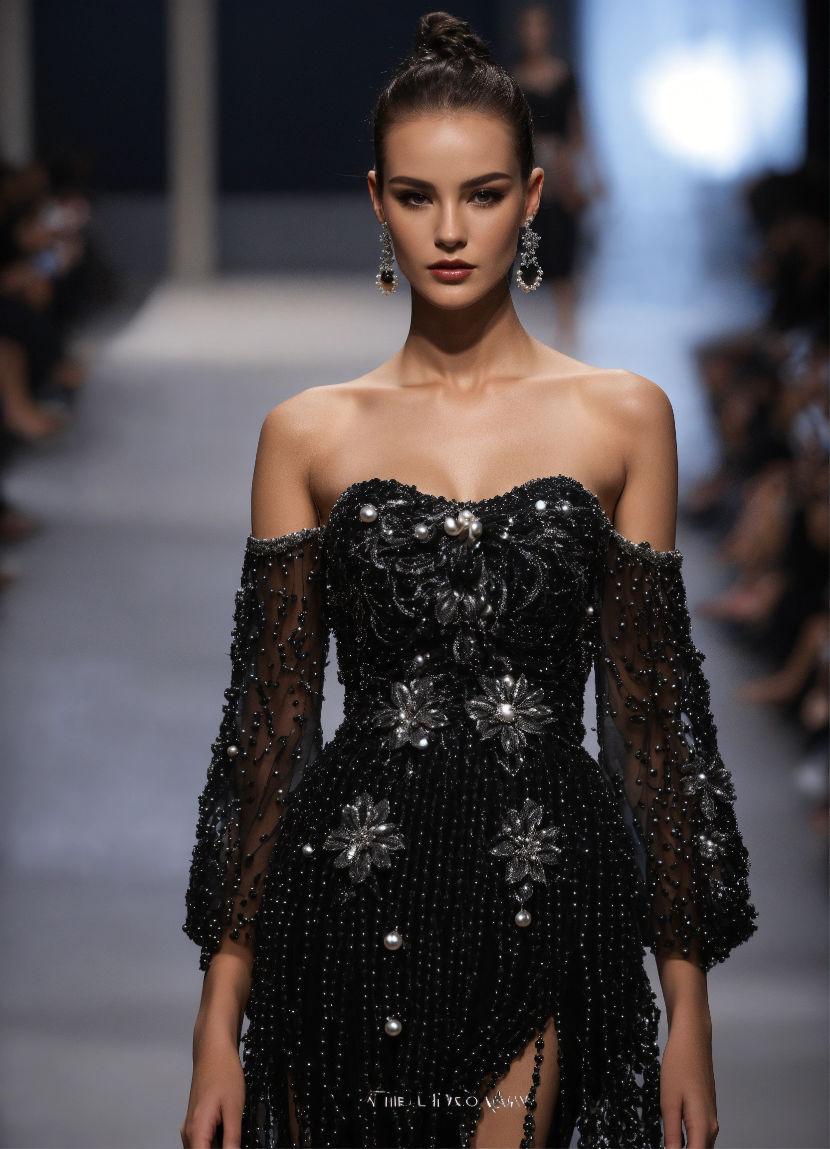 Of the model representing a new brand of the highest class of modern design of the 21st century. the dress should be semi - short dominated by the right black and silver color adorned with glittering pearls of the same color, the details will be black we saw the perfect combination of the mannequin. the dress from the upper waist should be equally dominated by handwork with two - tone black beads and decorated with fine black beads, the lower part of the dress should be a deep pleat on the right side of the silhouette, perfect lines of the model to give a perfect representation of the dress on the catwalk of paris for the autumn - winter season