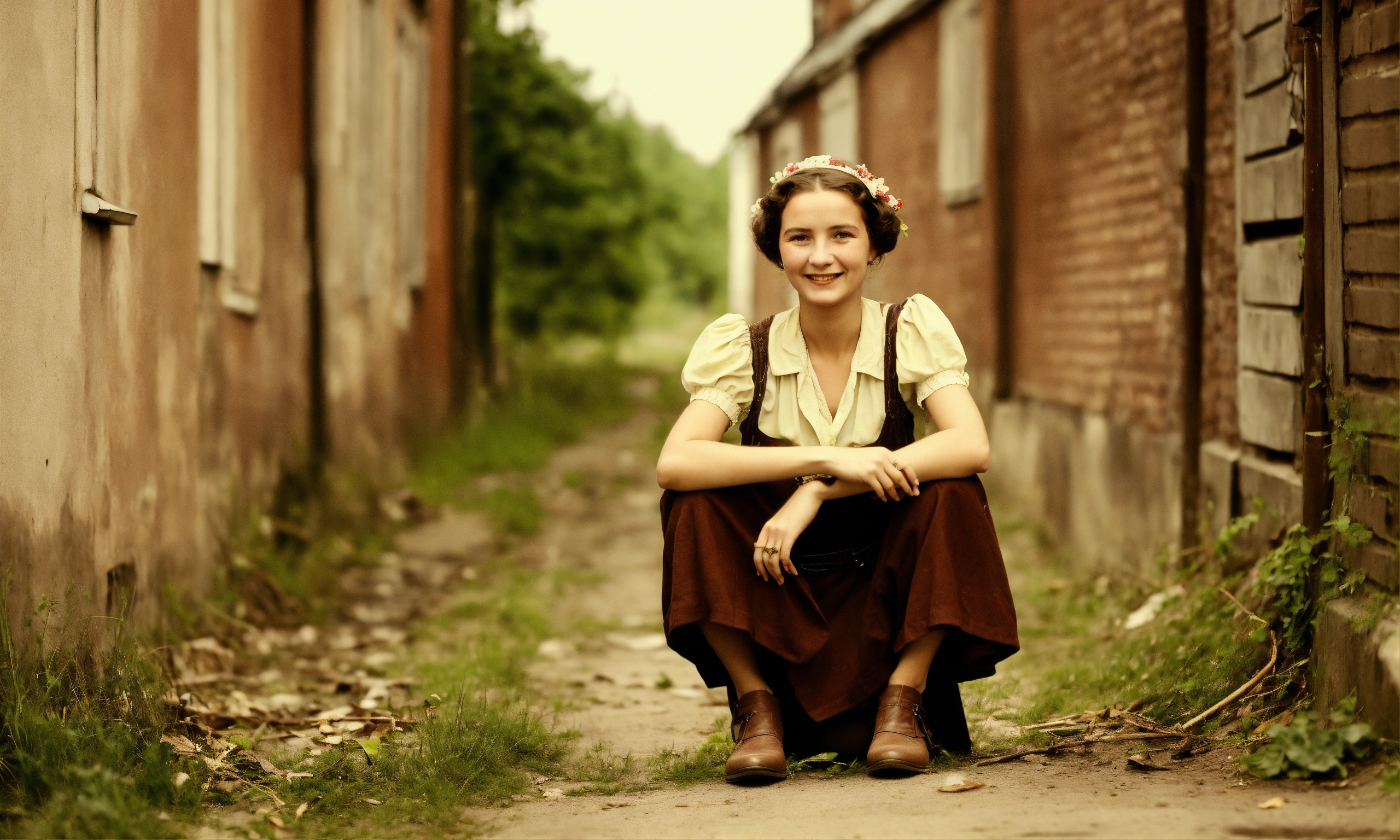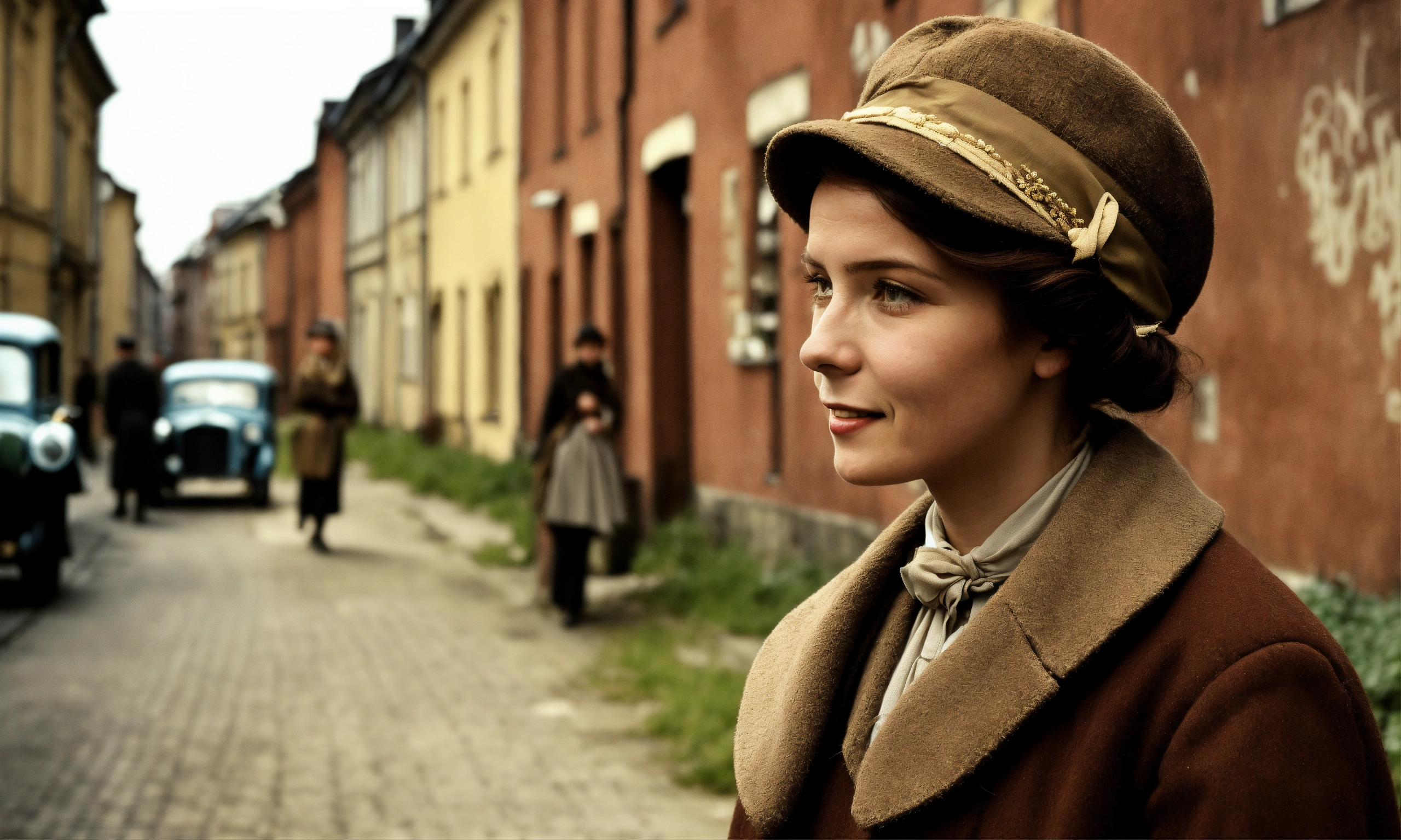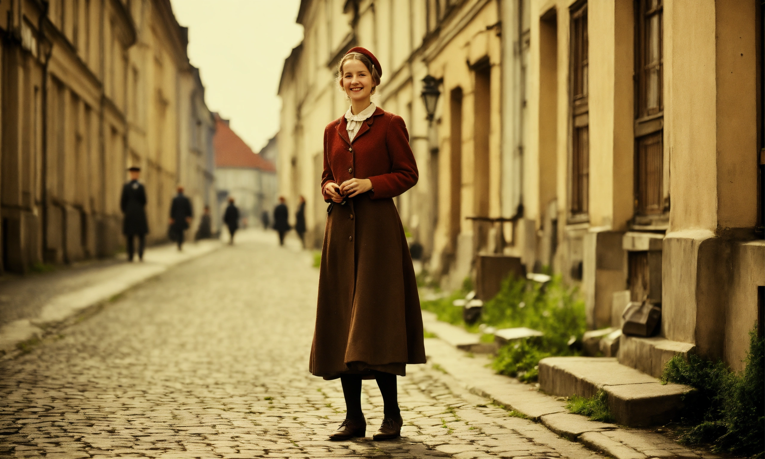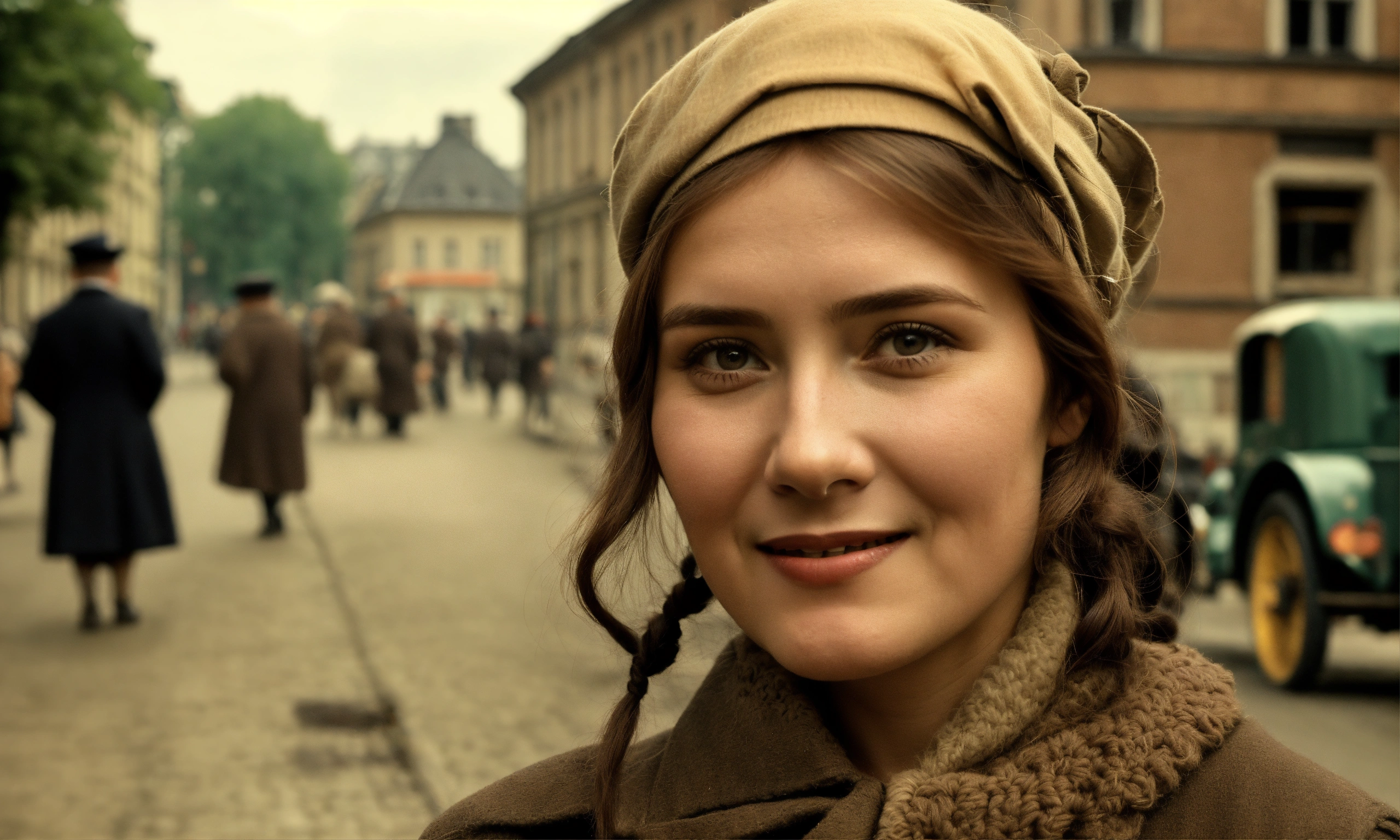 Сute poland think poor woman age 20, 1920-1930 on streen in warshaw. retro style photo. without people. focus camera on face woman . season summ, keep in mind that the street must be without people, retro style photo. without people. man full height. on street, smiling. man age 20 years old.clothing old style