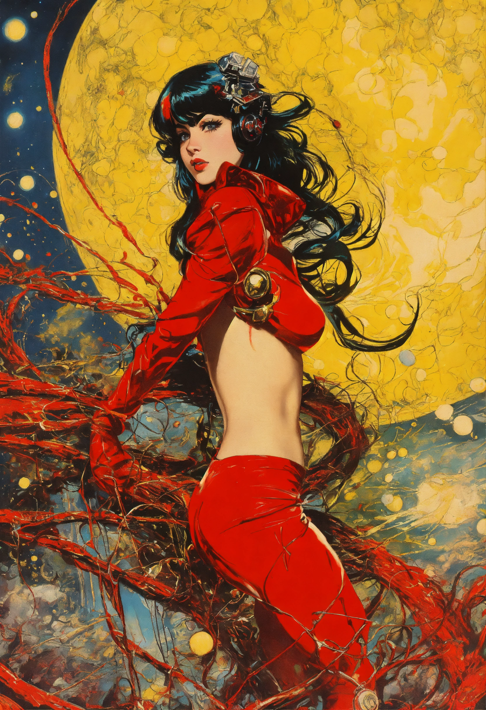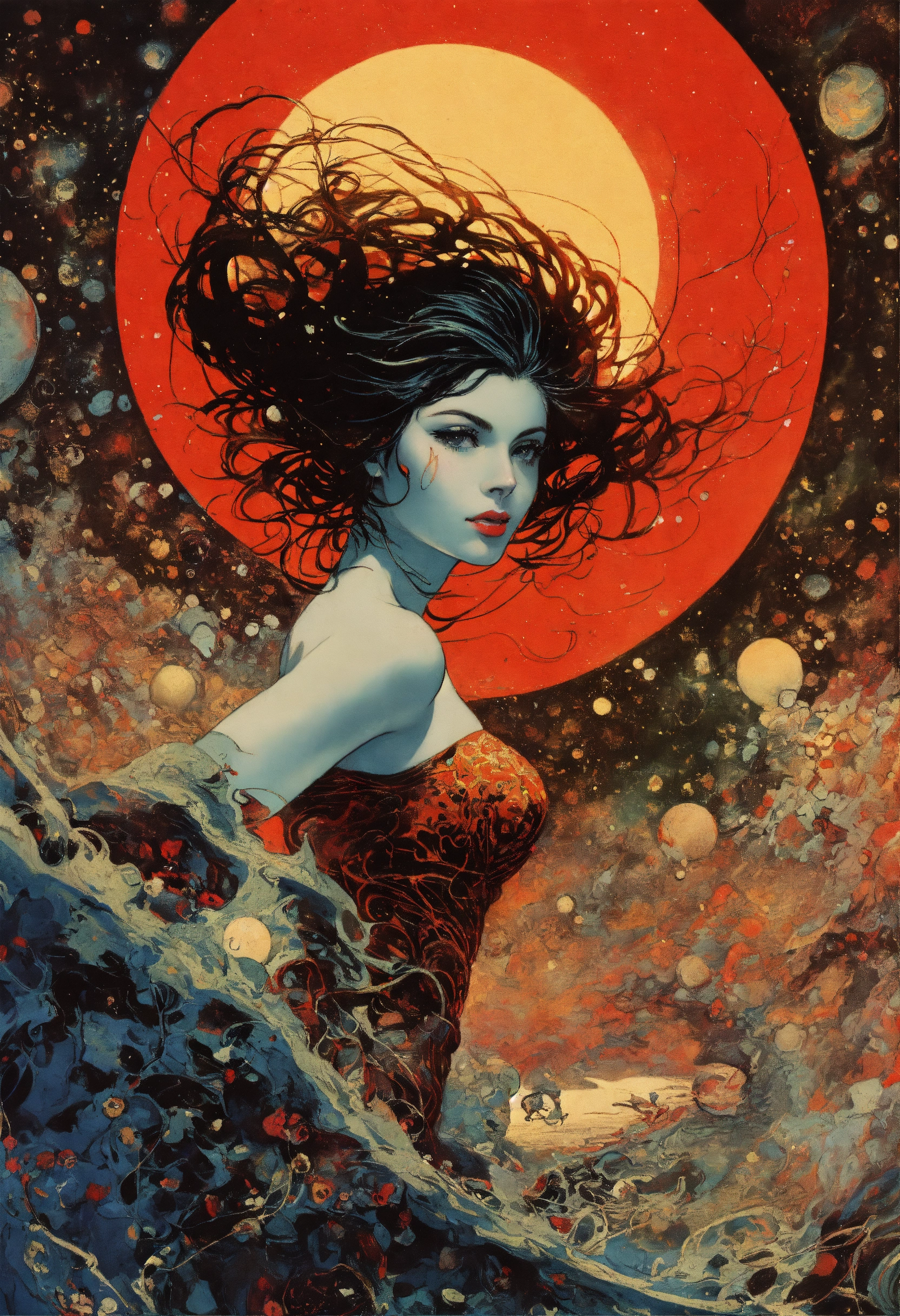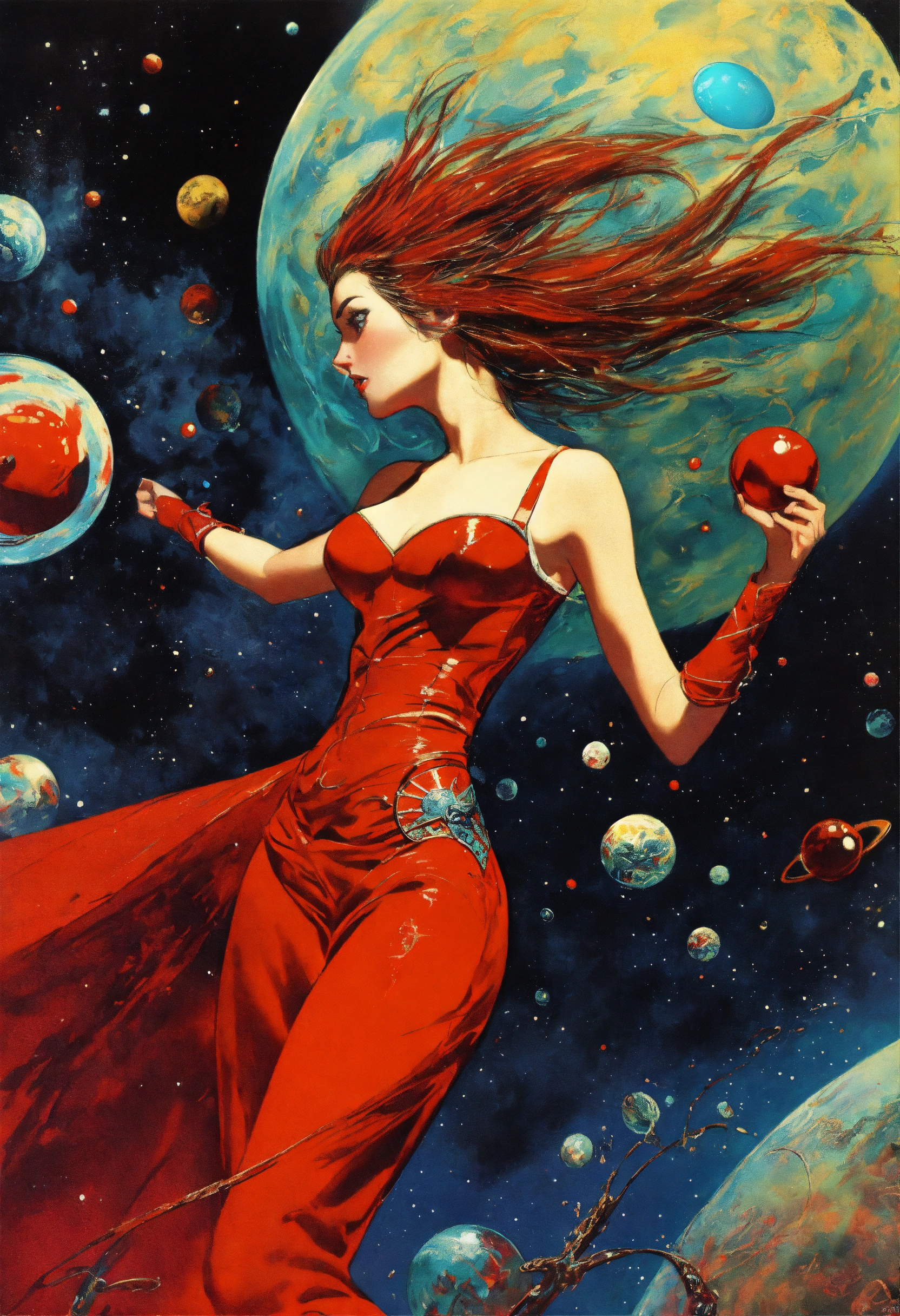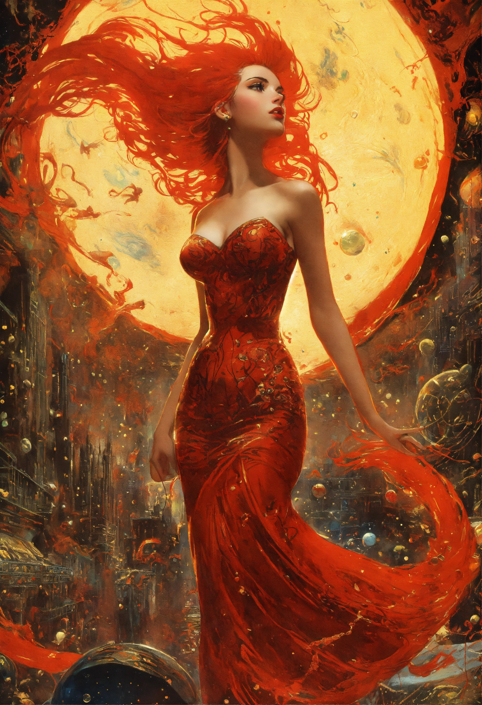 1960s hyper surrealism, photo-realistic, enchanted siren, long red tail, space-punk, concept art, sharp focus, intricate, highly detailed, smooth, dramatic backlighting, art by jackson pollock, comic book art style