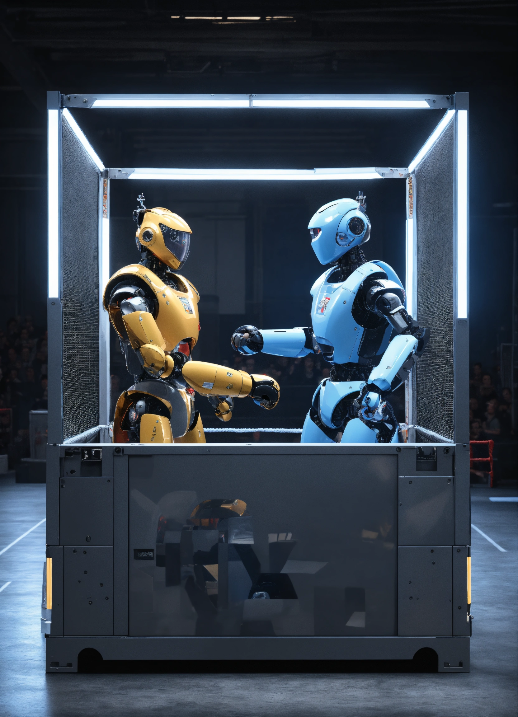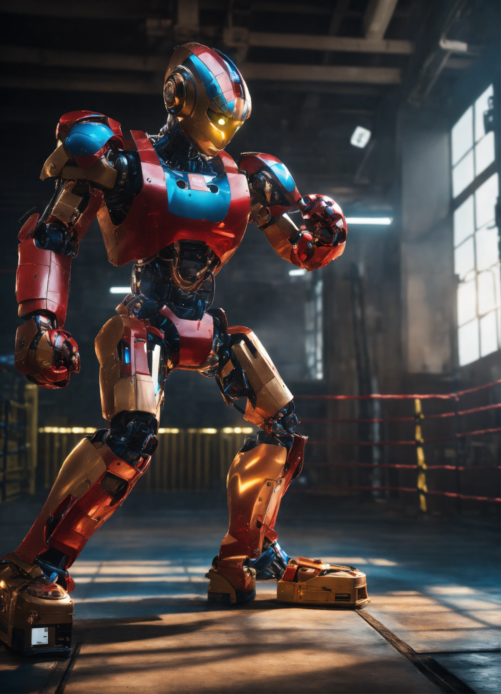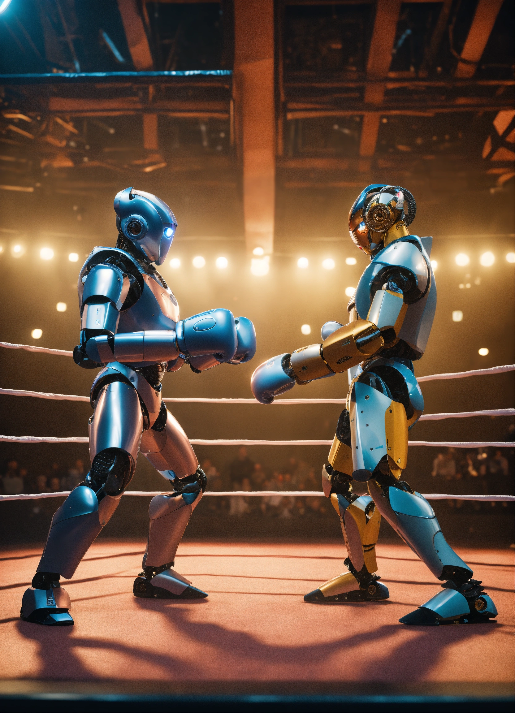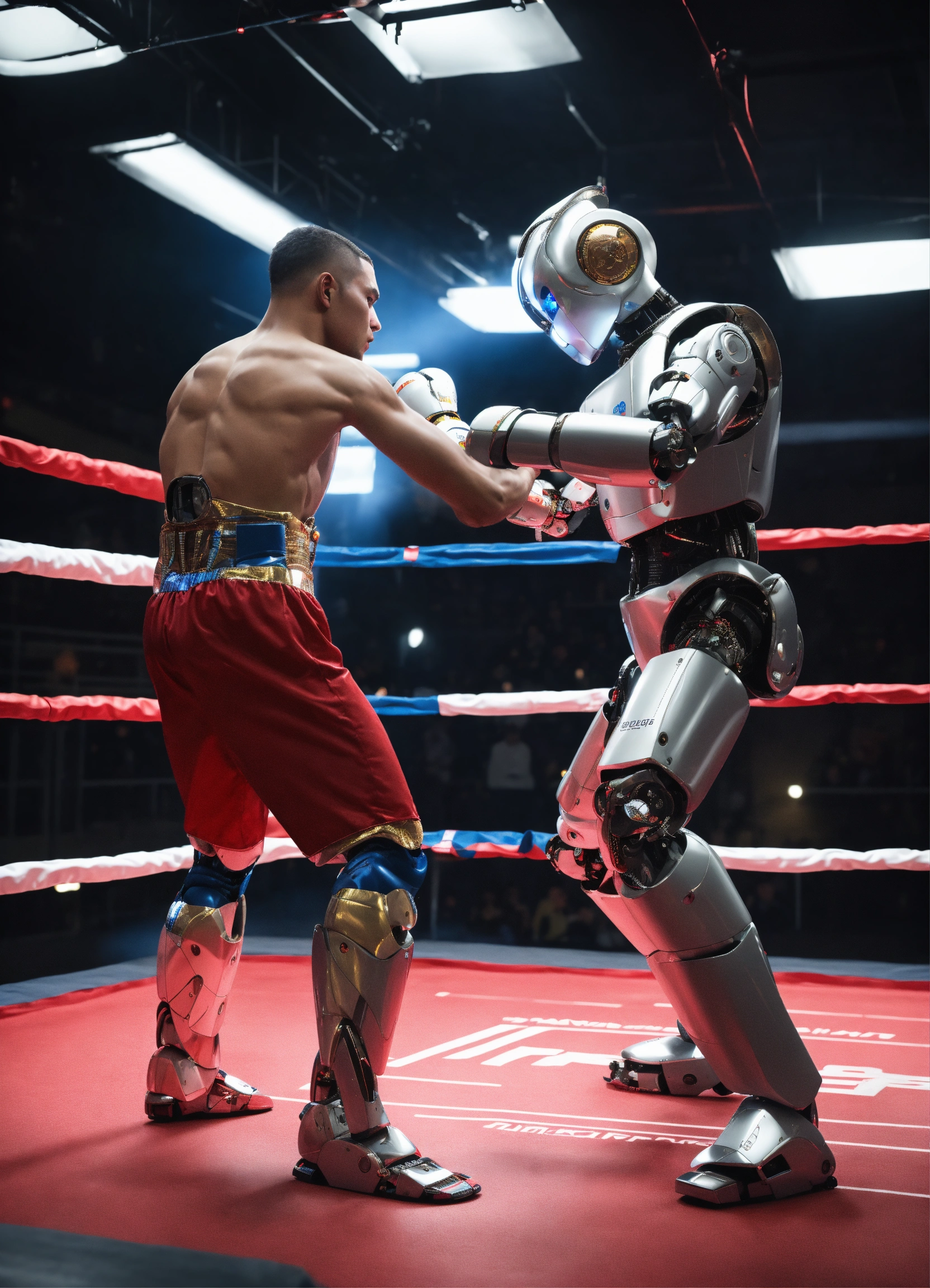 Generate a hyper-realistic image in 4k resolution that portrays a humanoid robot and a human guy, fighting inside a boxe ring