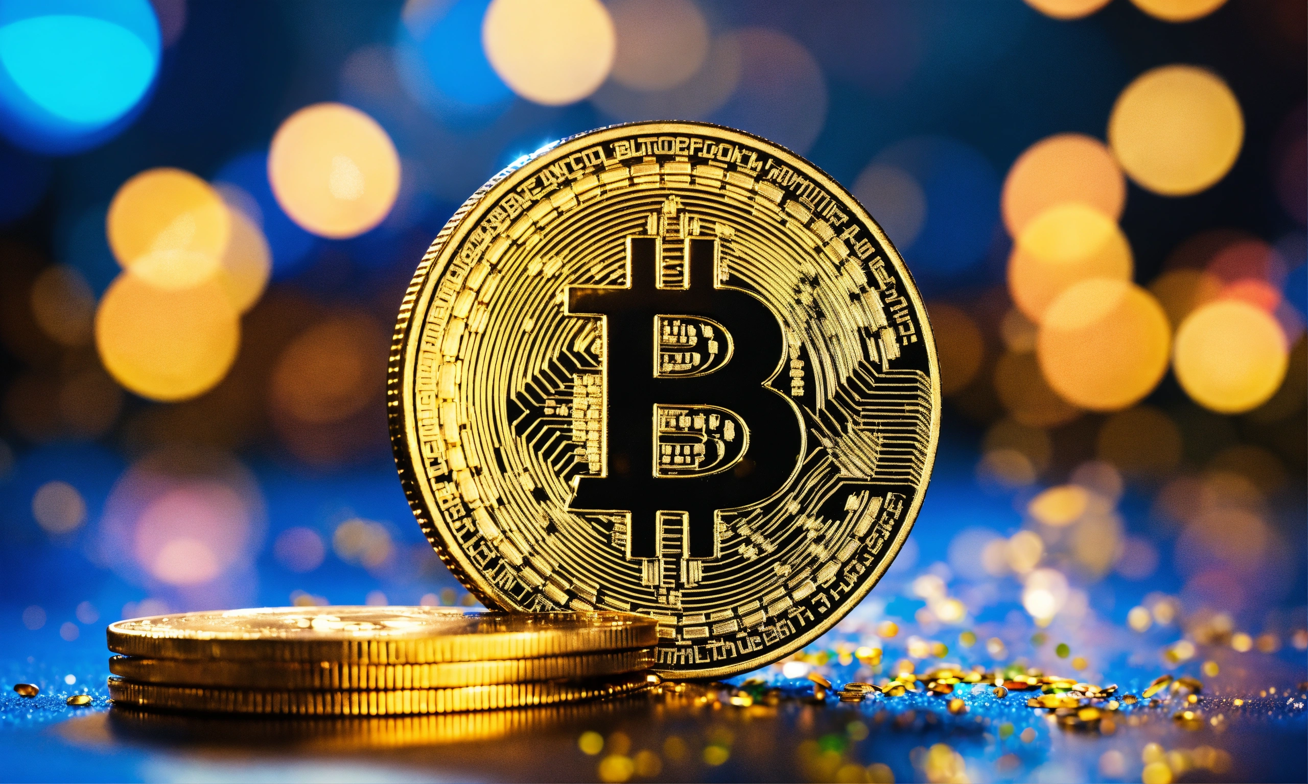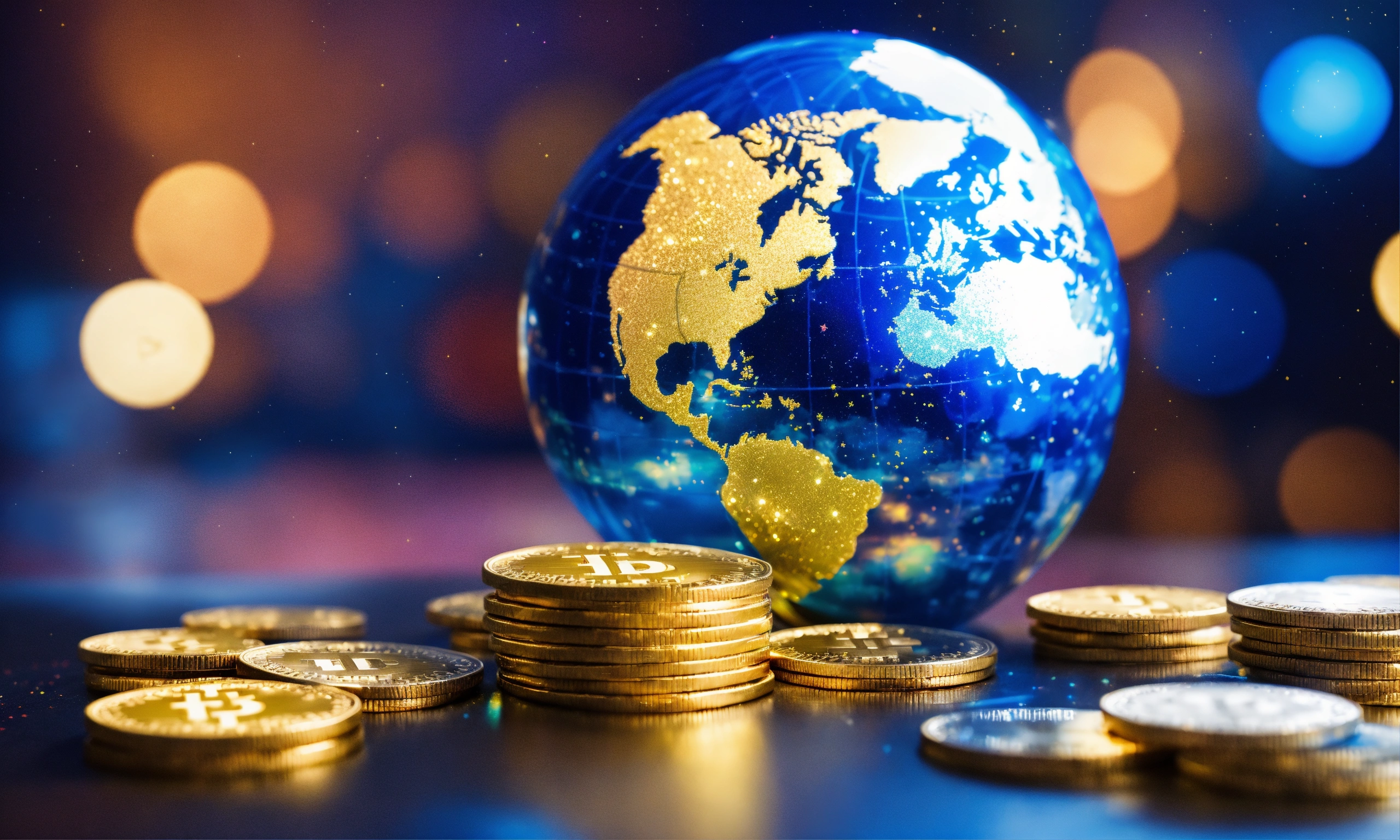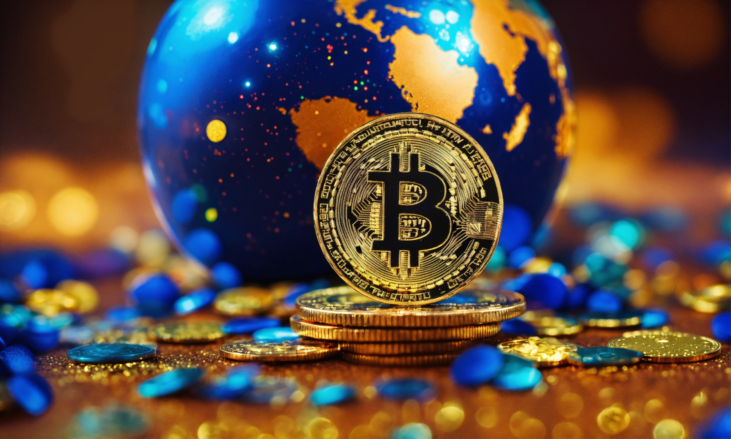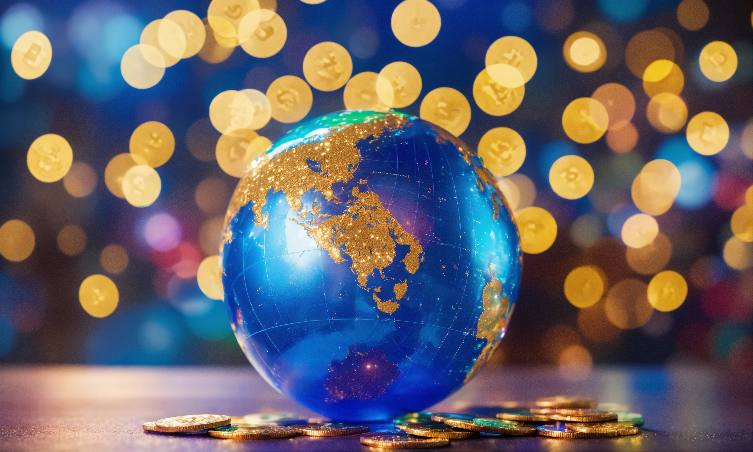 In the front are some bitcoin coins on the table and in the side a blue globe floating with some glitter effect, 4k, high resolution, realistic image/photo, colorful, modern style