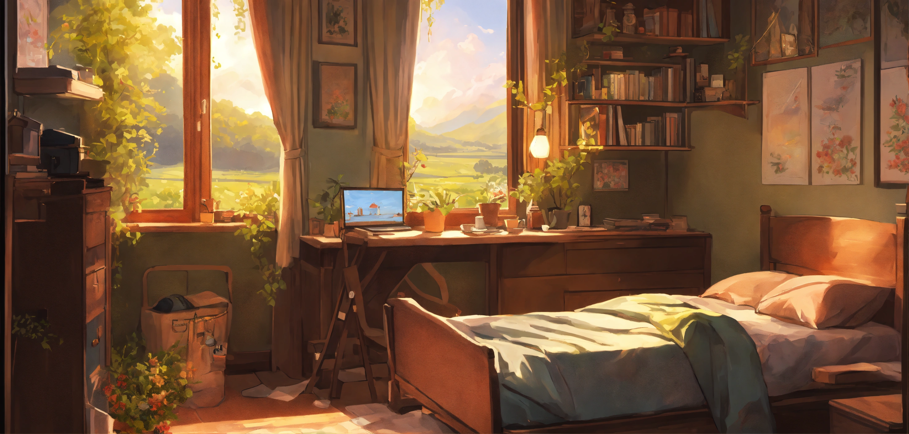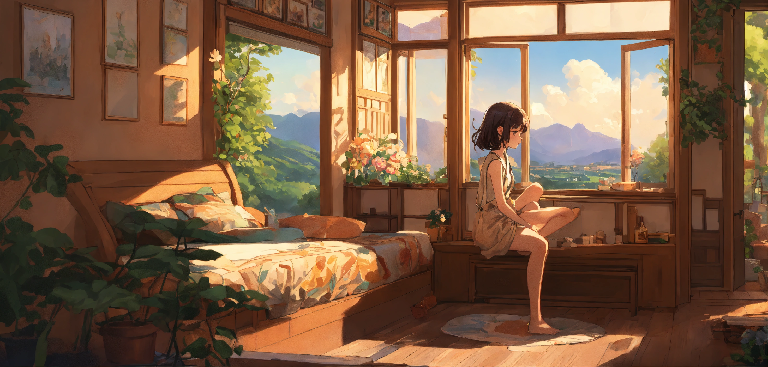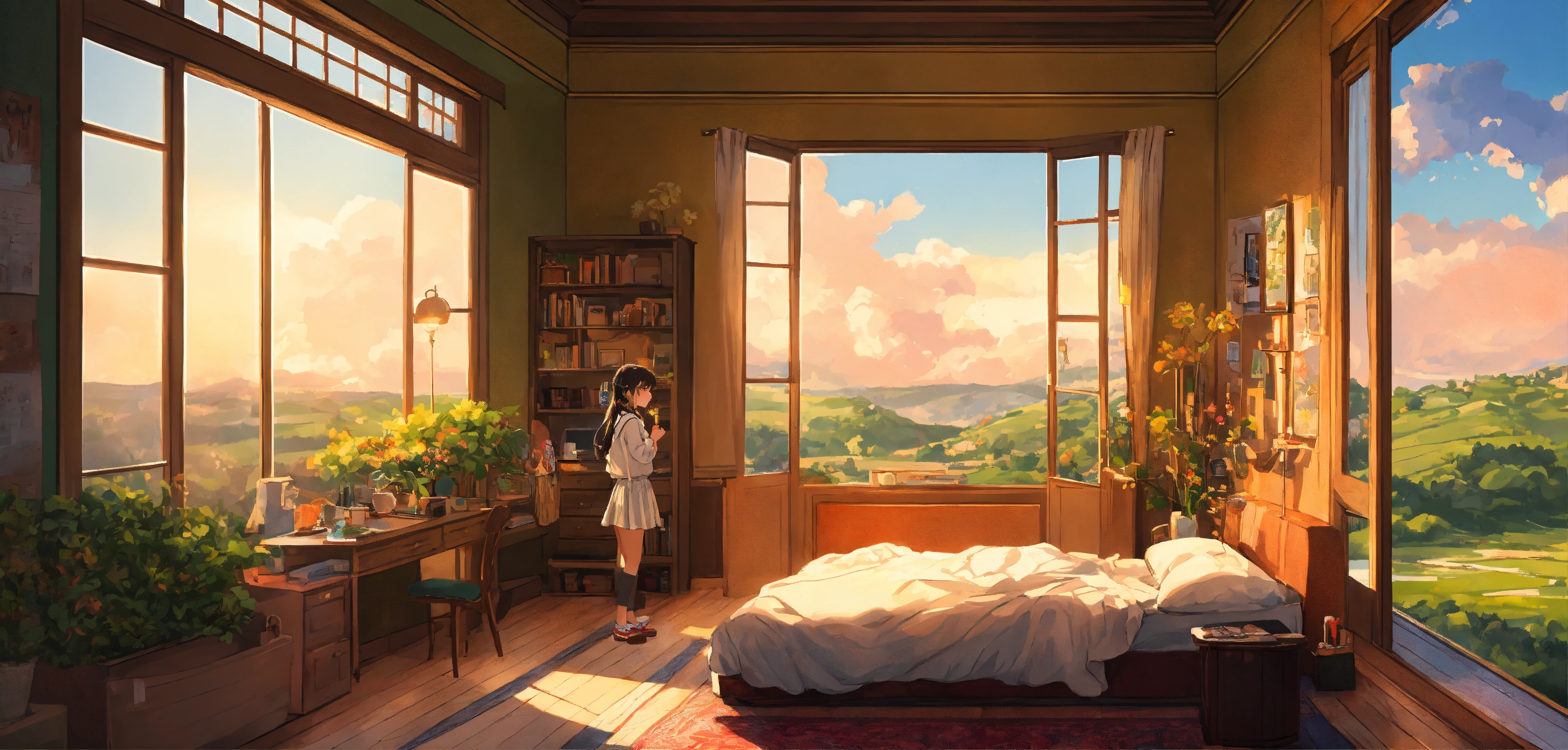 Create an intricately detailed anime-style illustration of a young girl in a lofi atmosphere, situated in her bedroom. the bedroom should feature a large window that opens up to a picturesque countryside landscape. the emphasis should be on producing a highly realistic and error-free depiction of the young woman. pay meticulous attention to capturing intricate details, facial expressions, clothing, and overall aesthetics, ensuring a true-to-life representation. the final artwork should evoke a serene, contemplative mood, with the young woman as the central focus of the composition