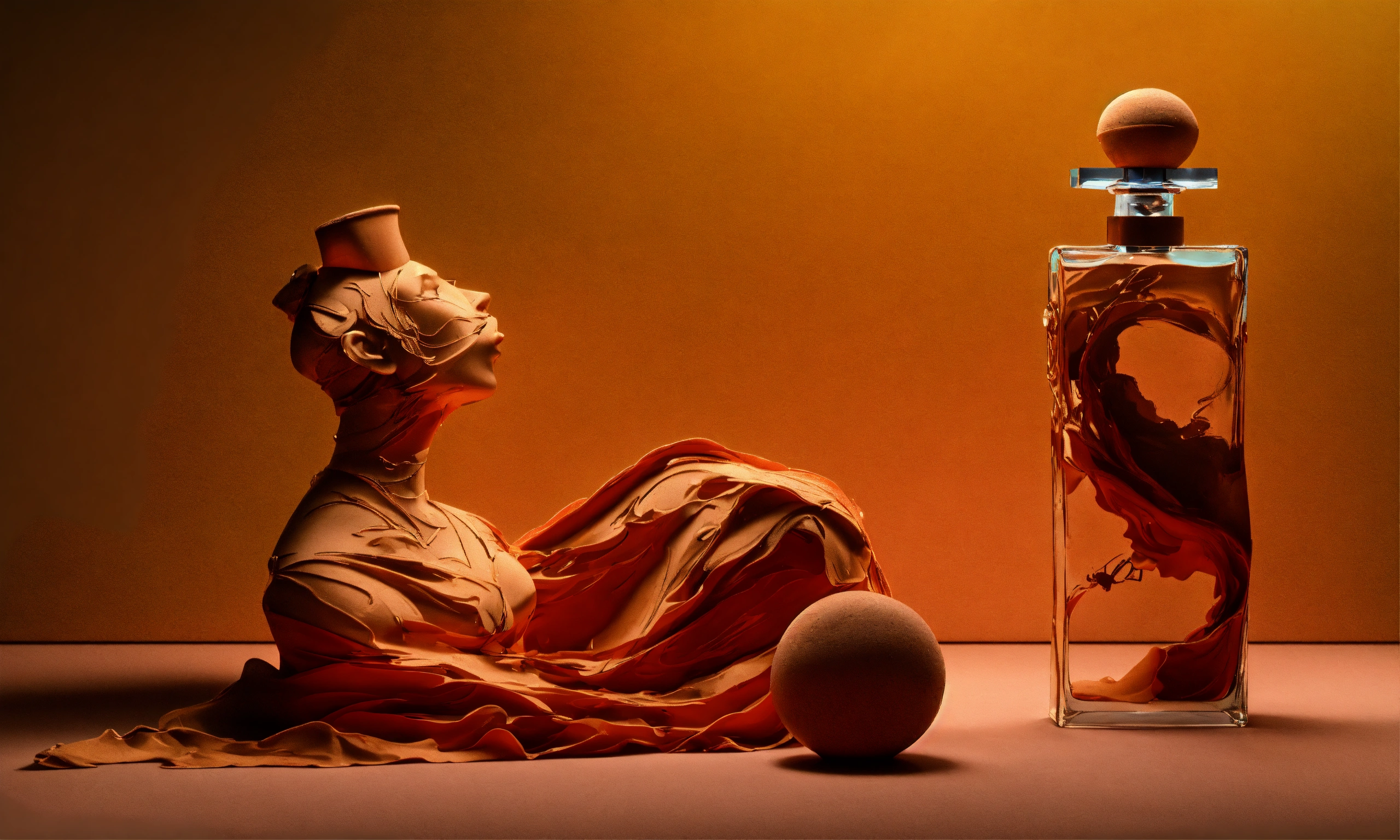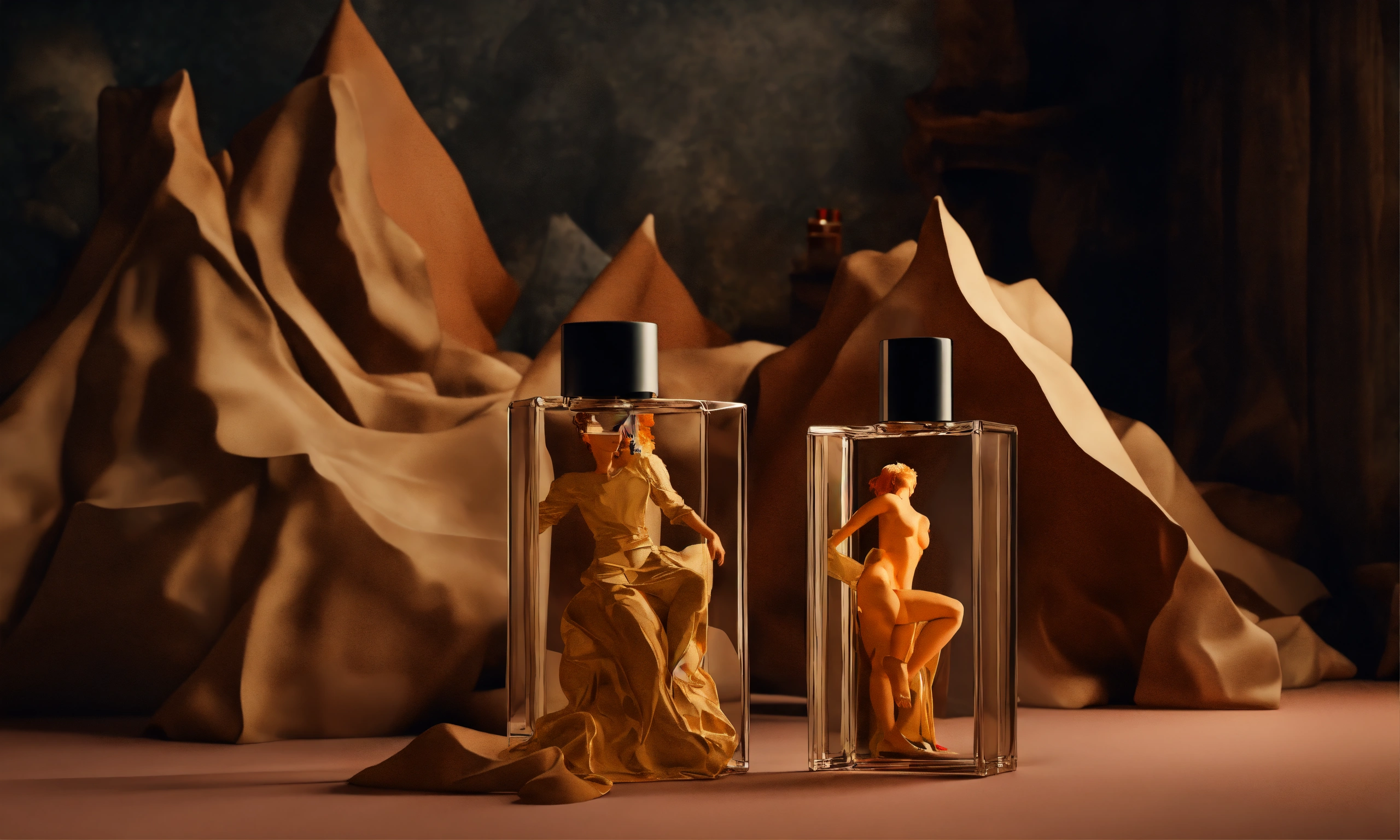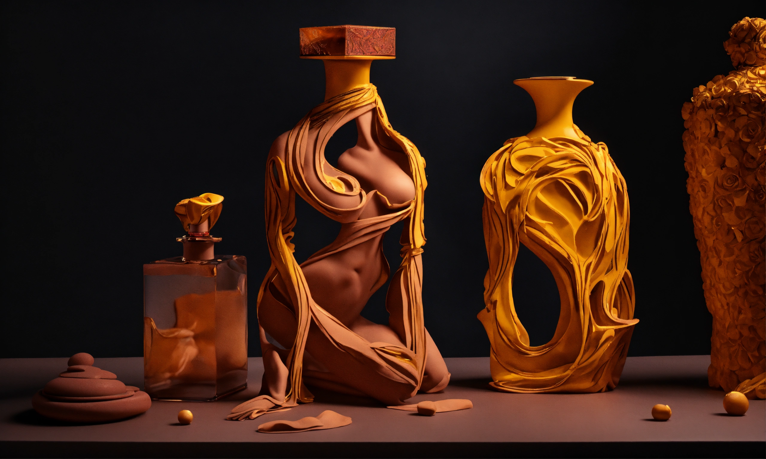 3d abstract modeling clay woman and man body. egon schiele inspiration. foreground view on perfume bottles. skin enveloping experience. dark room, salvador dali universe inspiration