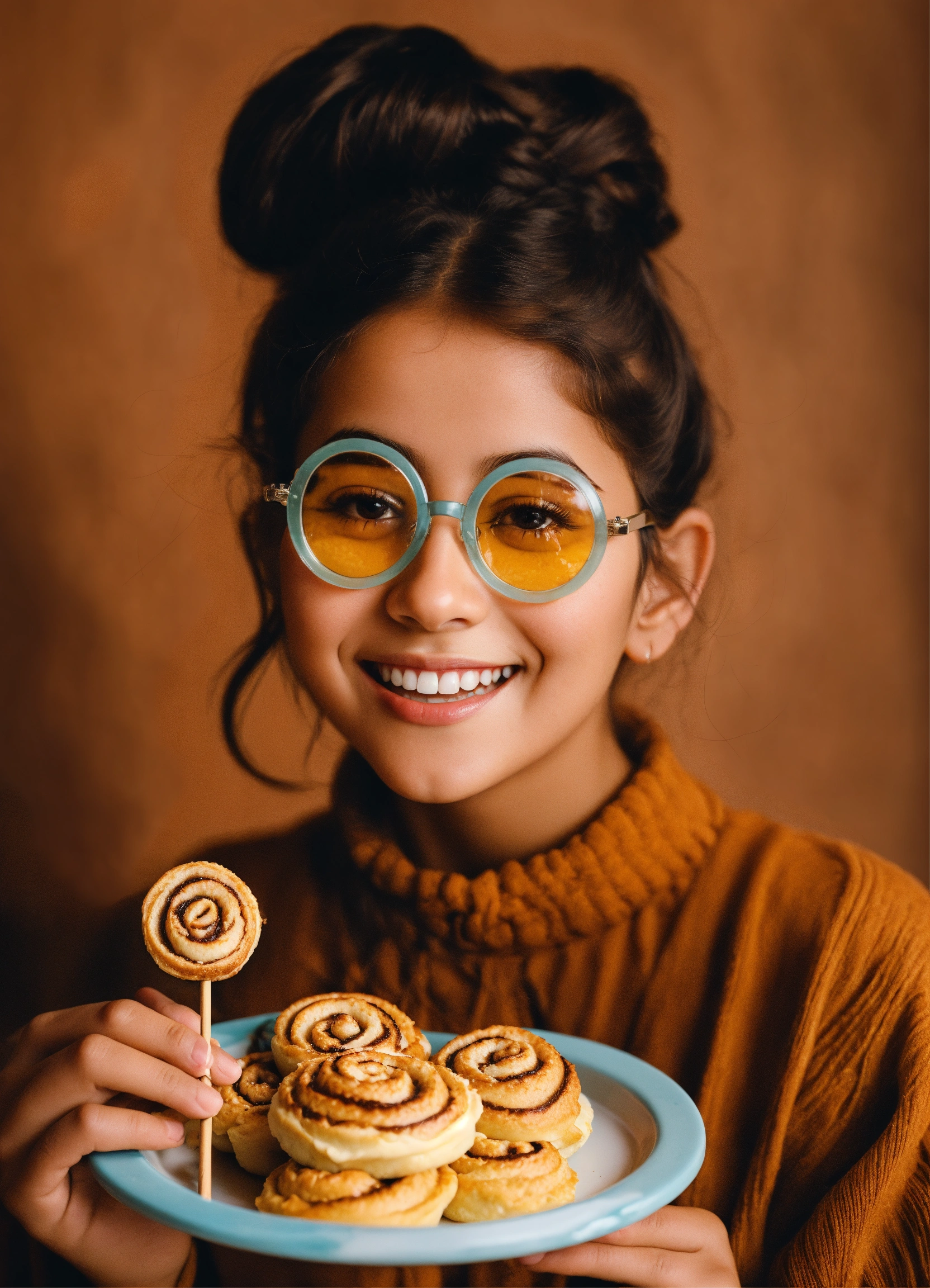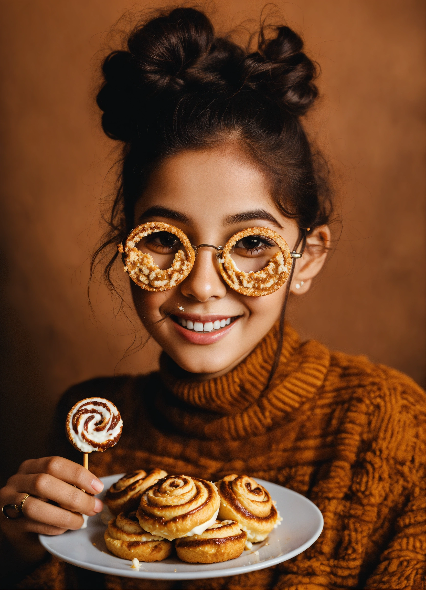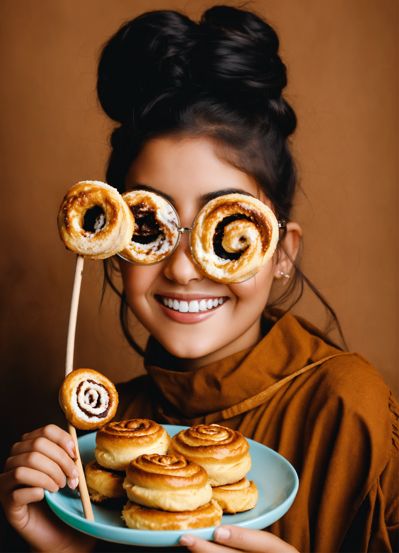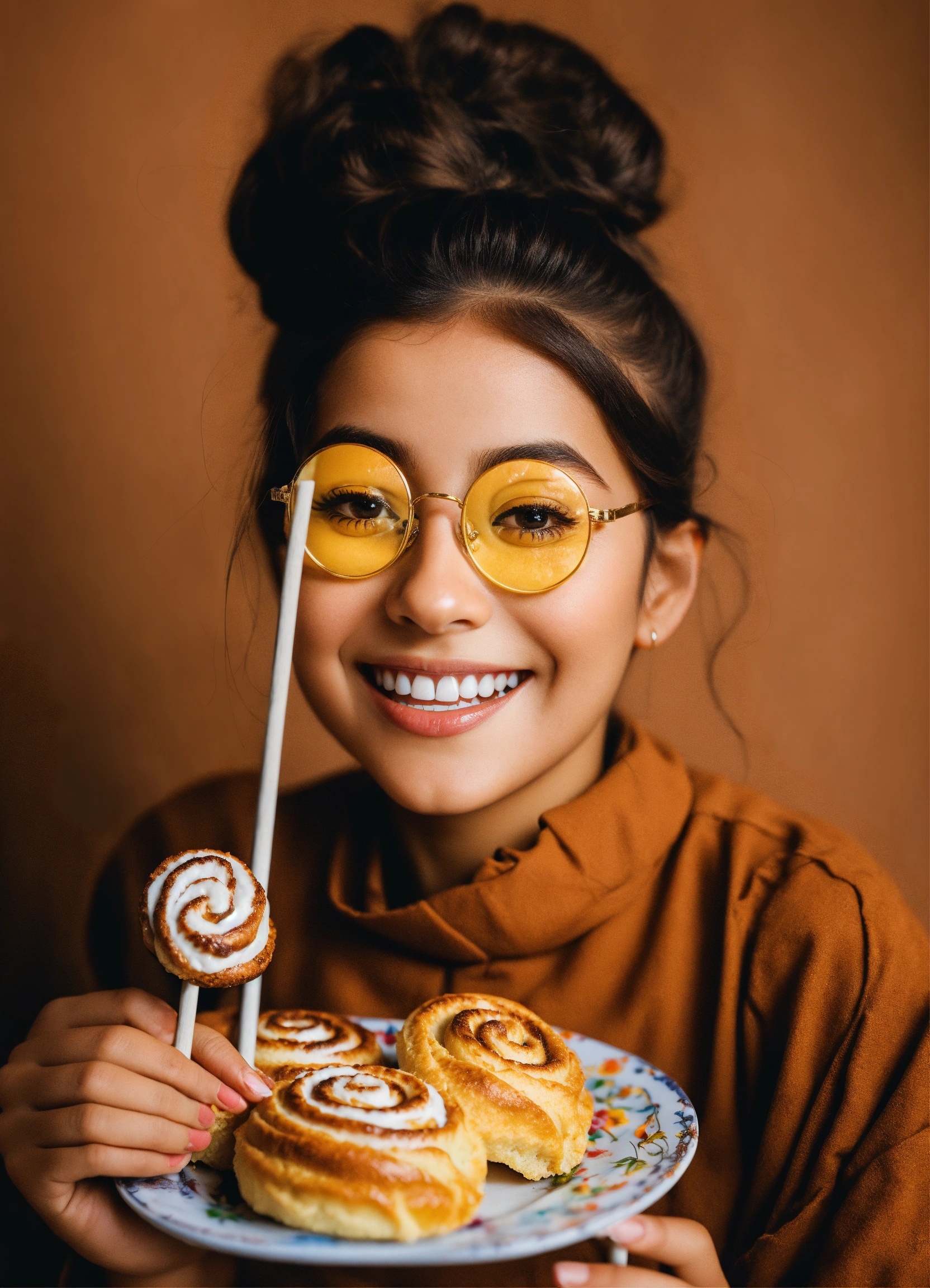 Happy arab girl infront of mini cinnamon roll holding a photo prop glasses with a stick