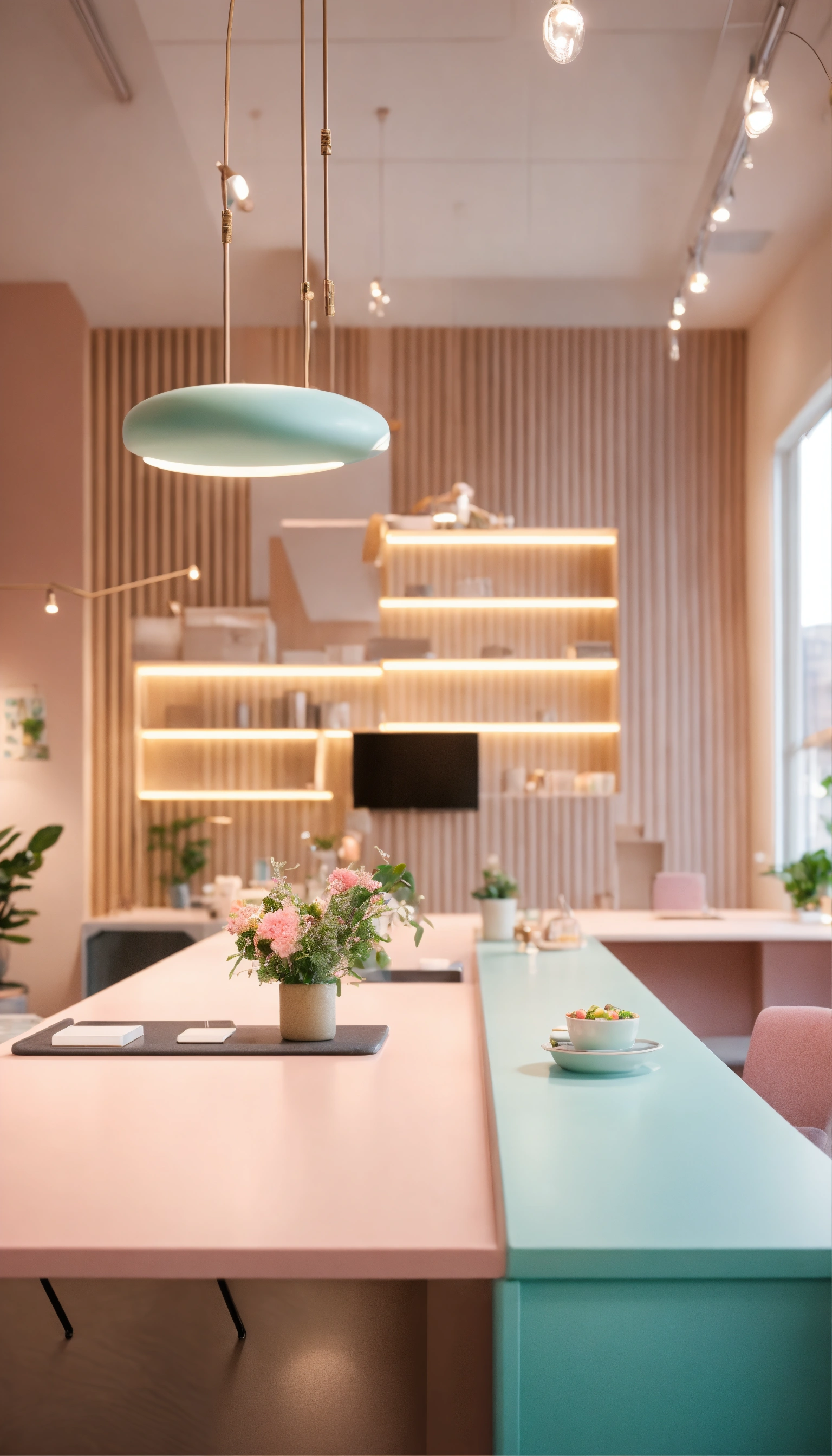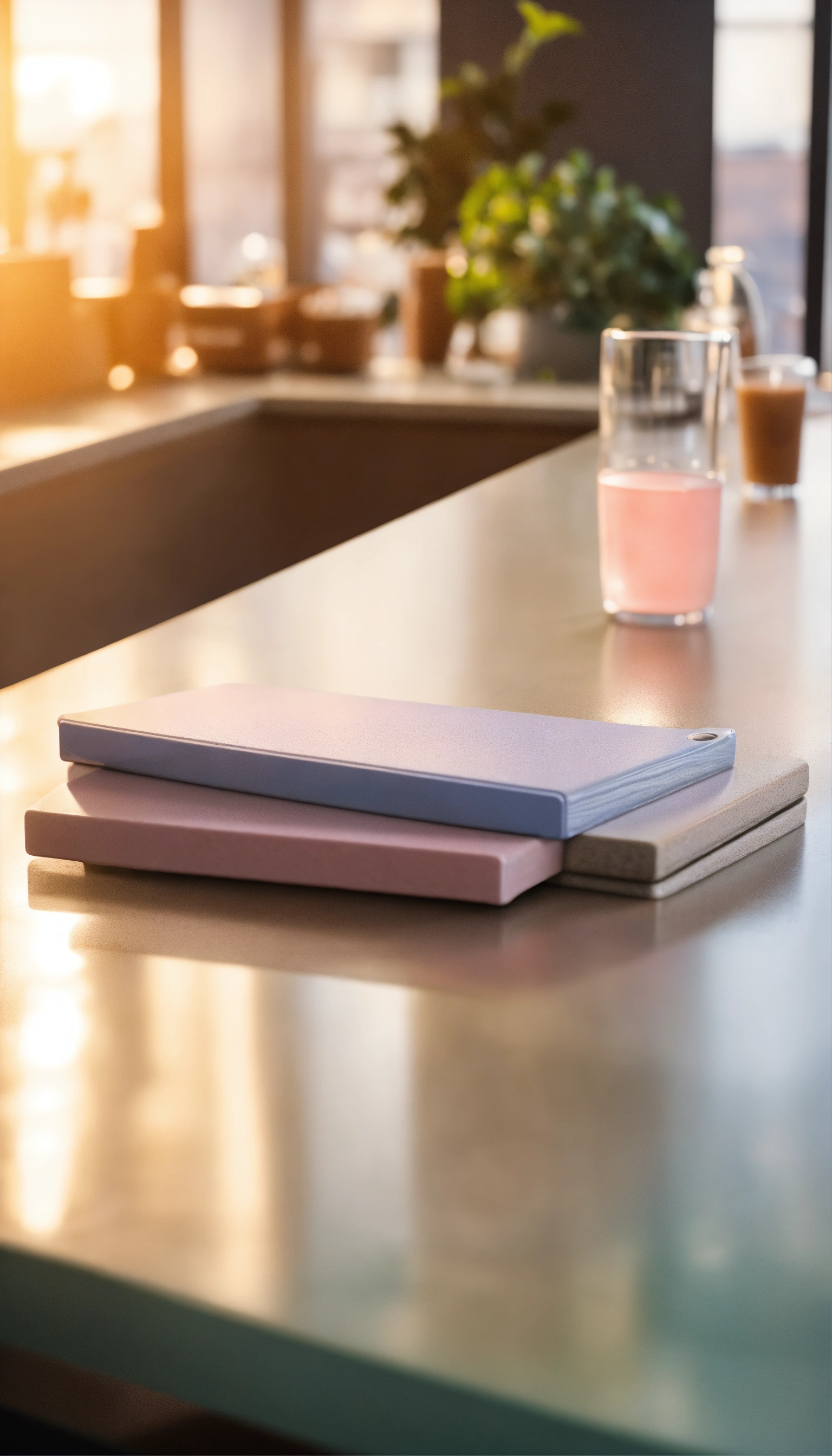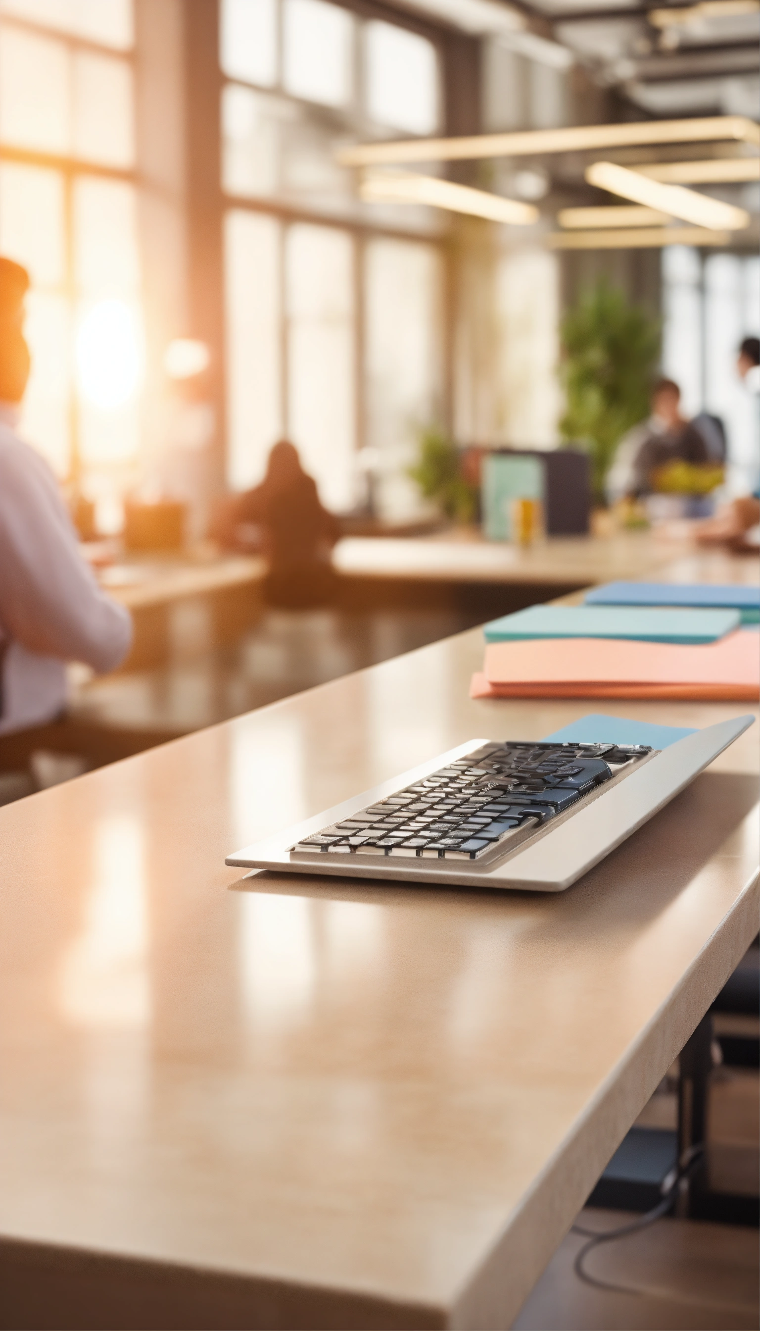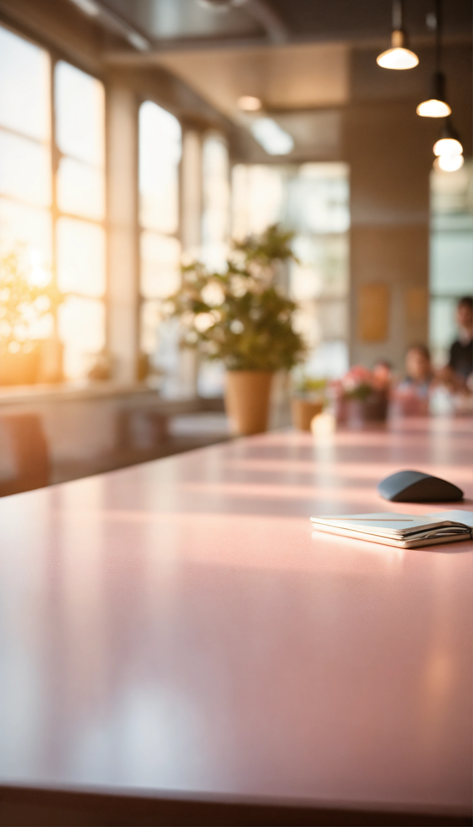 Countertop close-up, there is a meeting in the background, office space, soft lighting, lots of people, pastel colors, real photo