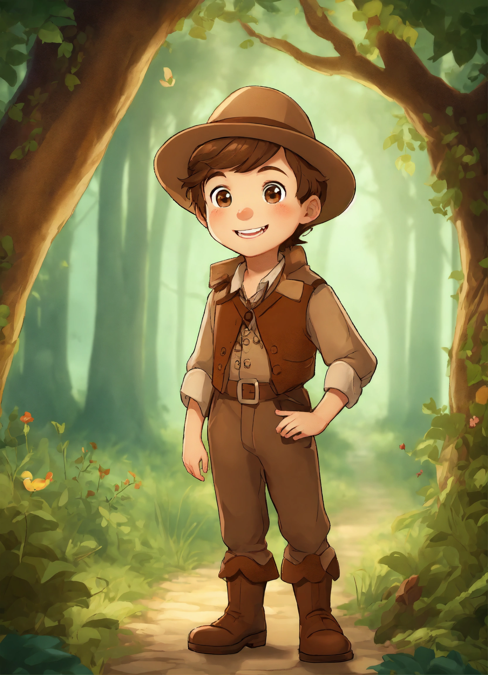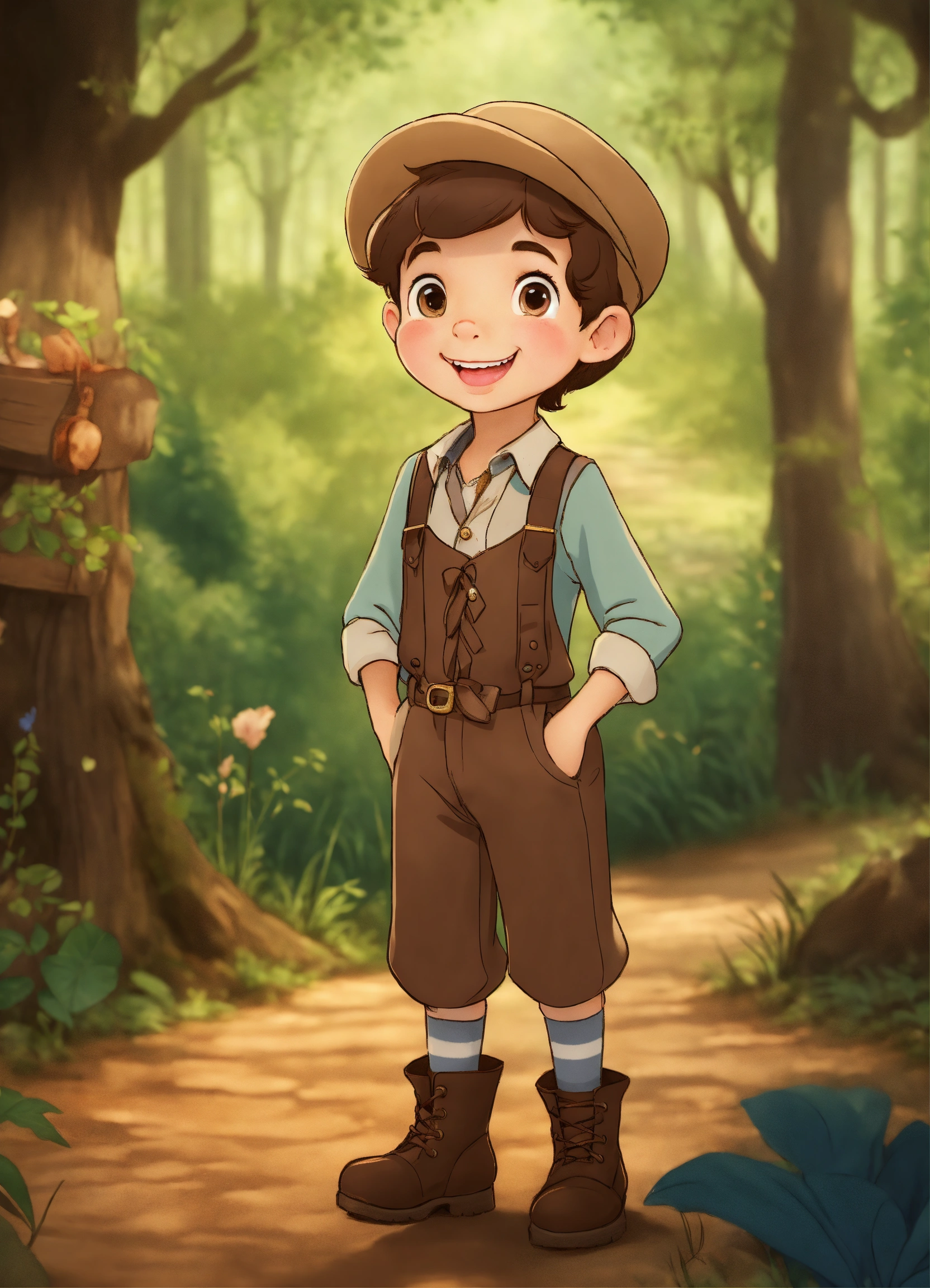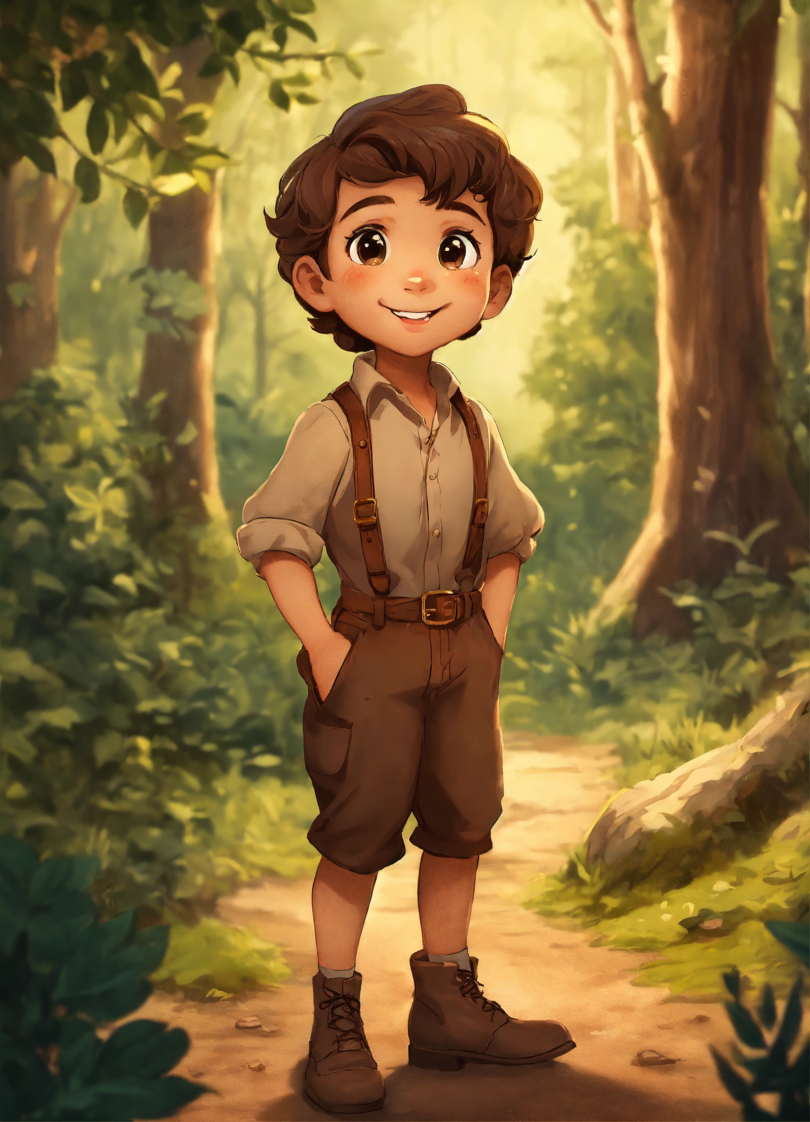 An adorable cartoon boy, full body portrait, missing two front teeth, brown hair, brown eyes, wearing in brown french country styled clothes in enchanted forest