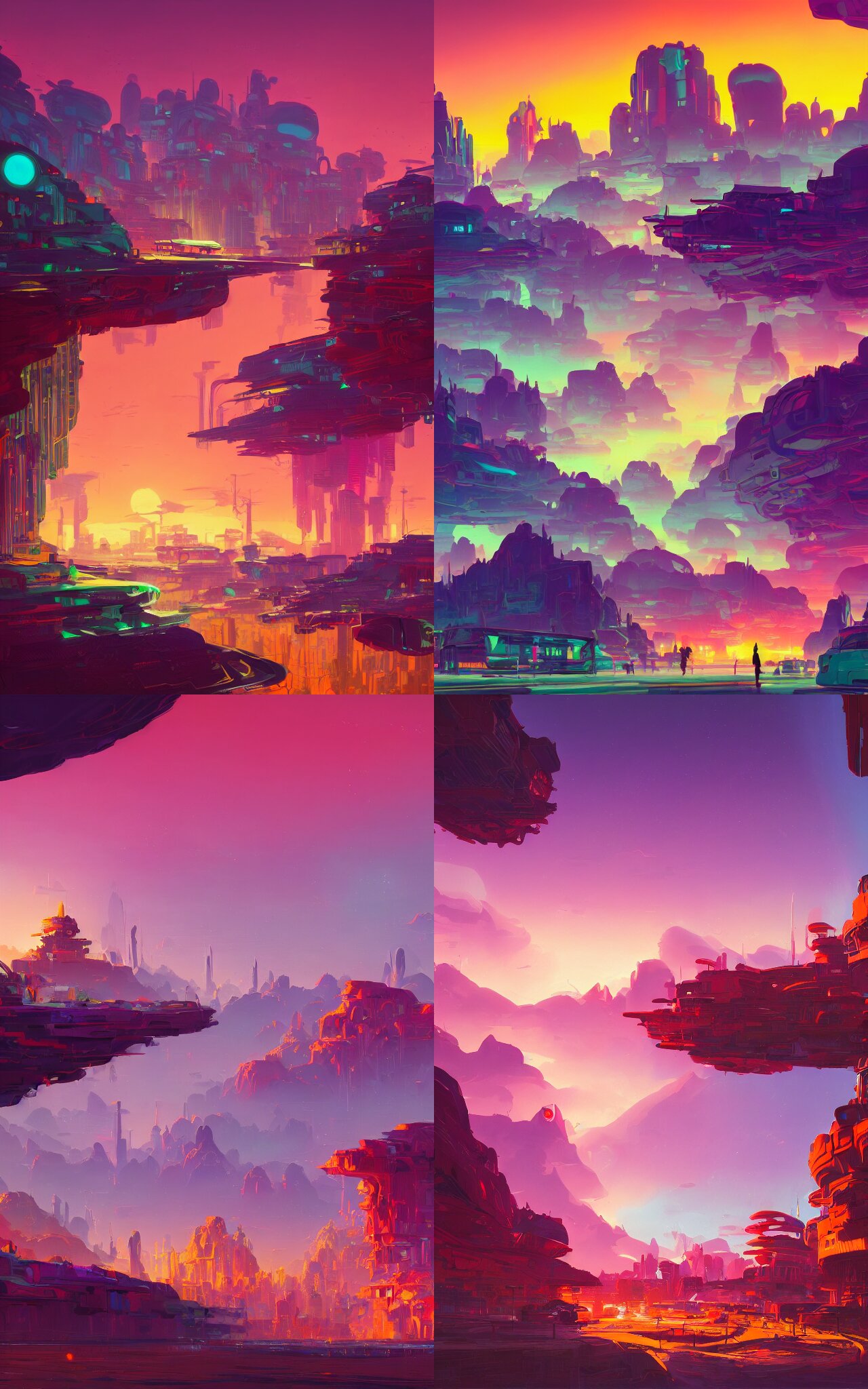 Detailed concept art of a dmt city in a fantastic landscape against a colorful sky, by syd mead, by noah bradley, by anton fadeev, by simon stalenhag