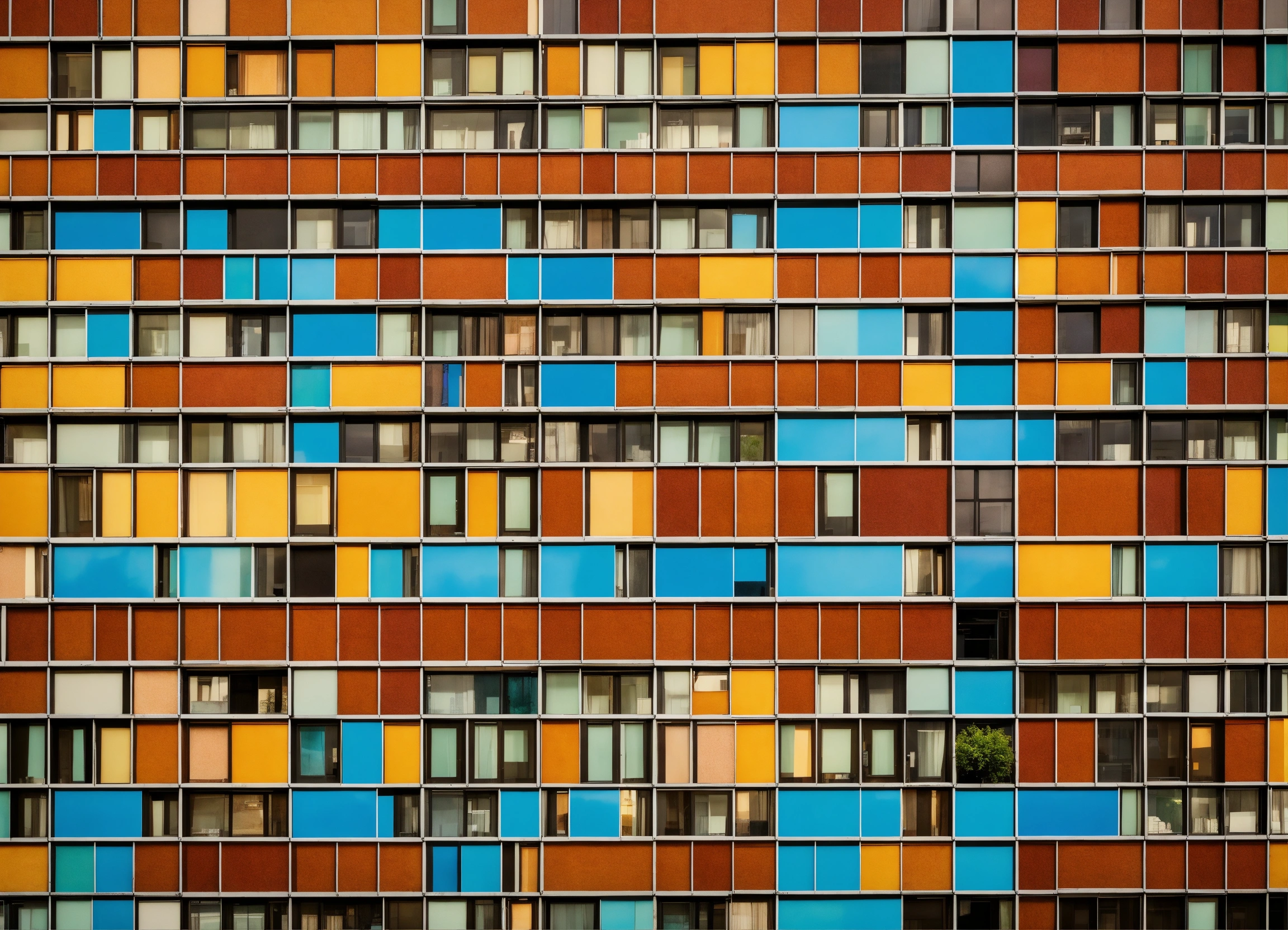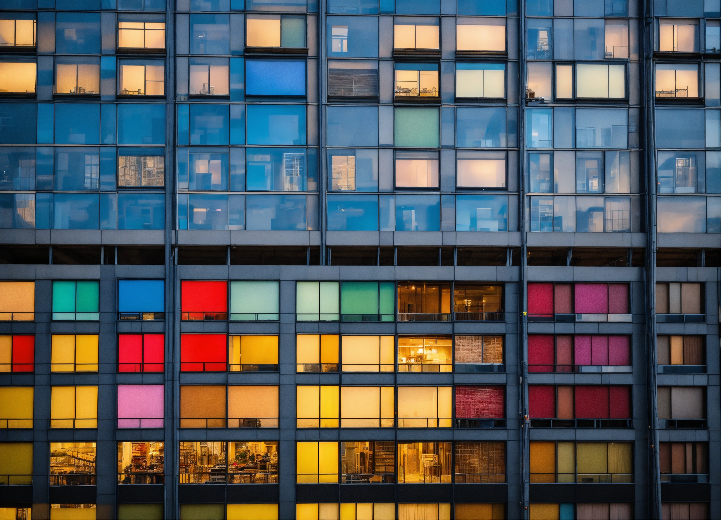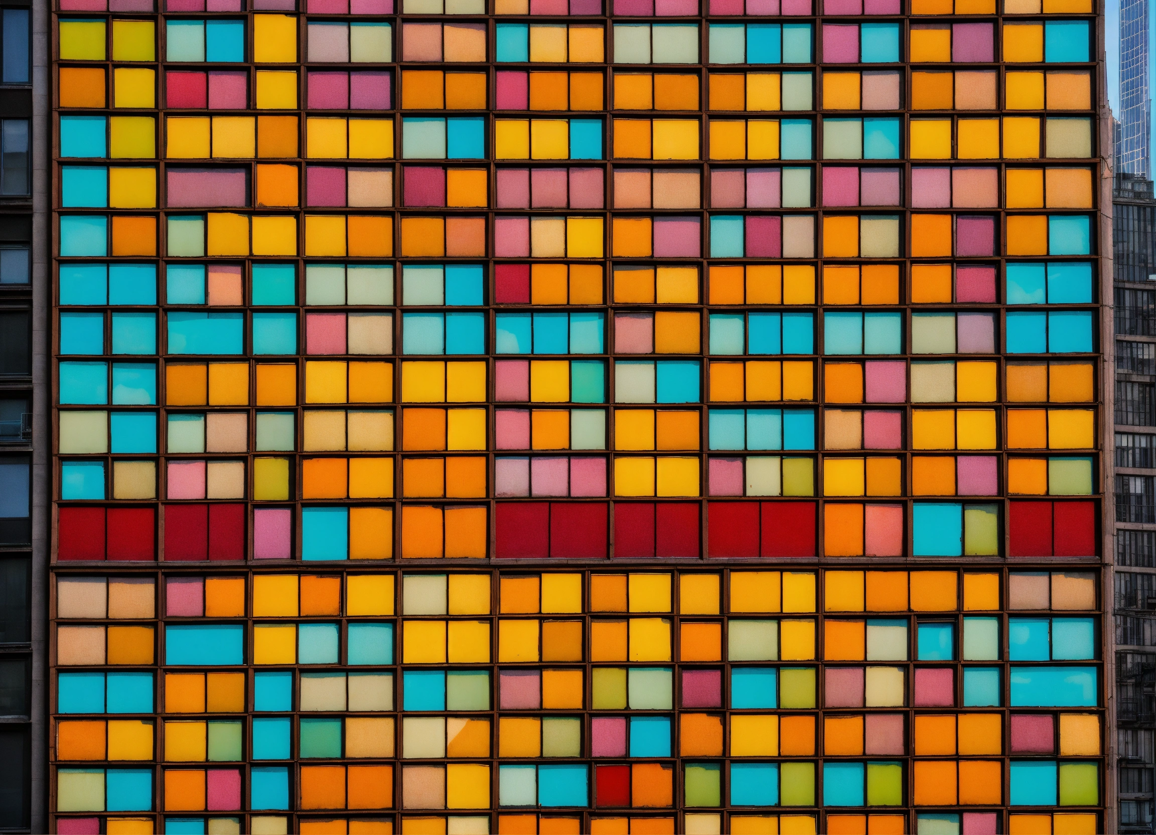 Une fenêtre avec 6 carreaux brisés avec des petits morceaux de verres en 3d de toutes les couleurs sur une façade ensoleillée de jour de face d'une tour de 80 étages à nex york
