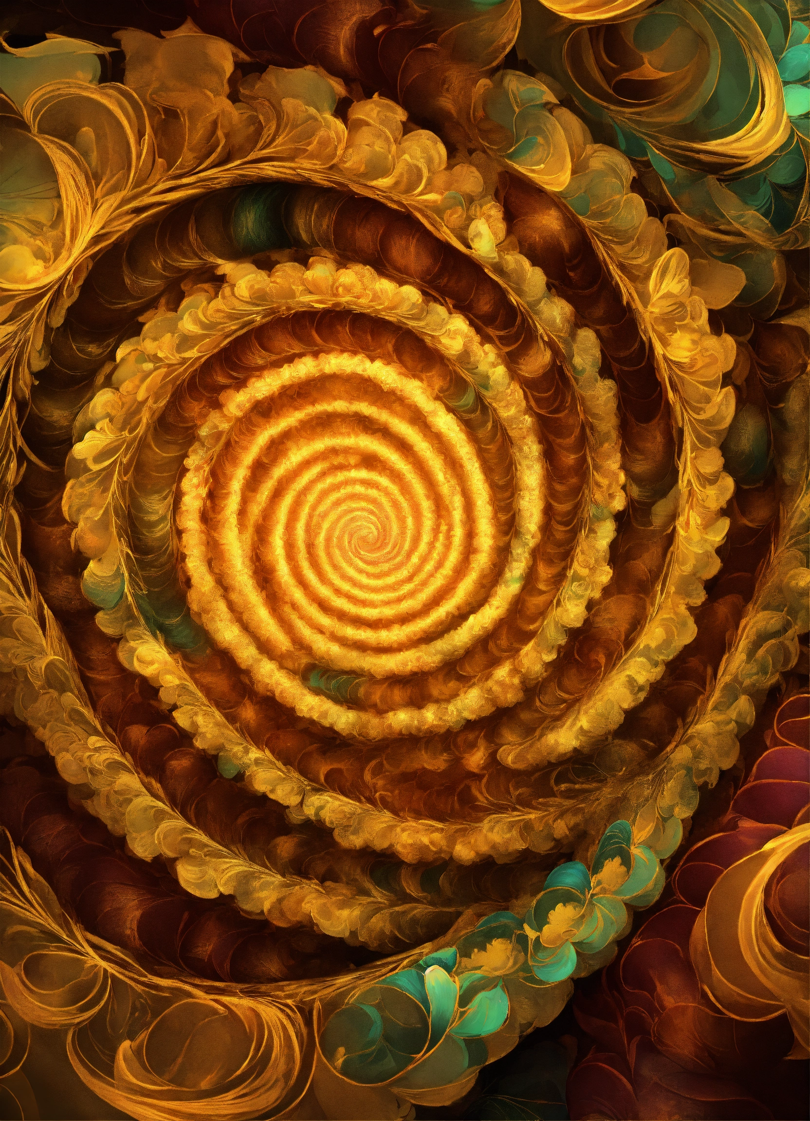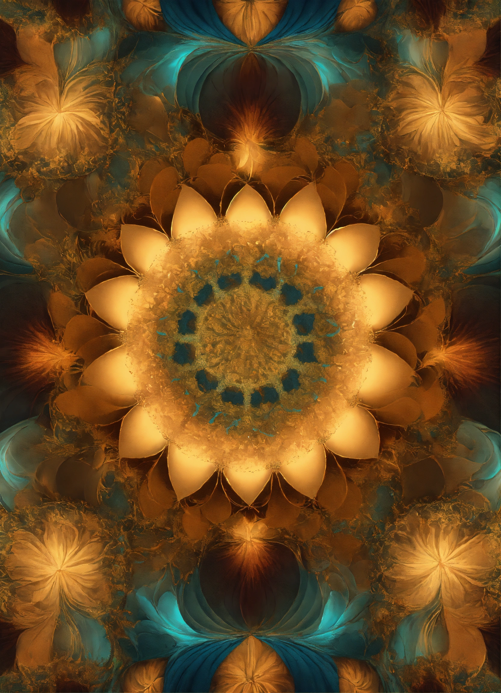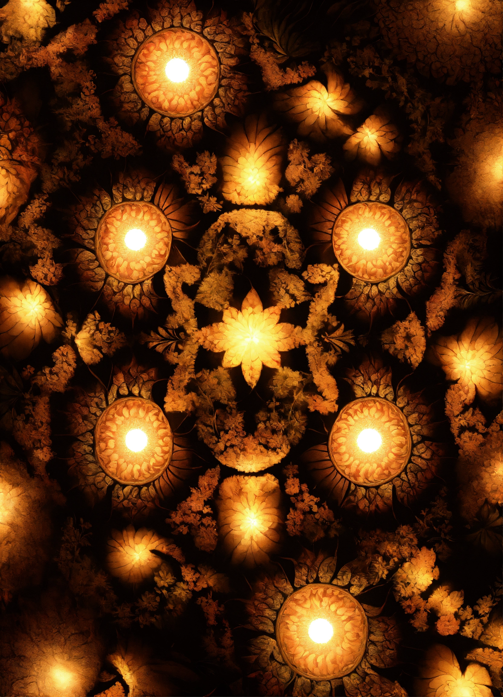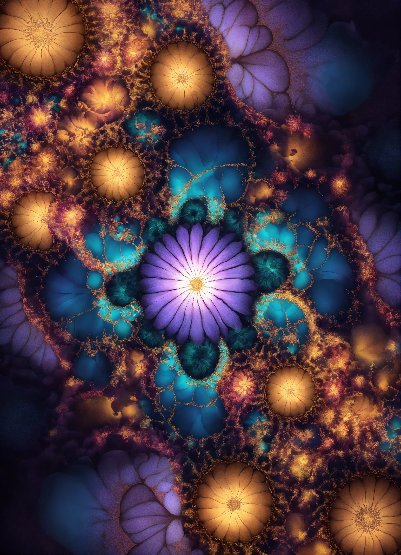 Using repeating fractal patterns, create a stunningly beautiful image that depicts the feeling of happiness and hope. while using darker color palette.
