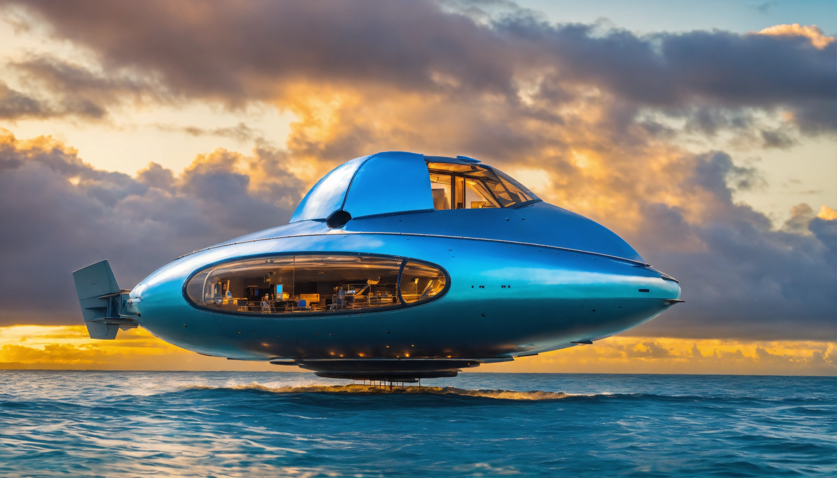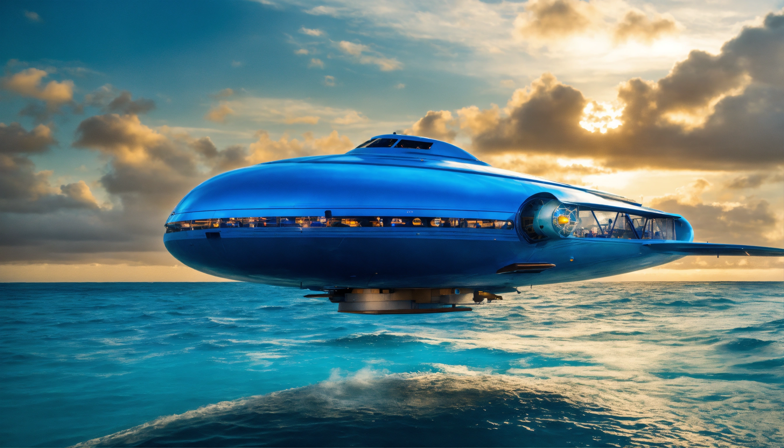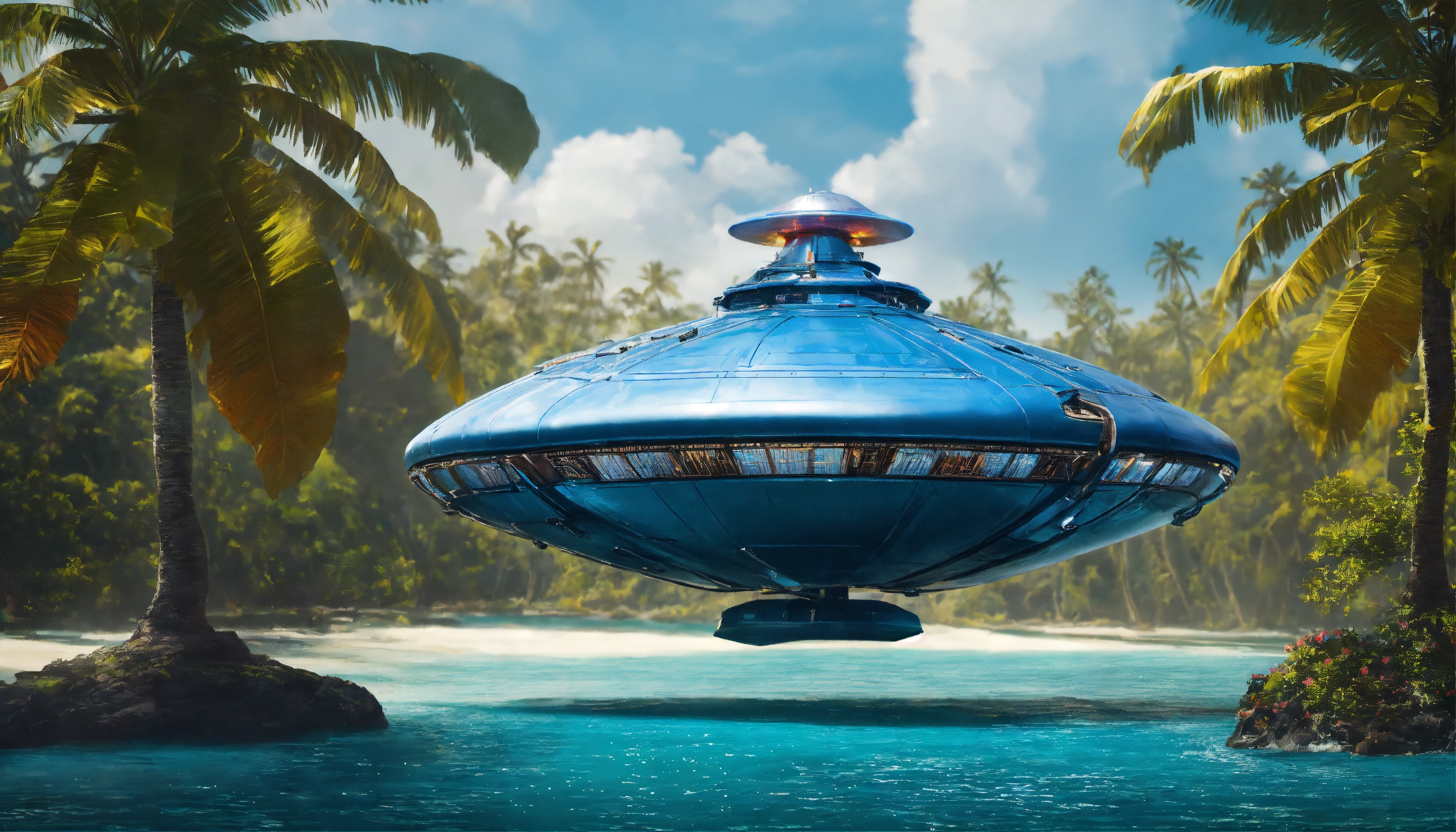 A flying round blue metal spaceship above the water in the polynesian sea