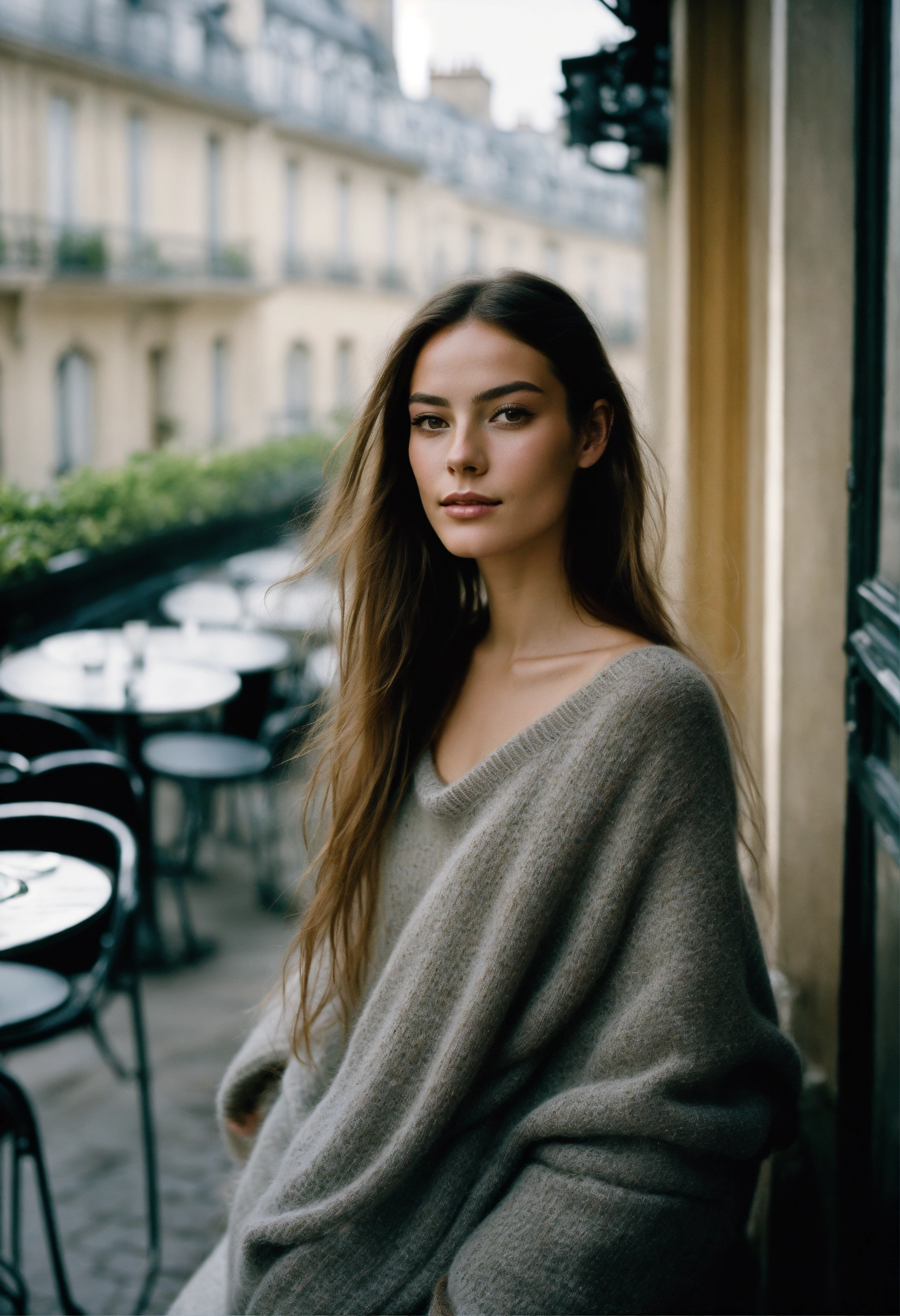 Portrait of a beautiful french fashion model with long flowing hair and leggings and oversized sweater, ethereal dreamy foggy, photoshoot by henri cartier bresson, editorial fashion magazine photoshoot, fashion poses, in front of parisian café terrace. kinfolk magazine. film grain. a soft smile