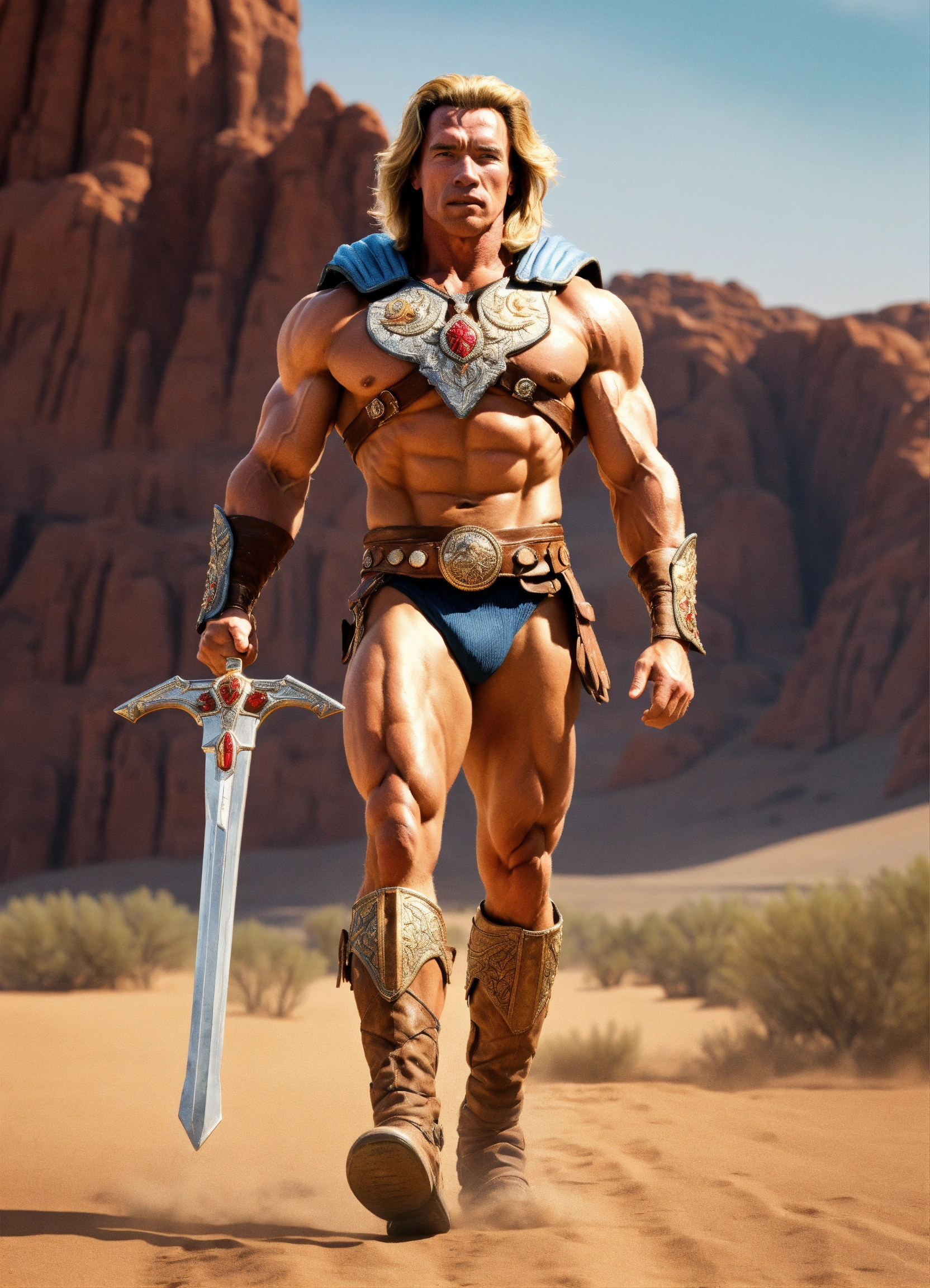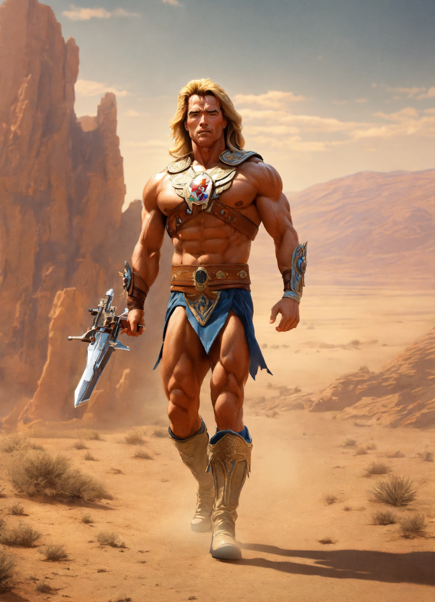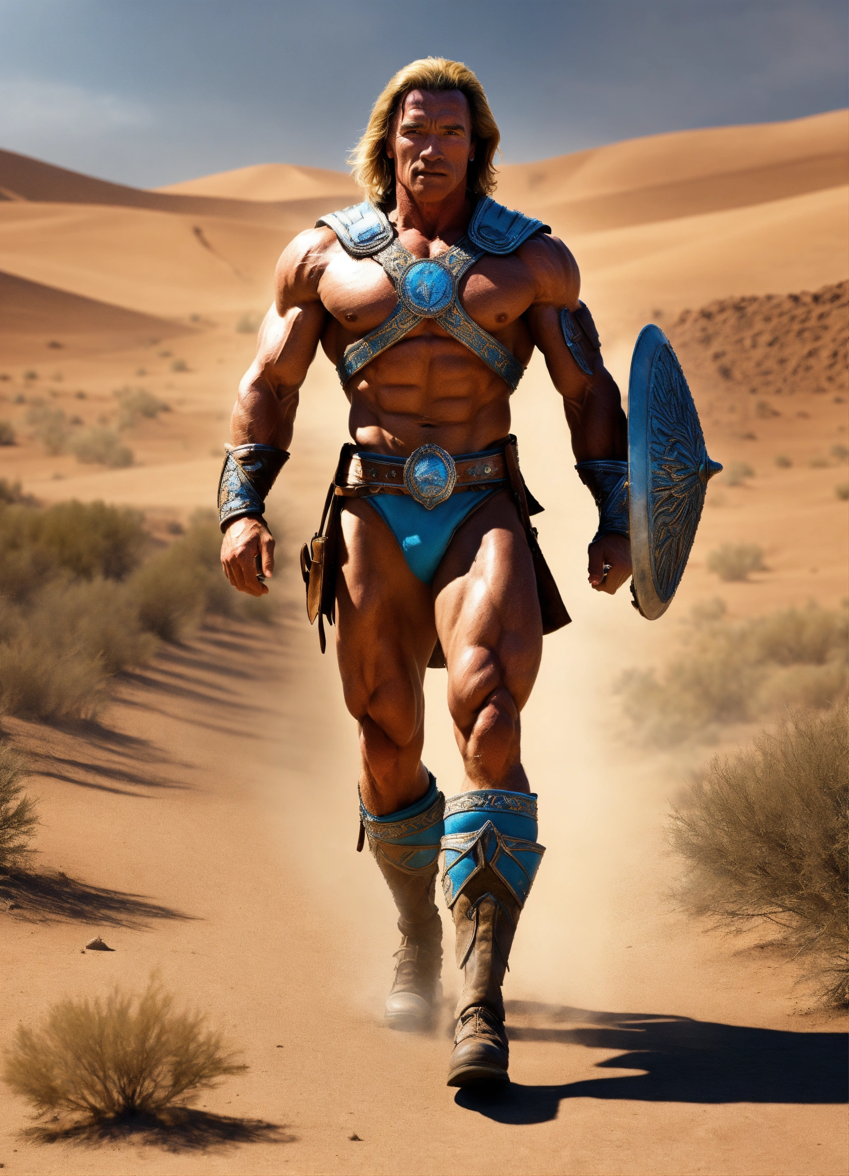 Young arnold schwarzenegger with long blonde hair, dressed like he-man of masters of the universe, full body, walking in a desert, 8k resolution, photorealism, hard light photo, hyper detailed, intricately detailed