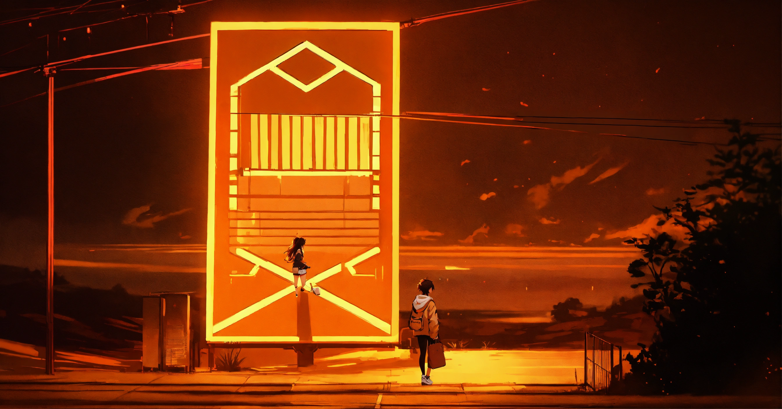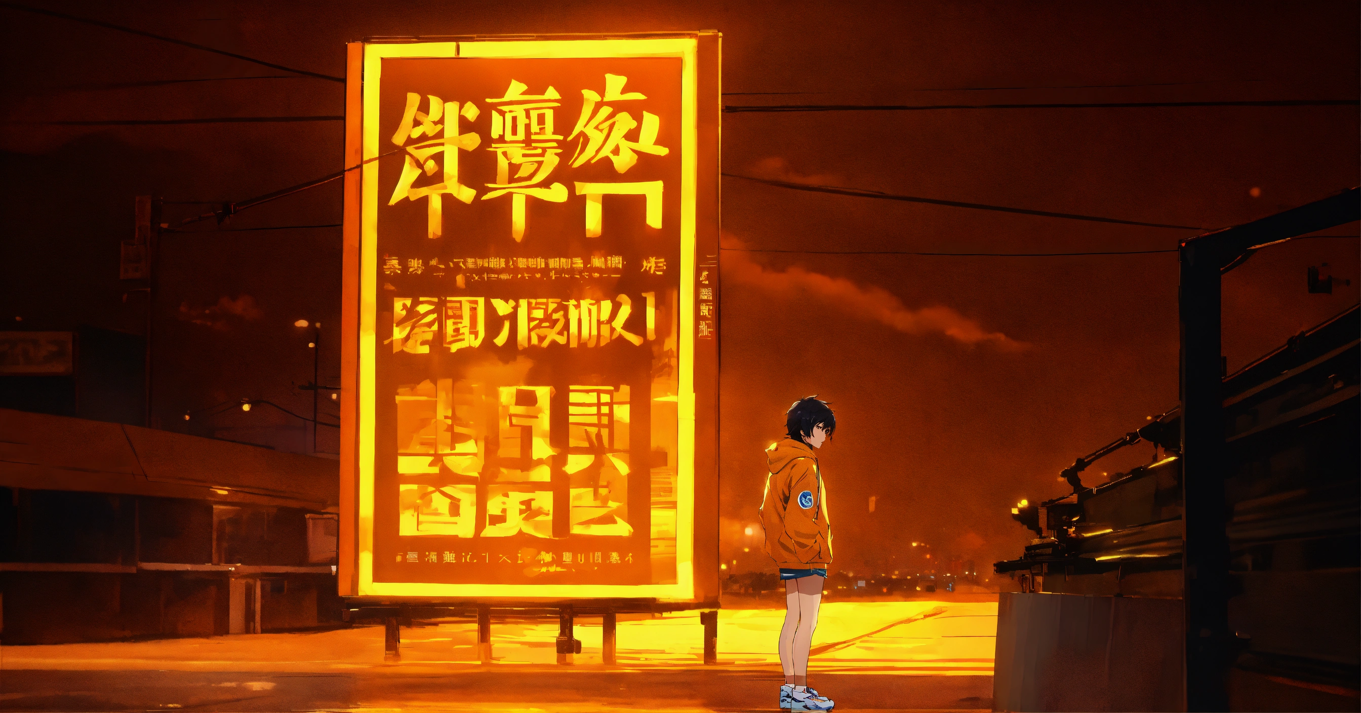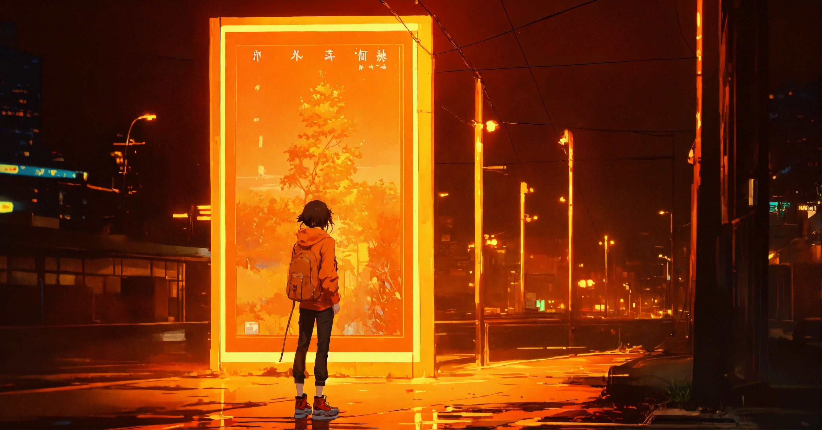 Exact copy of image, exact copy of image, as a billboard with guweiz style and in makoto shinkai style, anime, hd, retro vibe wide zoom, 80mm, with person in orange hoodie