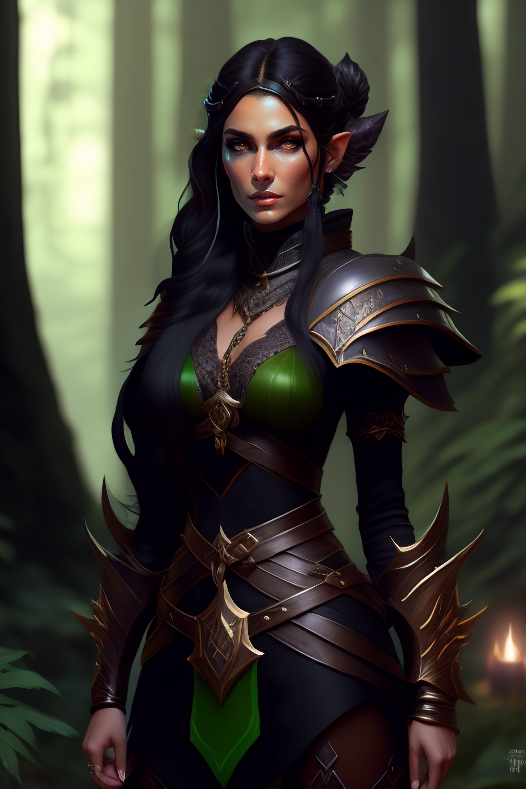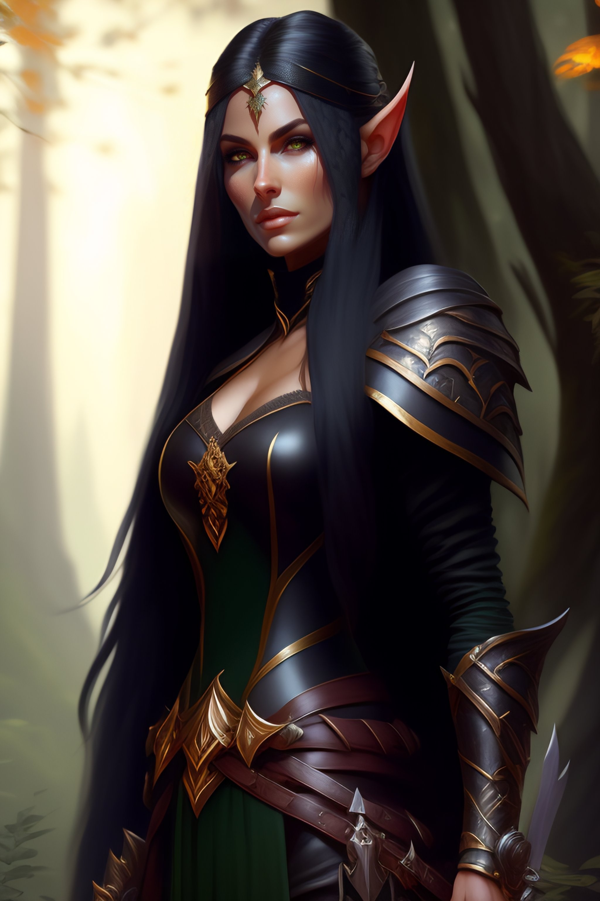 Rogue, elf female, black clothes, sword in hand, full body, forest, d&d, fantasy, intricate, elegant, highly detailed, digital painting, artstation, octane render, concept art, matte, sharp focus, illustration, hearthstone, art by artgerm and greg rutkowski and alphonse mucha