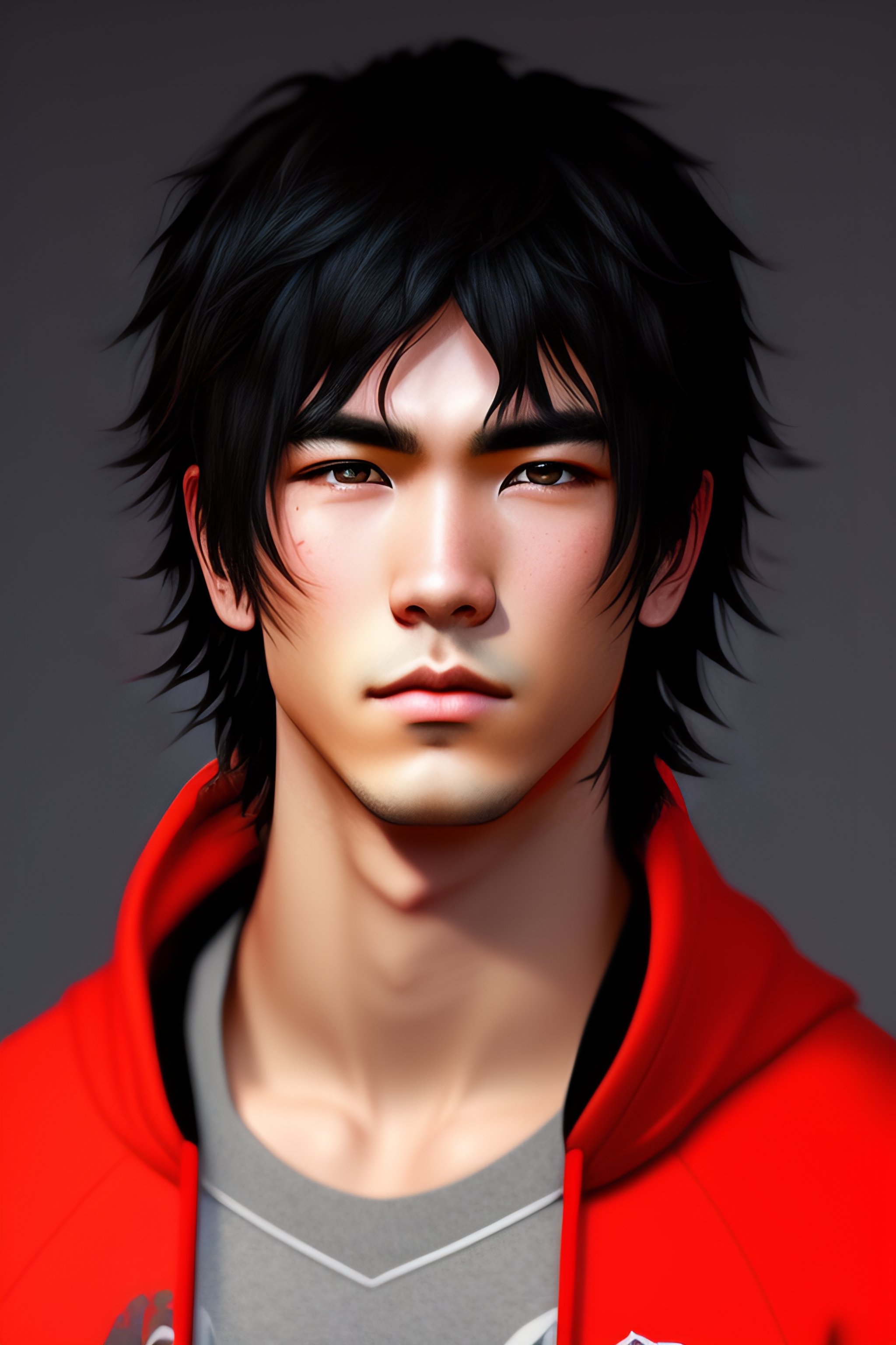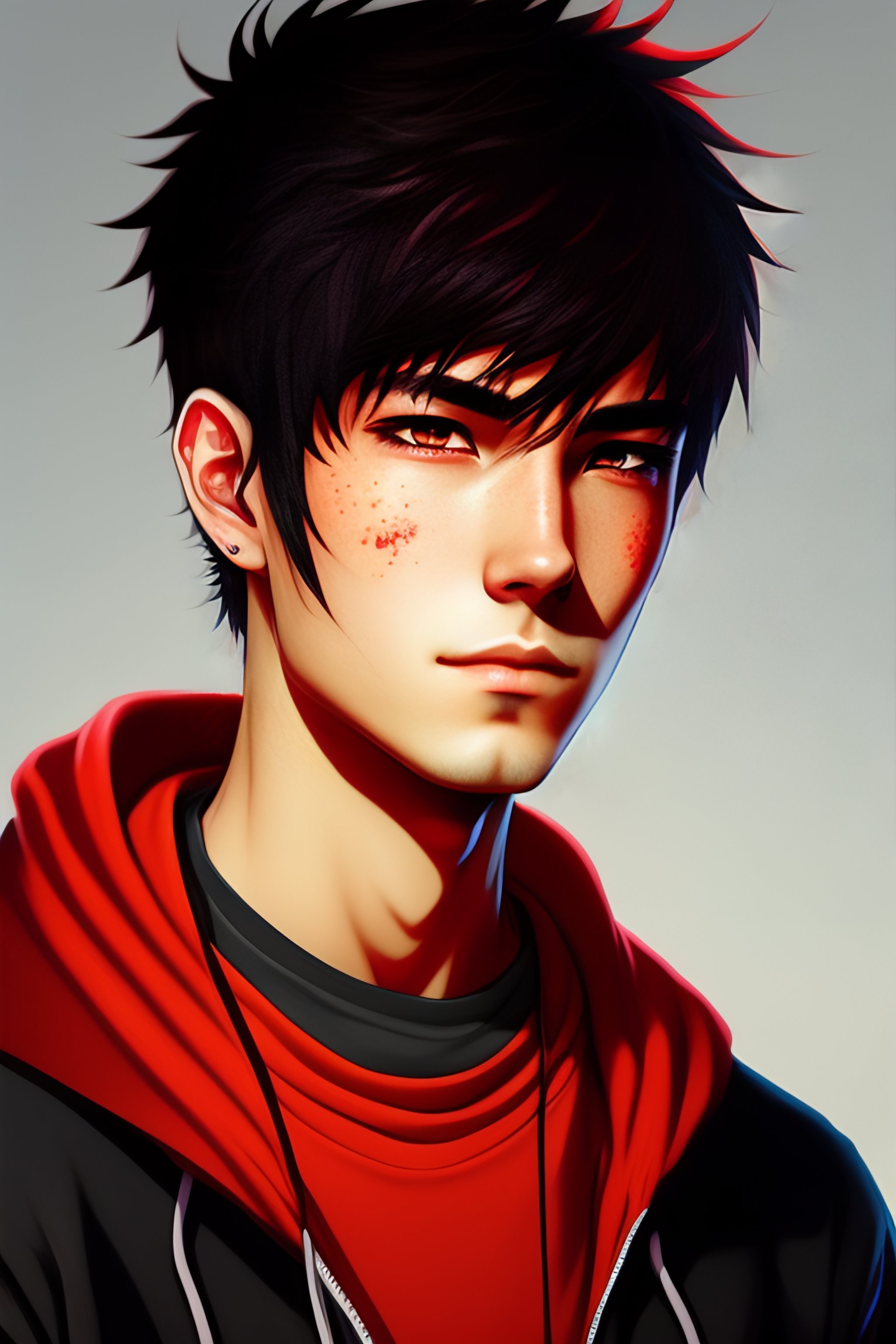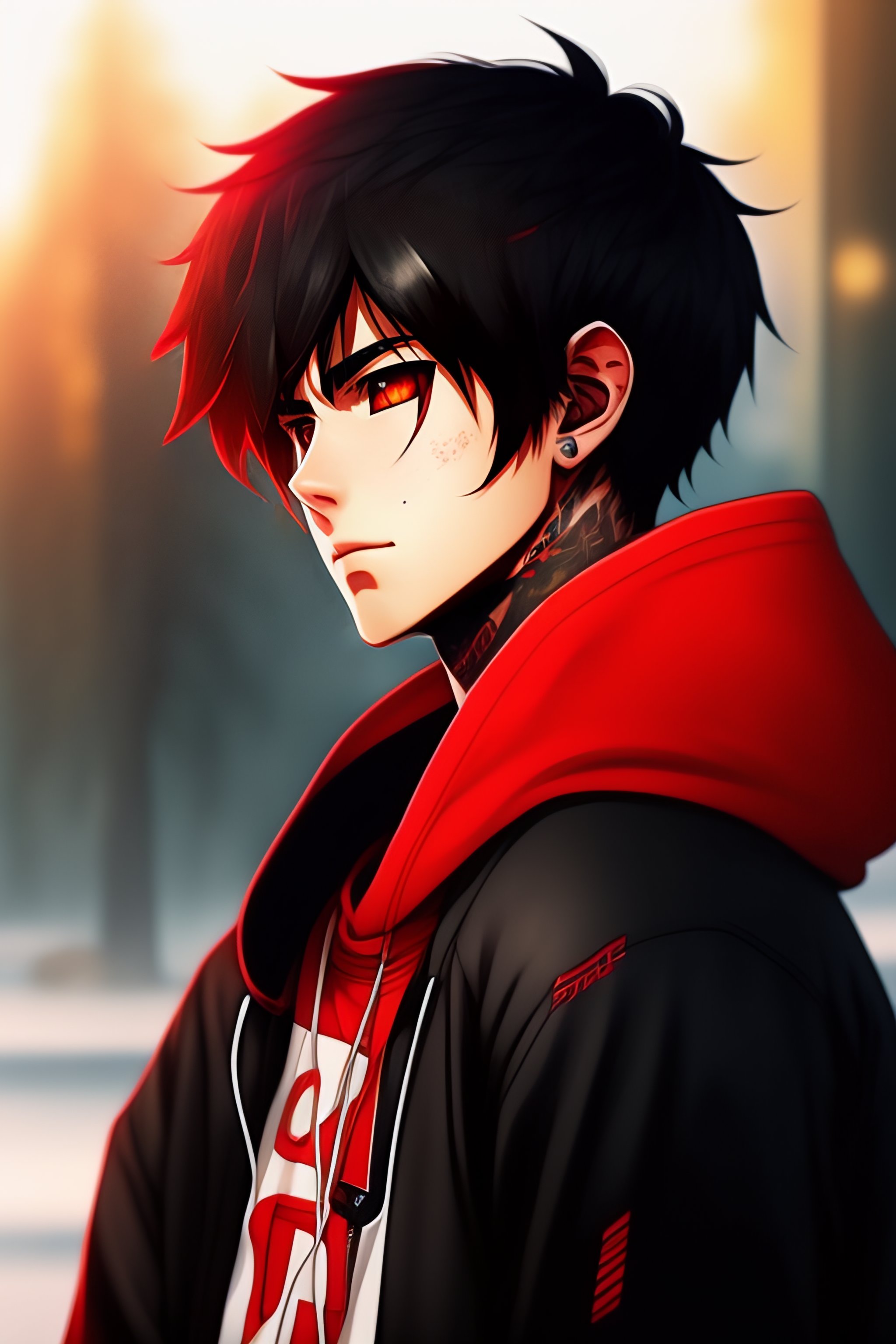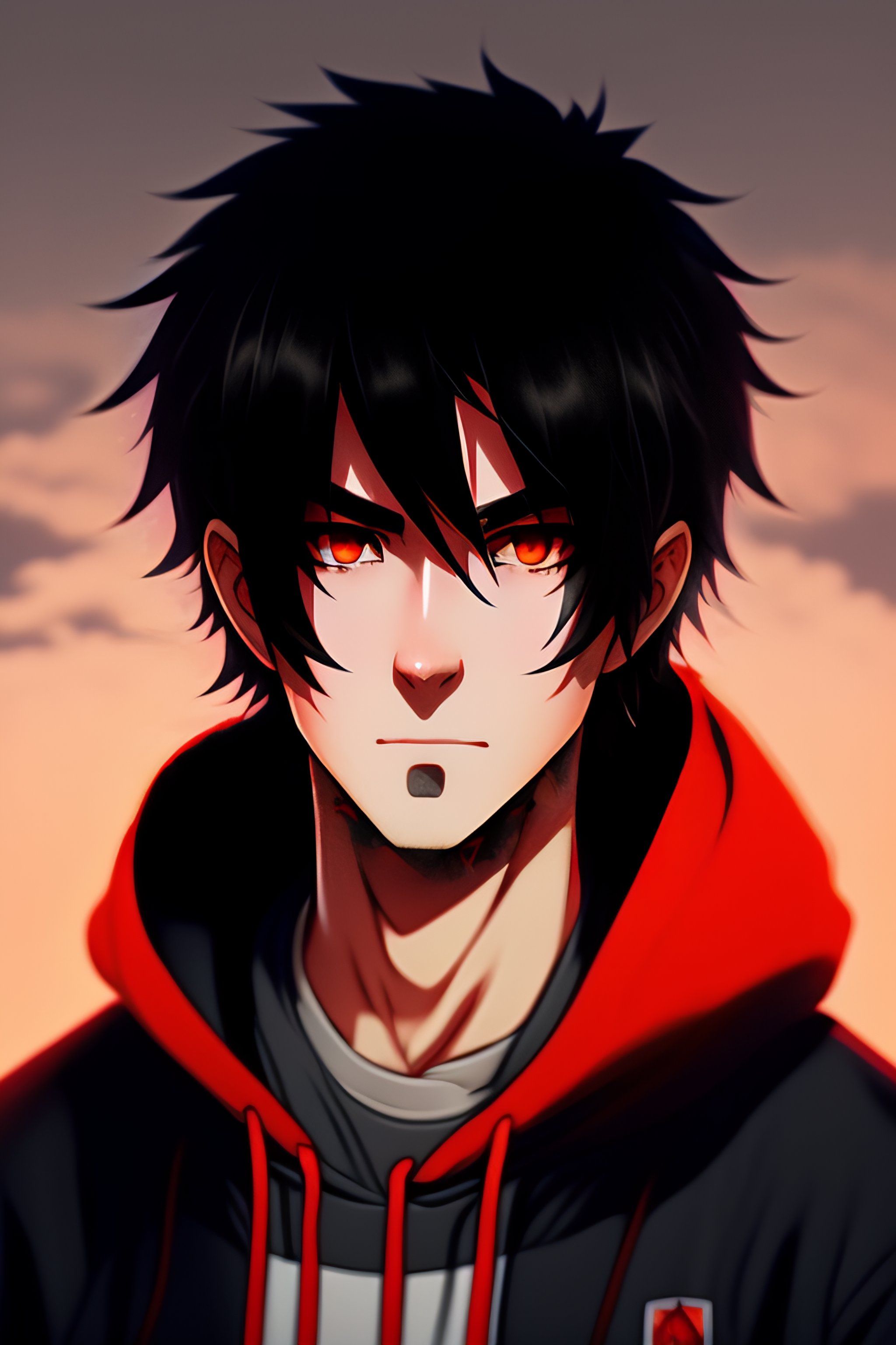 Anime young adult man with black messy hair halfway down the back, red eyes and red tattoos under eyes, sad face, black hoodie