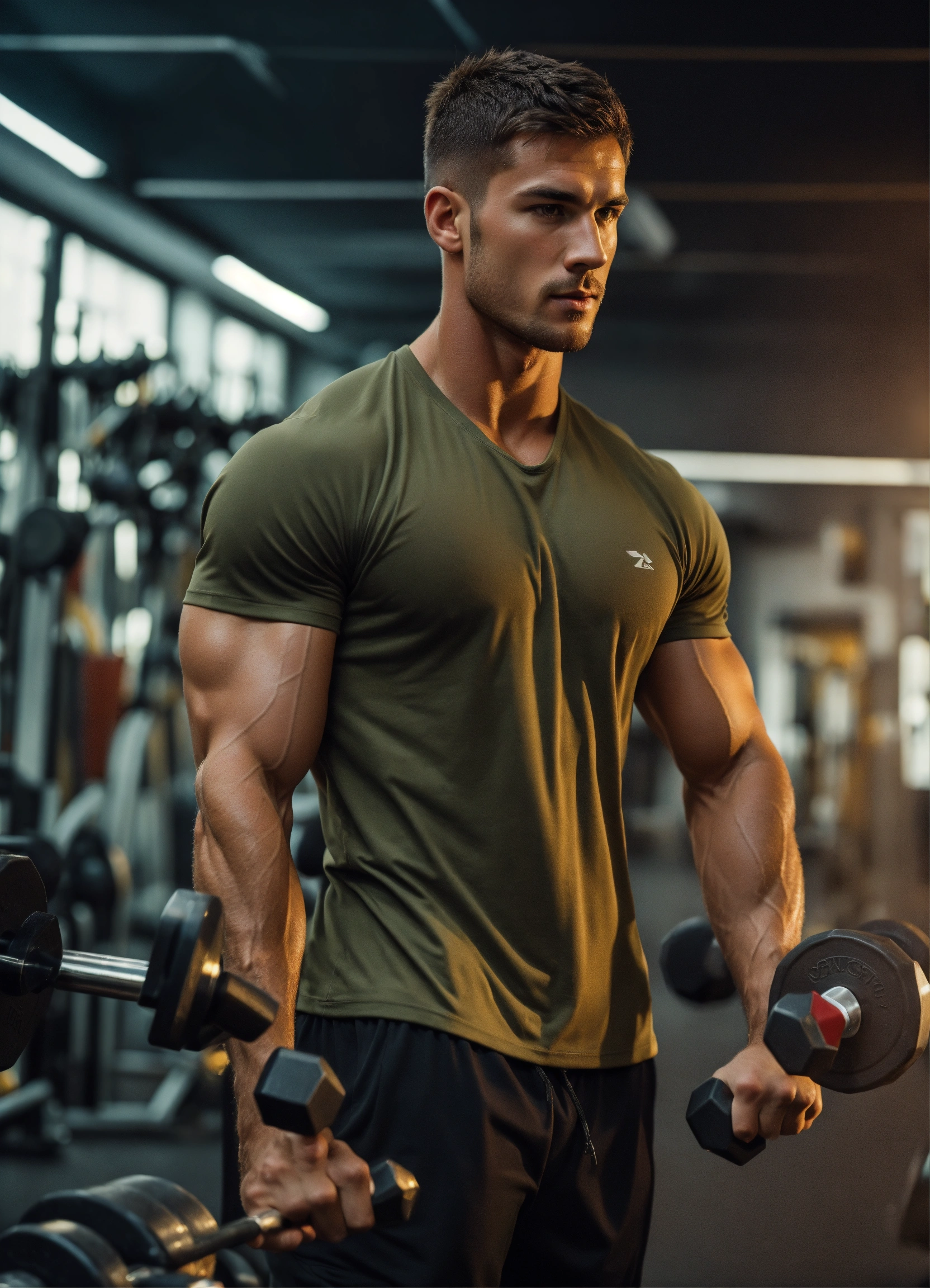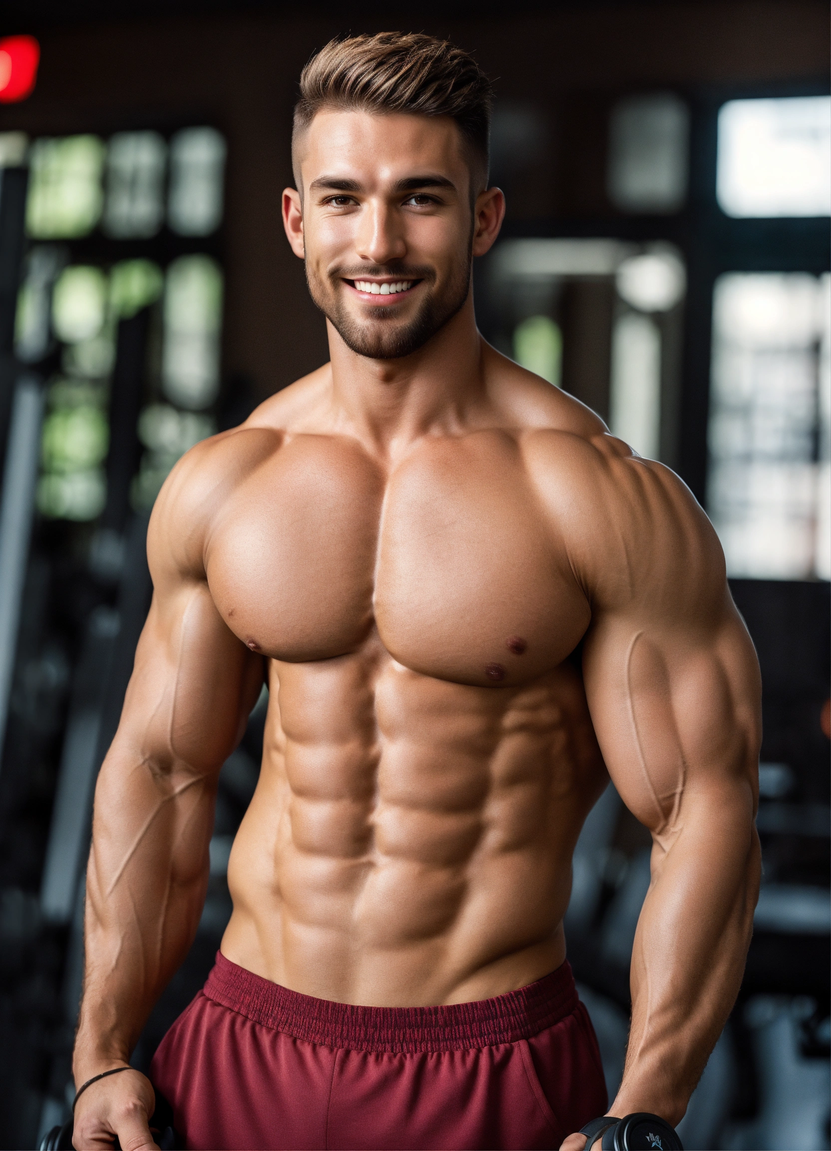 European and american men, short hair, big eyes, high nose bridge, working out in the gym, well-developed body muscles, especially chest muscles, abdominal muscles, arms and leg muscles, relatively heavy weight, but well-proportioned body, regular exercise, focusing on fitness and eating and dressing are usually more appropriate to highlight the body's advantages, and have a confident and determined personality, high definition 8k