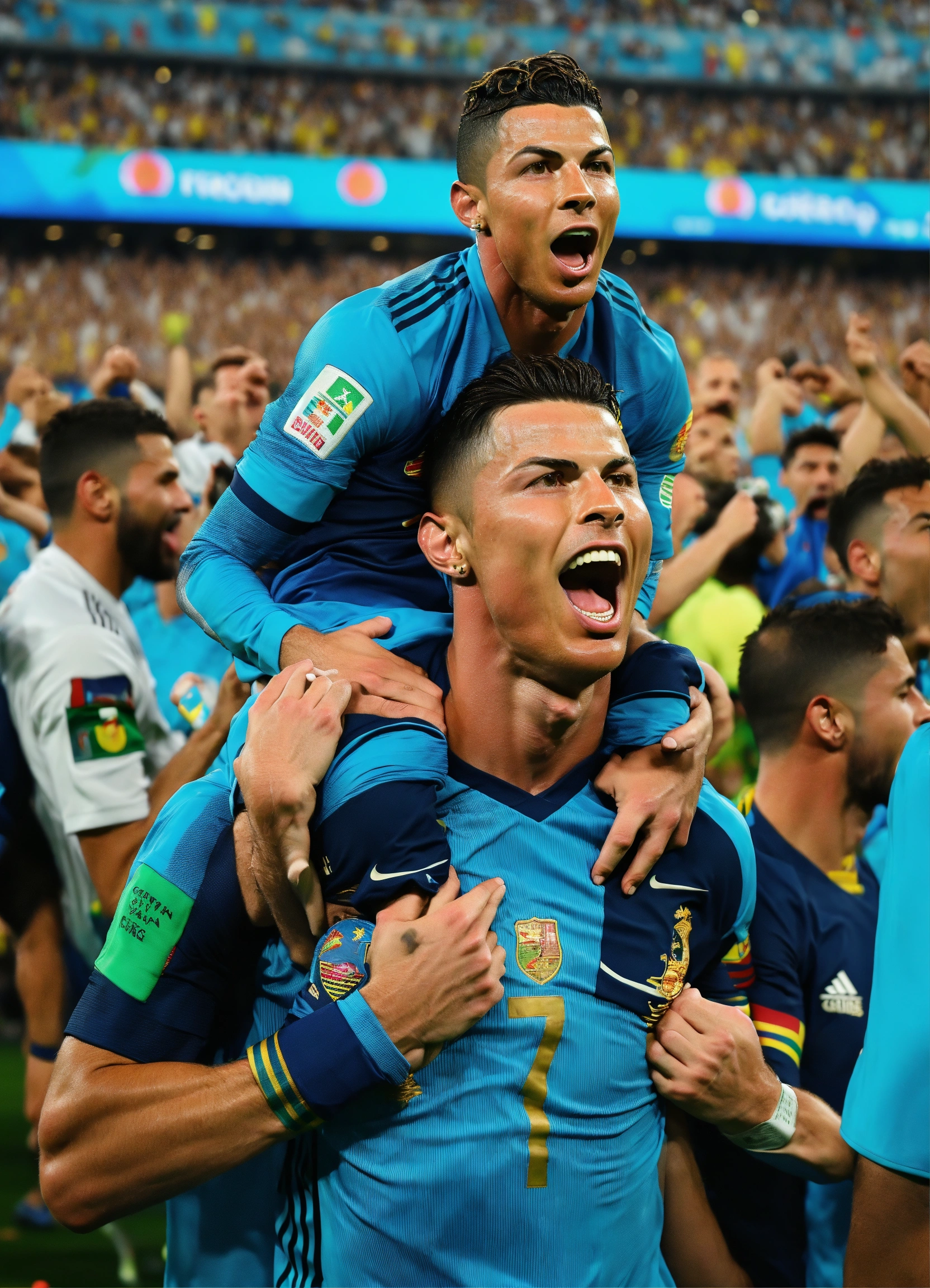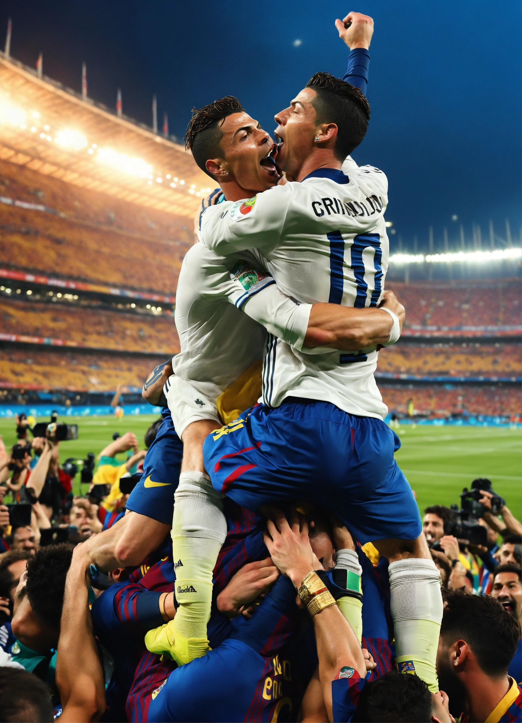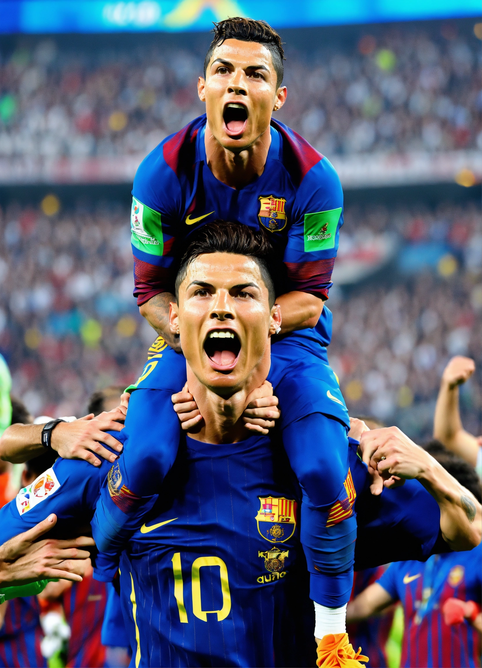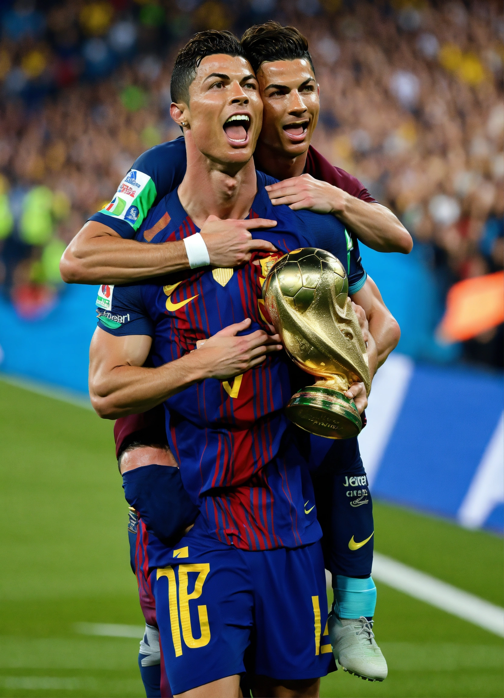 Cristiano ronaldo holding leo messi in his shoulders and they are both screaming in victory winning the world cup being in the same team in the middle of a massive football field and fans cheering them