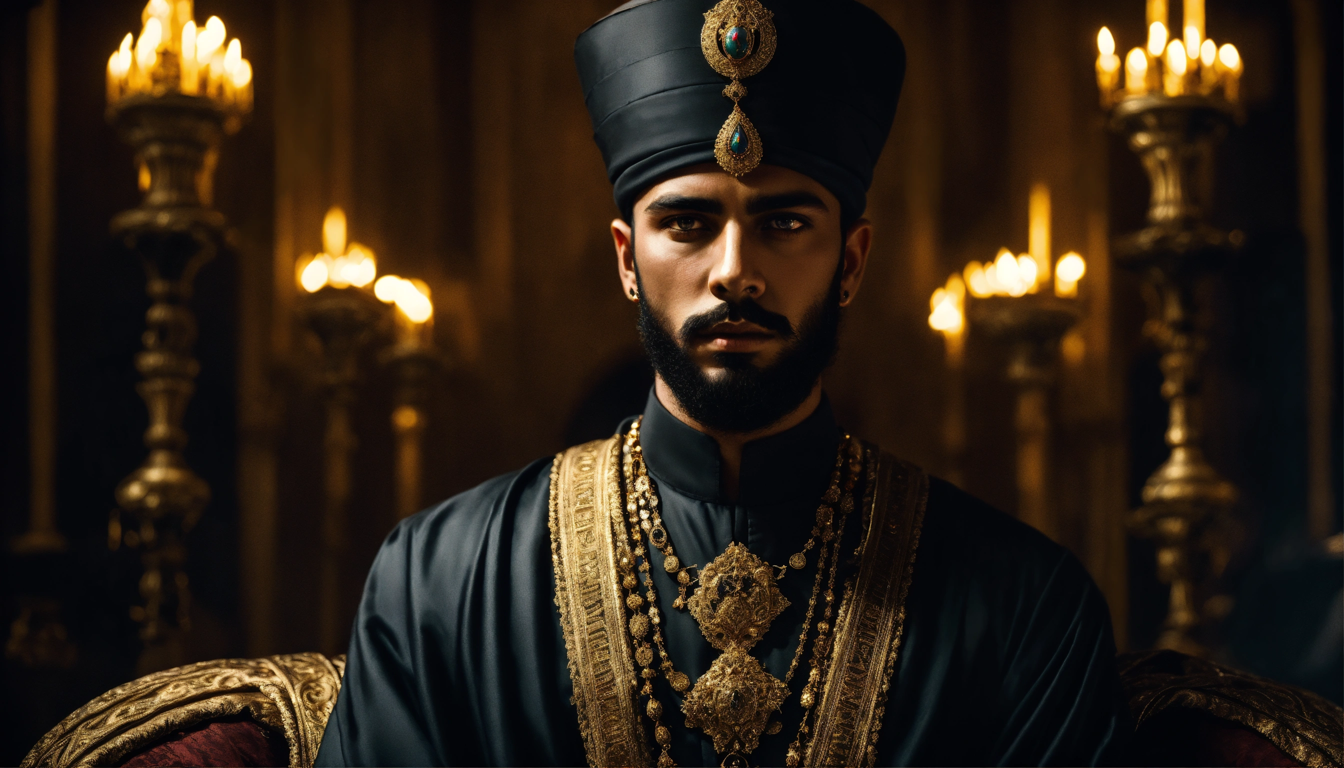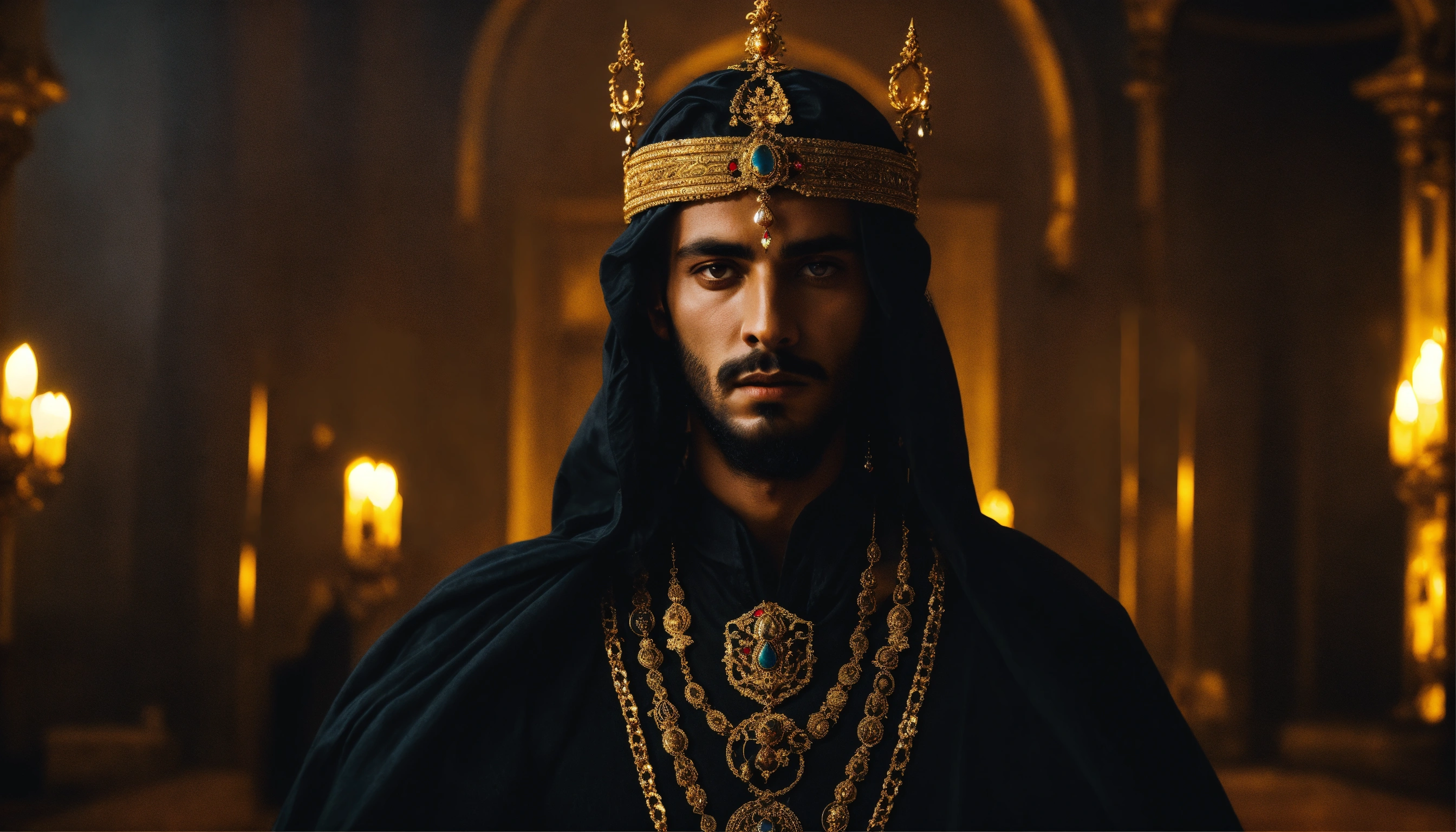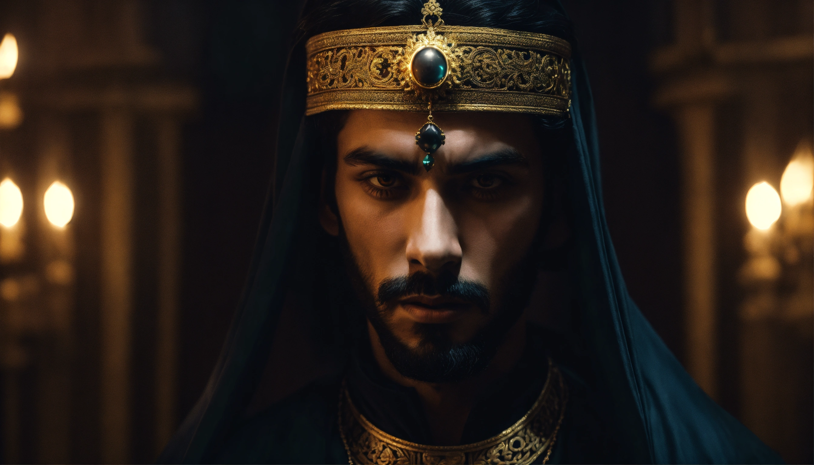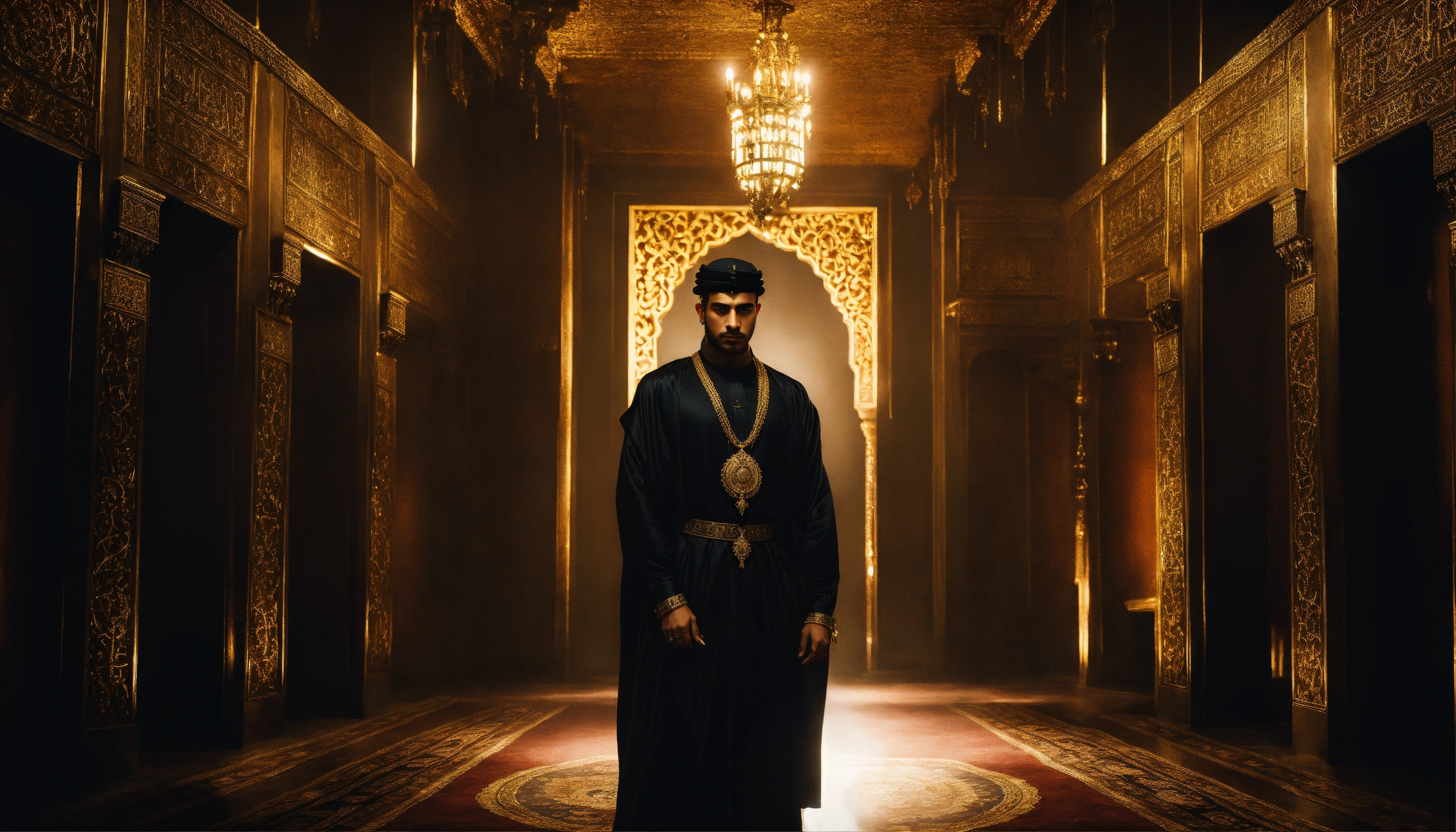 Dark, mysterious and dramatic portrait of a young handsome ancient arabic tyrannical ruler with glowing eyes wearing dark clothes and gold ornate jewellery in a sinister, dimly-lit palace chamber.