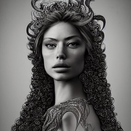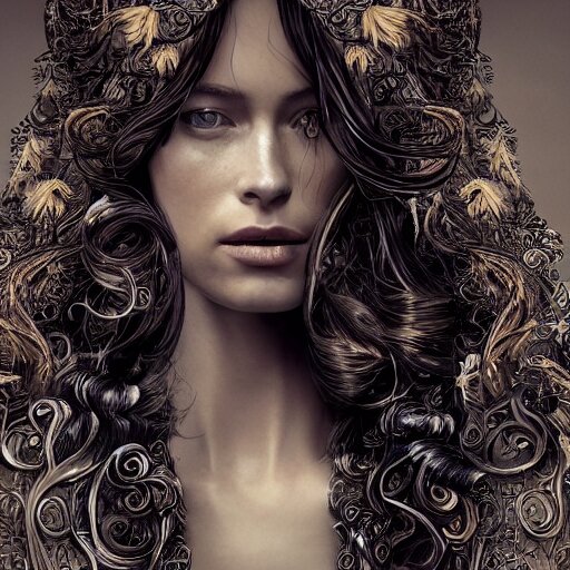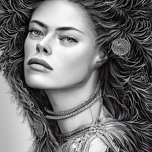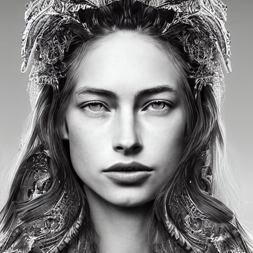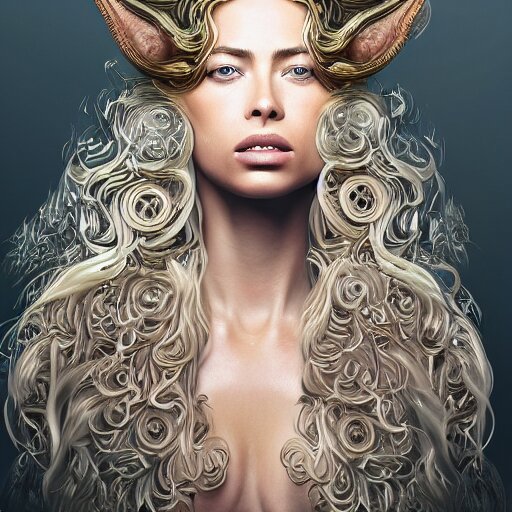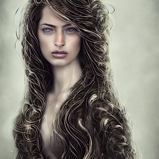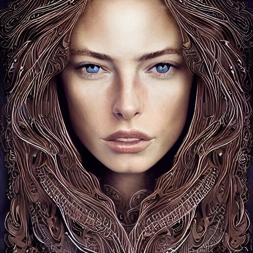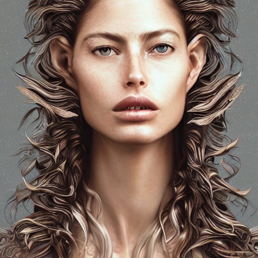 8 5 mm f 1. 8 portrait of a girl that is a mixture between claudia guarnierni and doutzen kroes, she is about 2 5 years old, long curly hair, she is wearing a ornate elven robe with feathers by iris van herpen, highly detailed, digital painting, artstation, concept art, smooth, sharp foccus ilustration, artstation hq