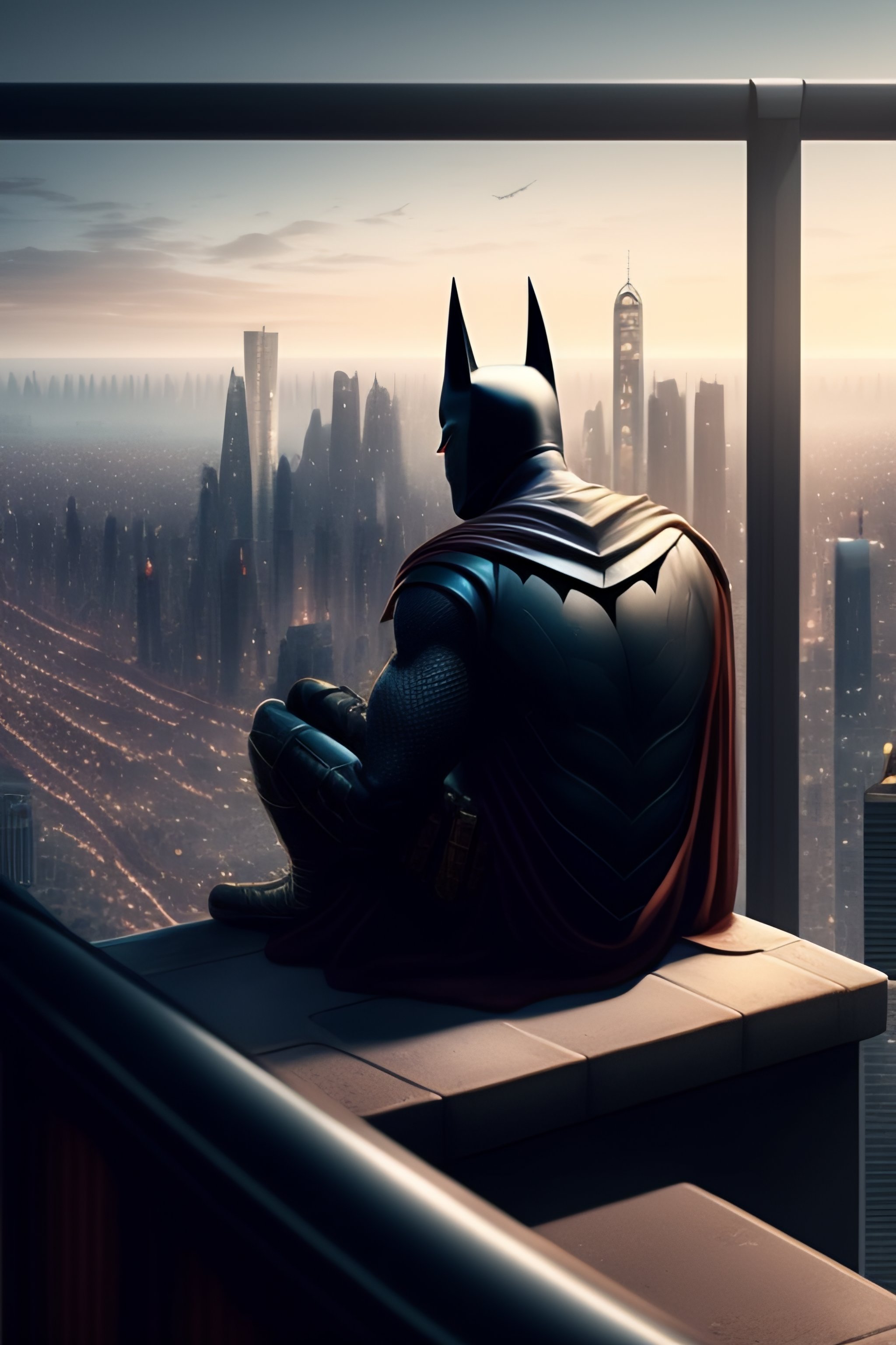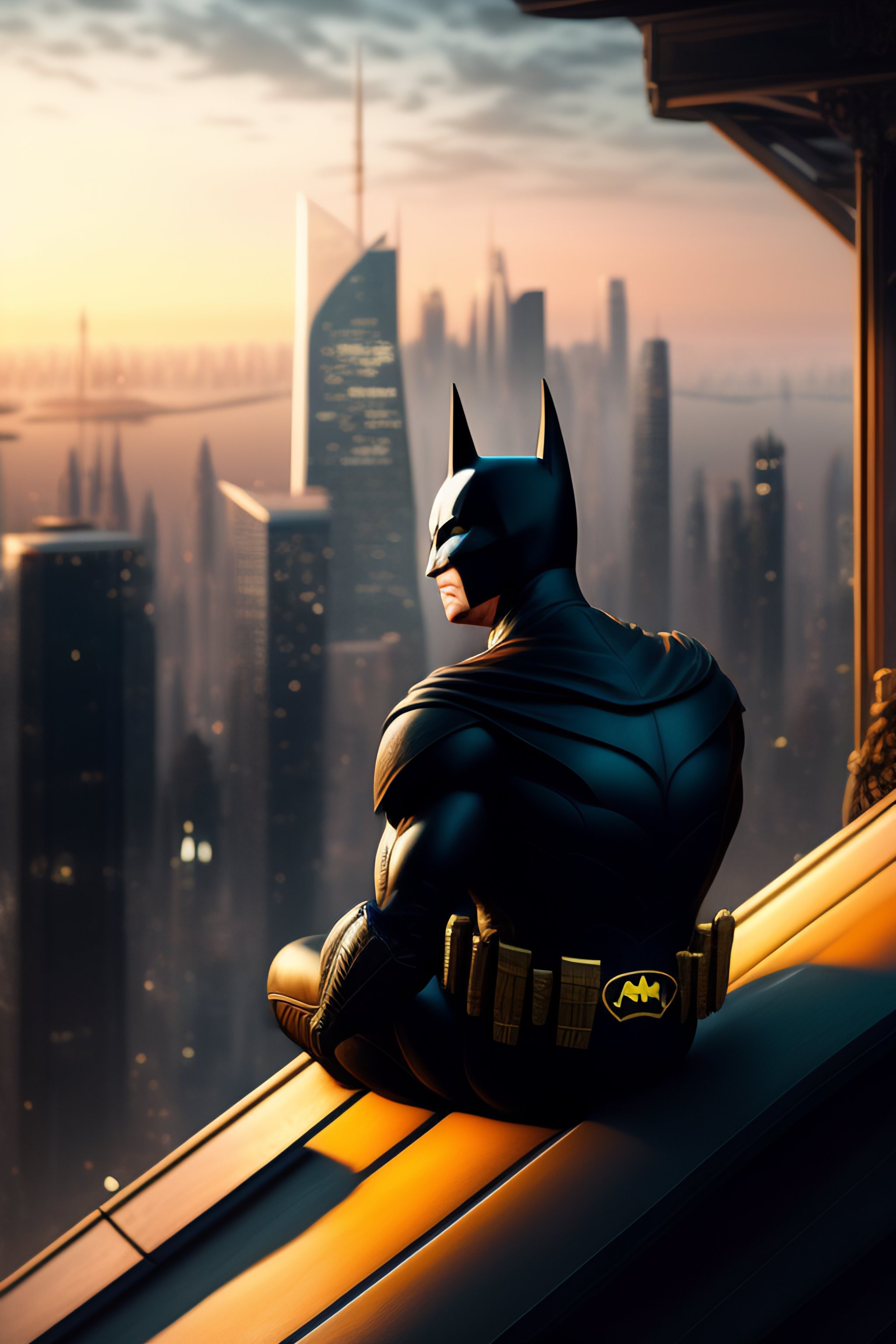 Batman sitting on a roof looking down at a city below