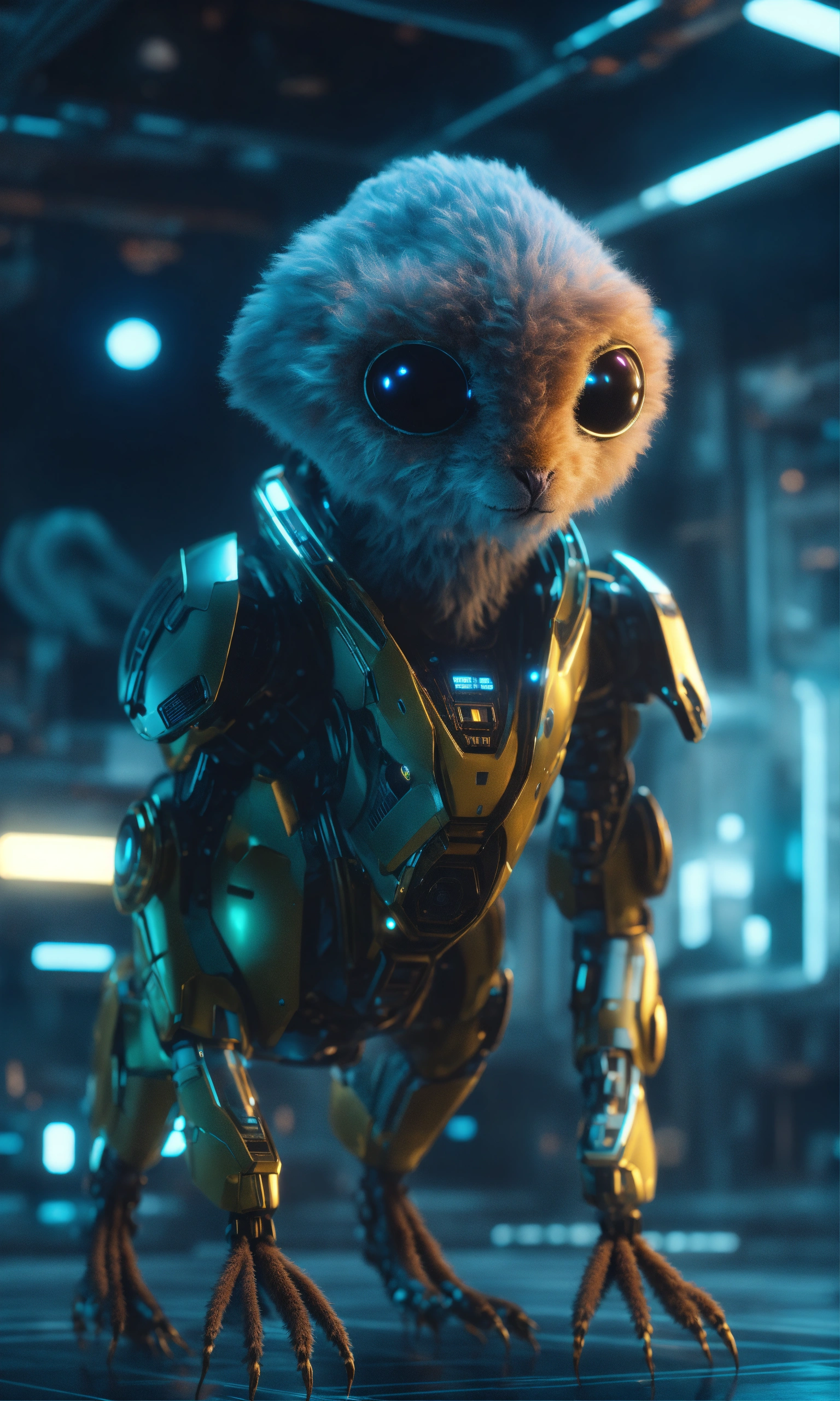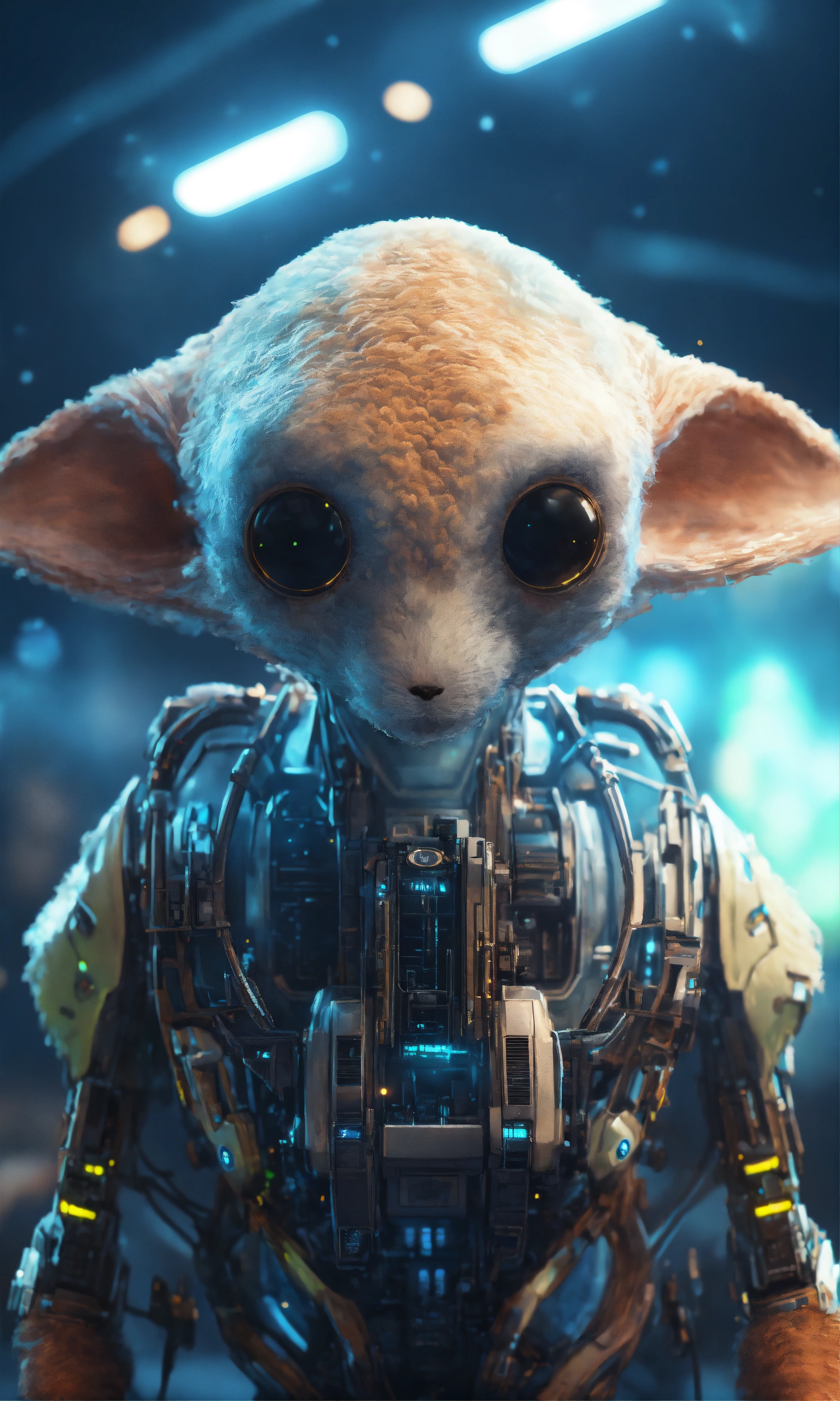 Zoom out of a wise fuzzy alien creature in a open space, hi tech mother ship, realistic, futuristic, sci-fi, 8k