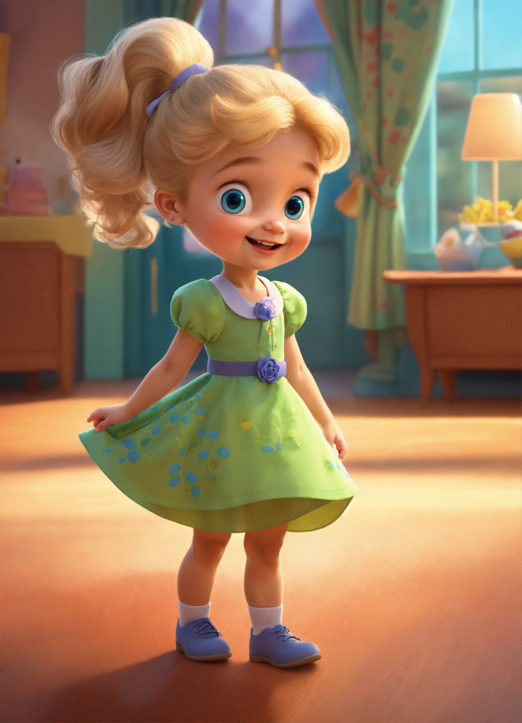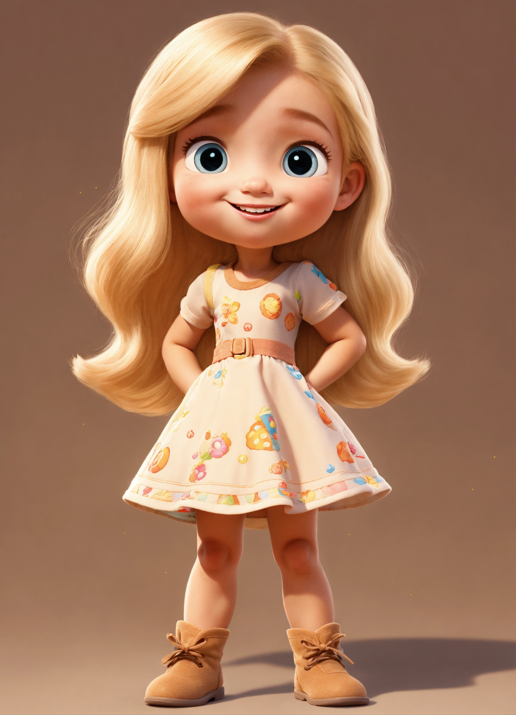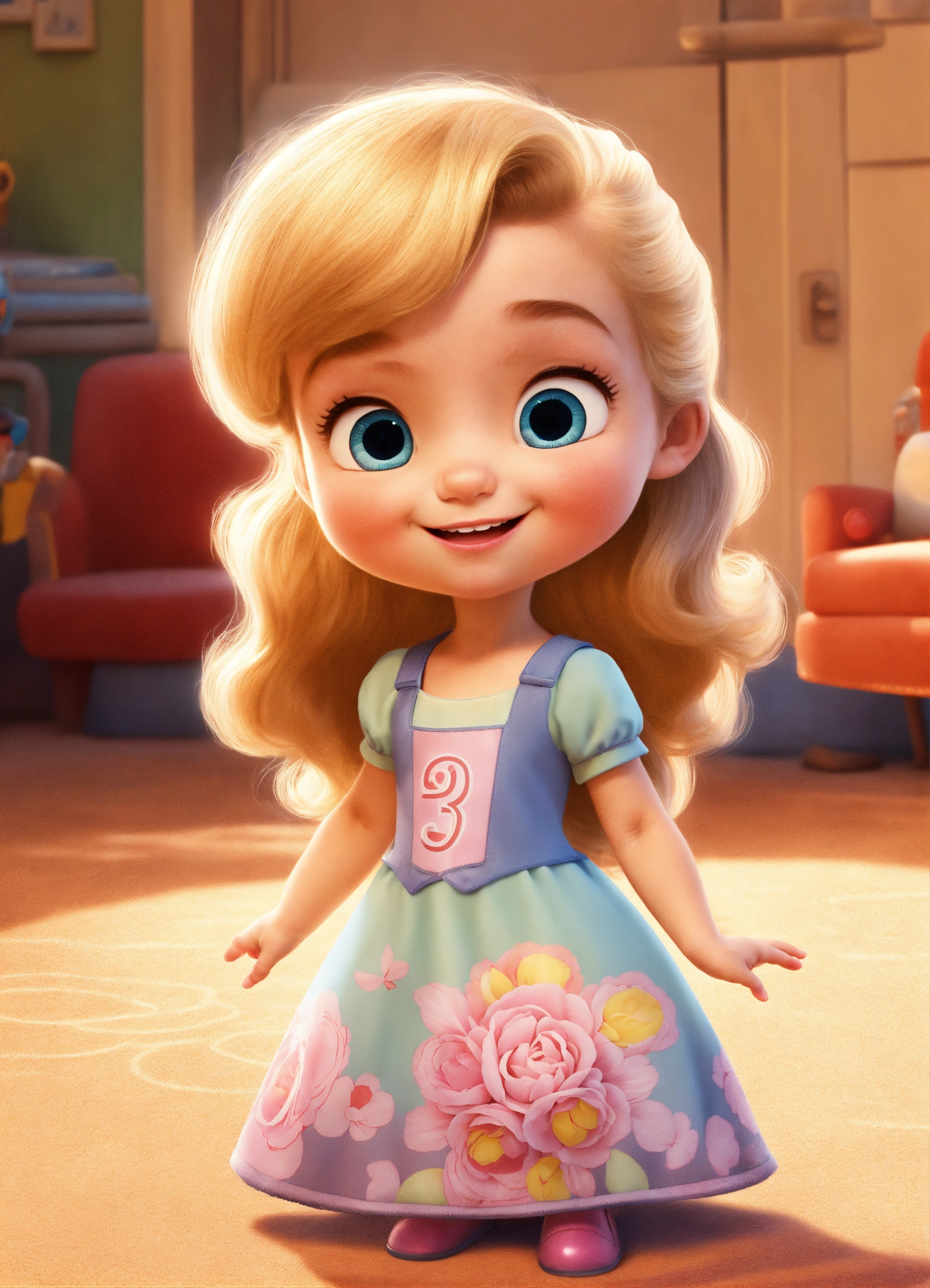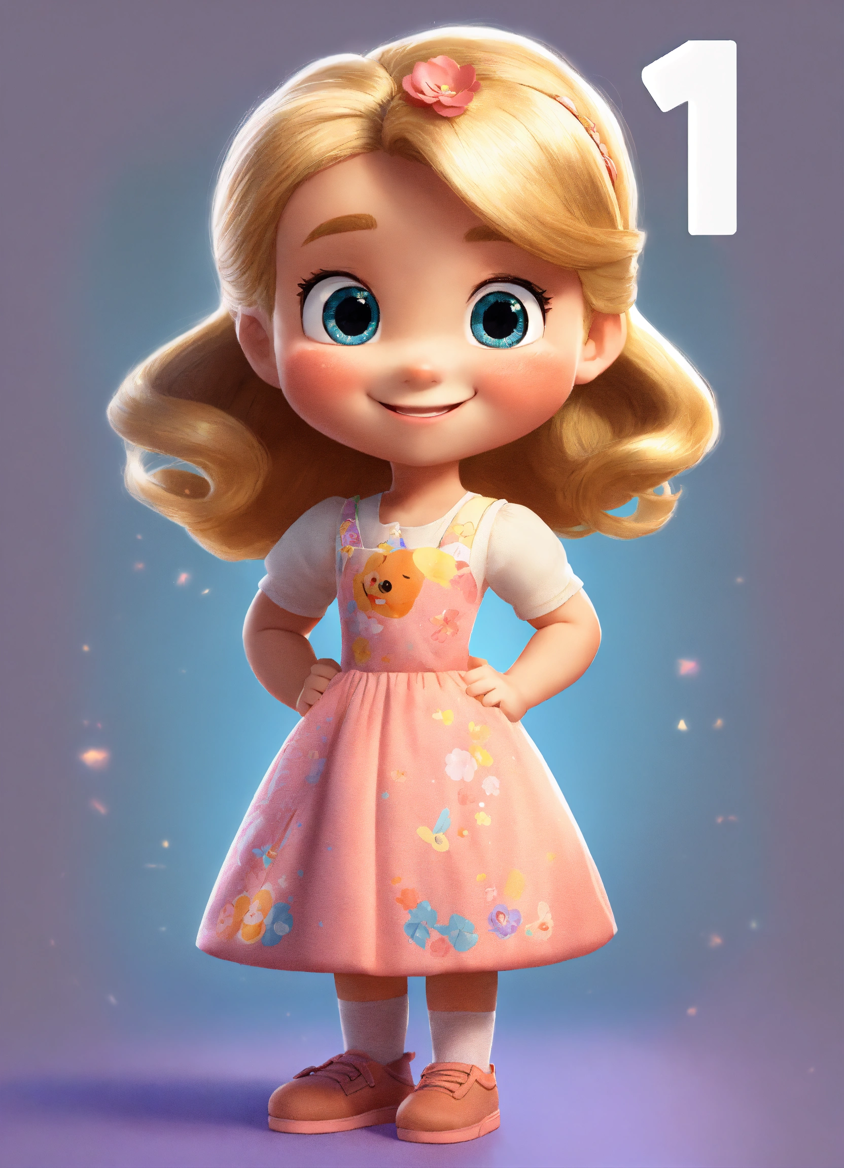Blond shoulder length hair joyful little girl wearing an adorable dress handling shape of the number 1, cartoon style, well shaded, smooth, pixar