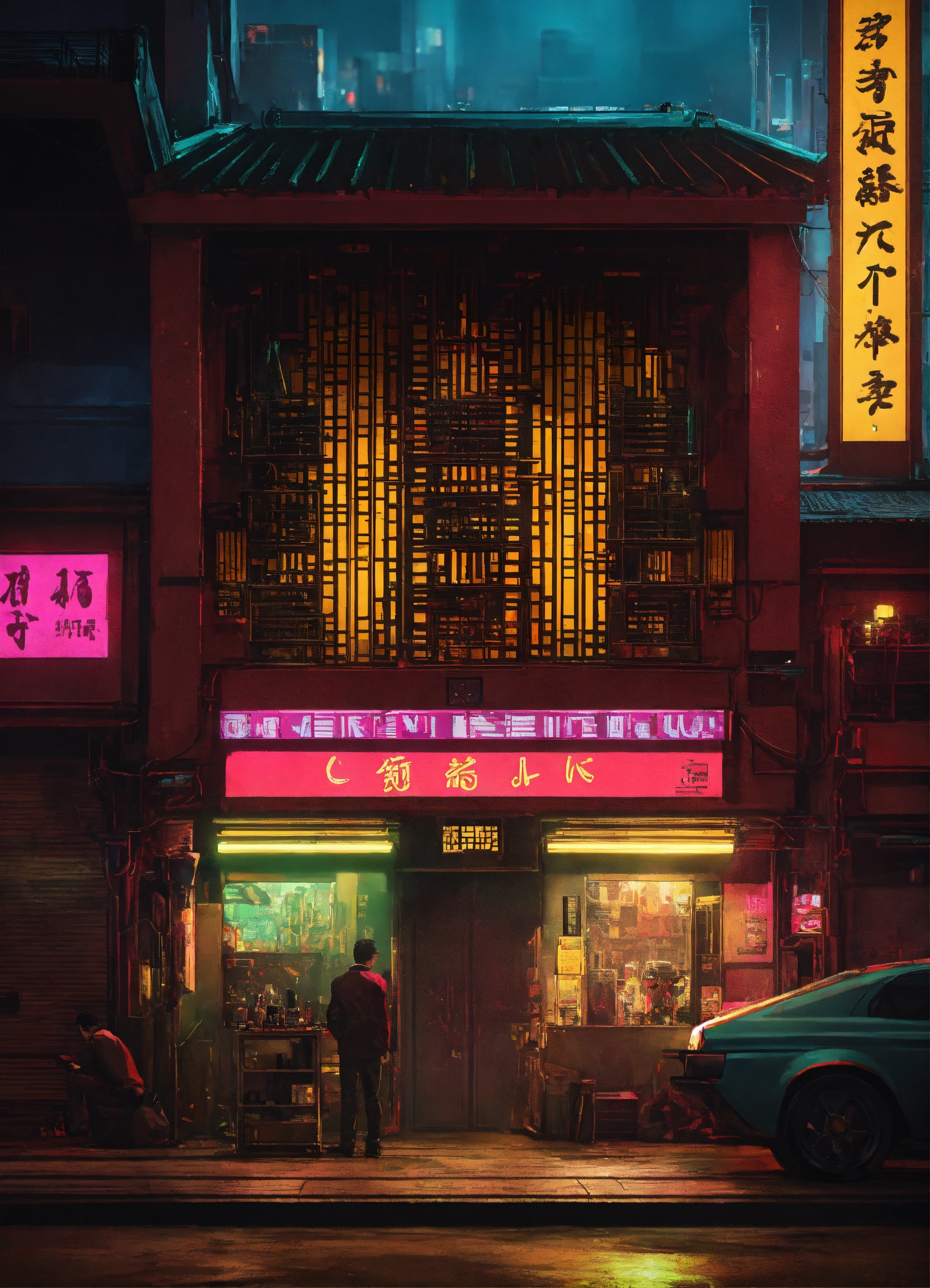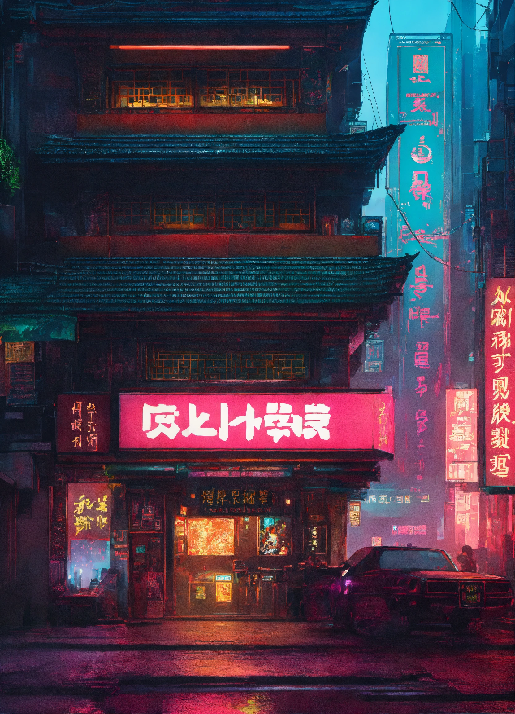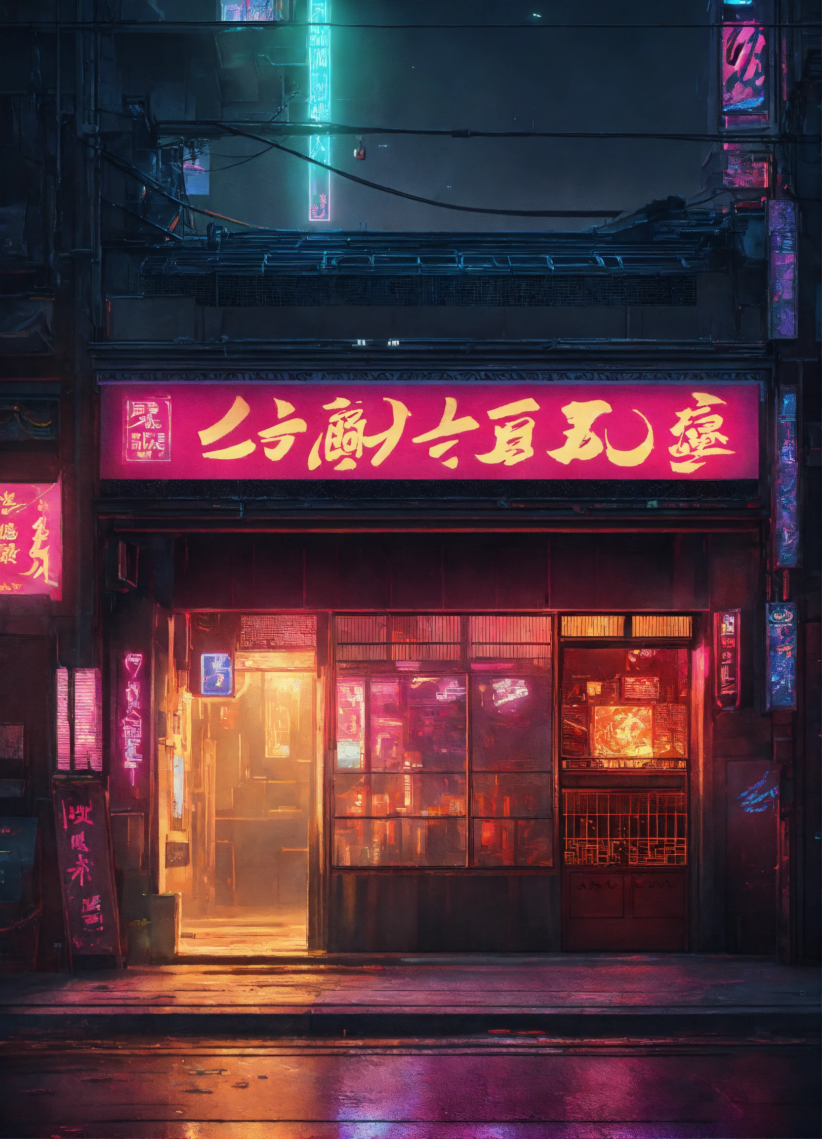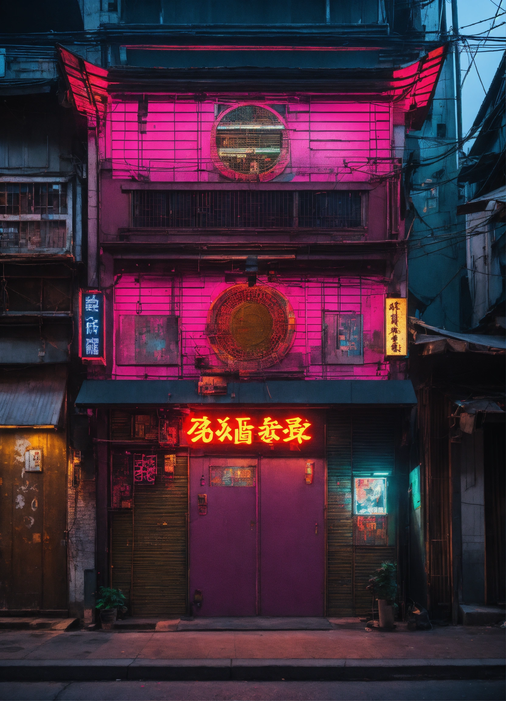 Facade of a cyberpunk nightclub in an asian atmosphere