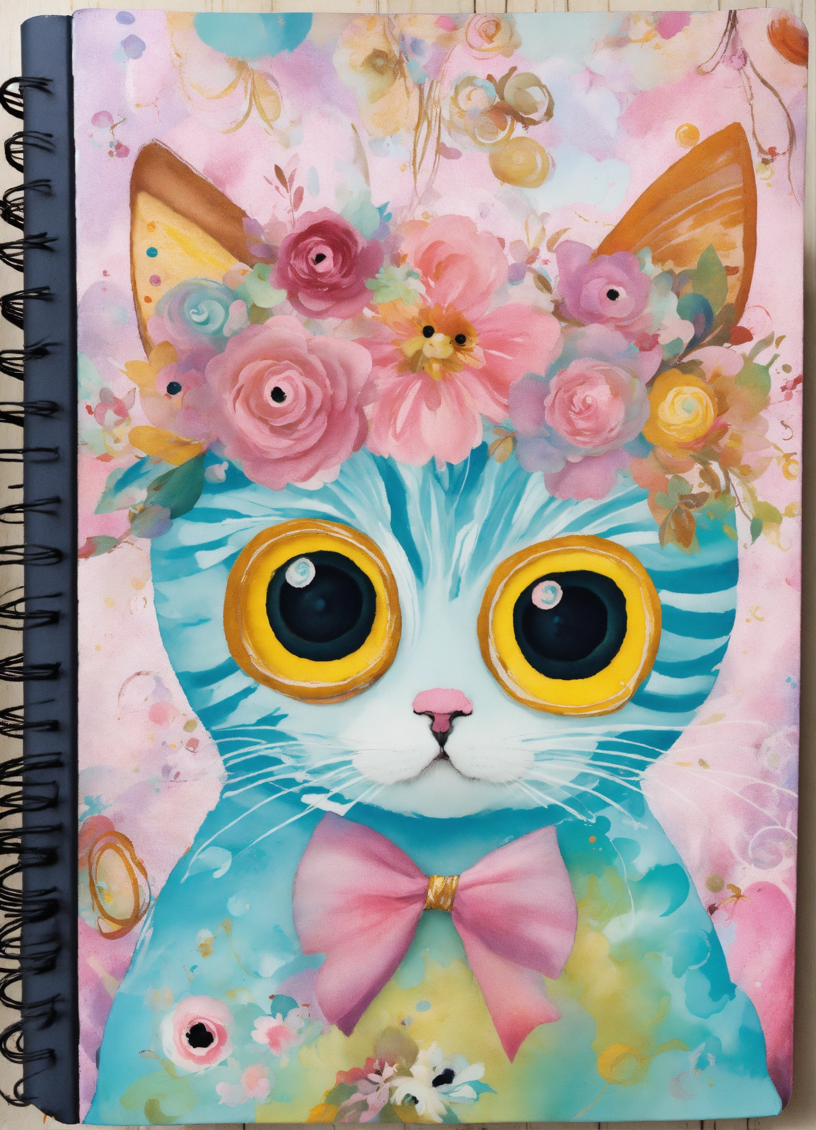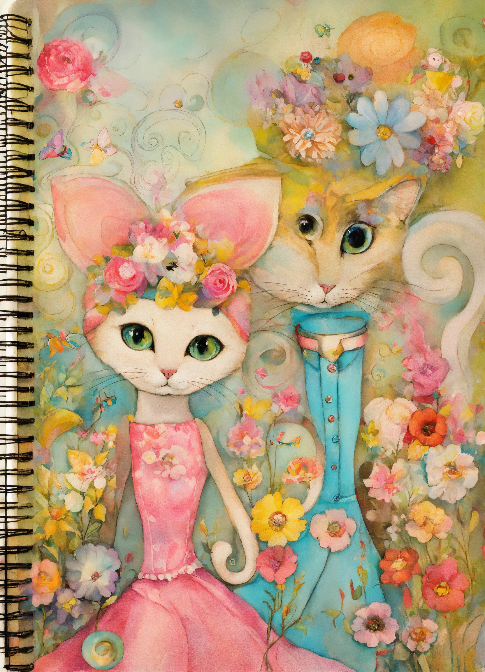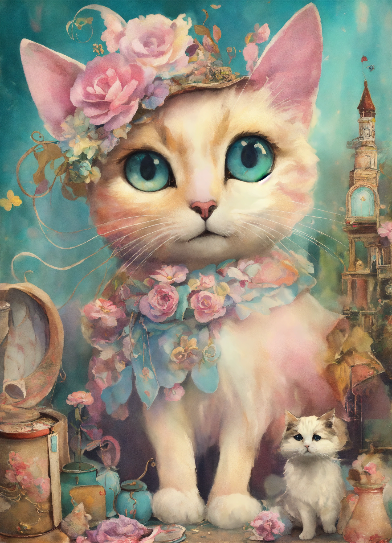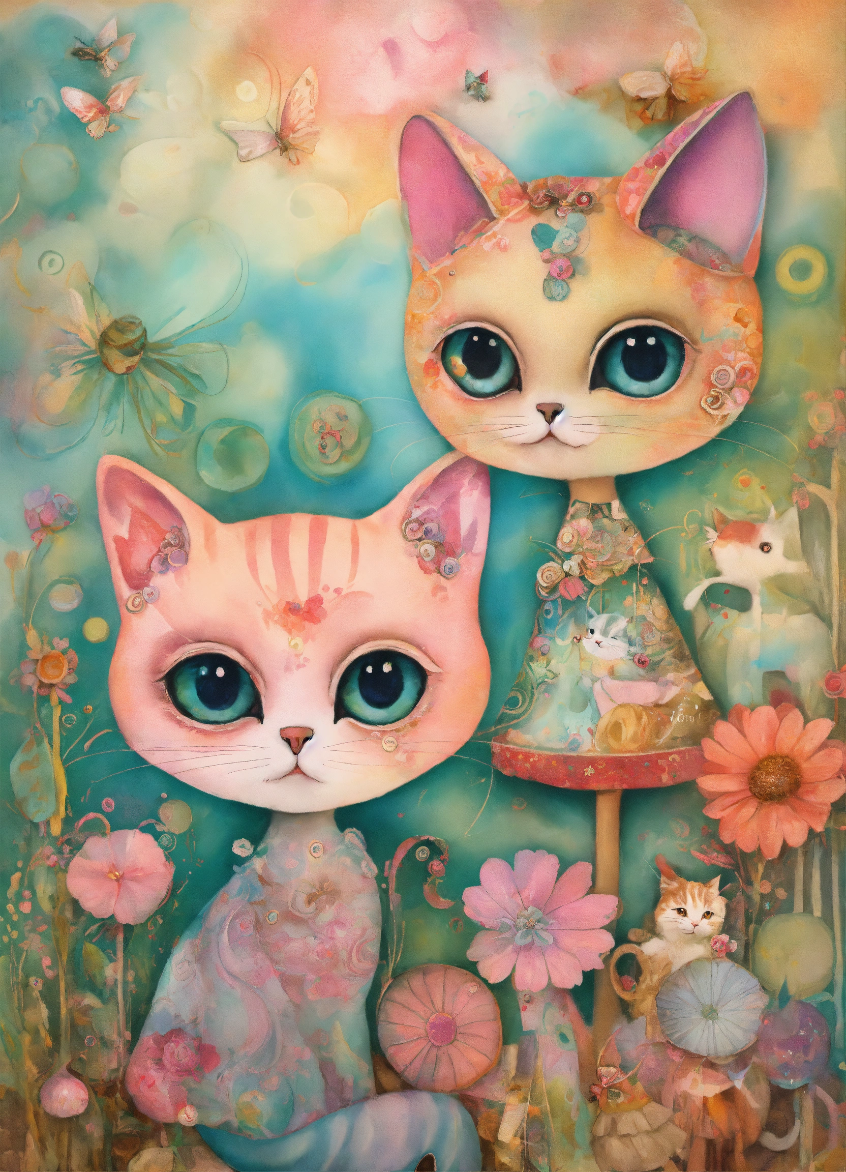 Shabby chic dreamy mist pastel junk journals whimsical cute quirky cats with big eyes in odd clothings, tamara laporte style, swirling magical fairytale abstract art style