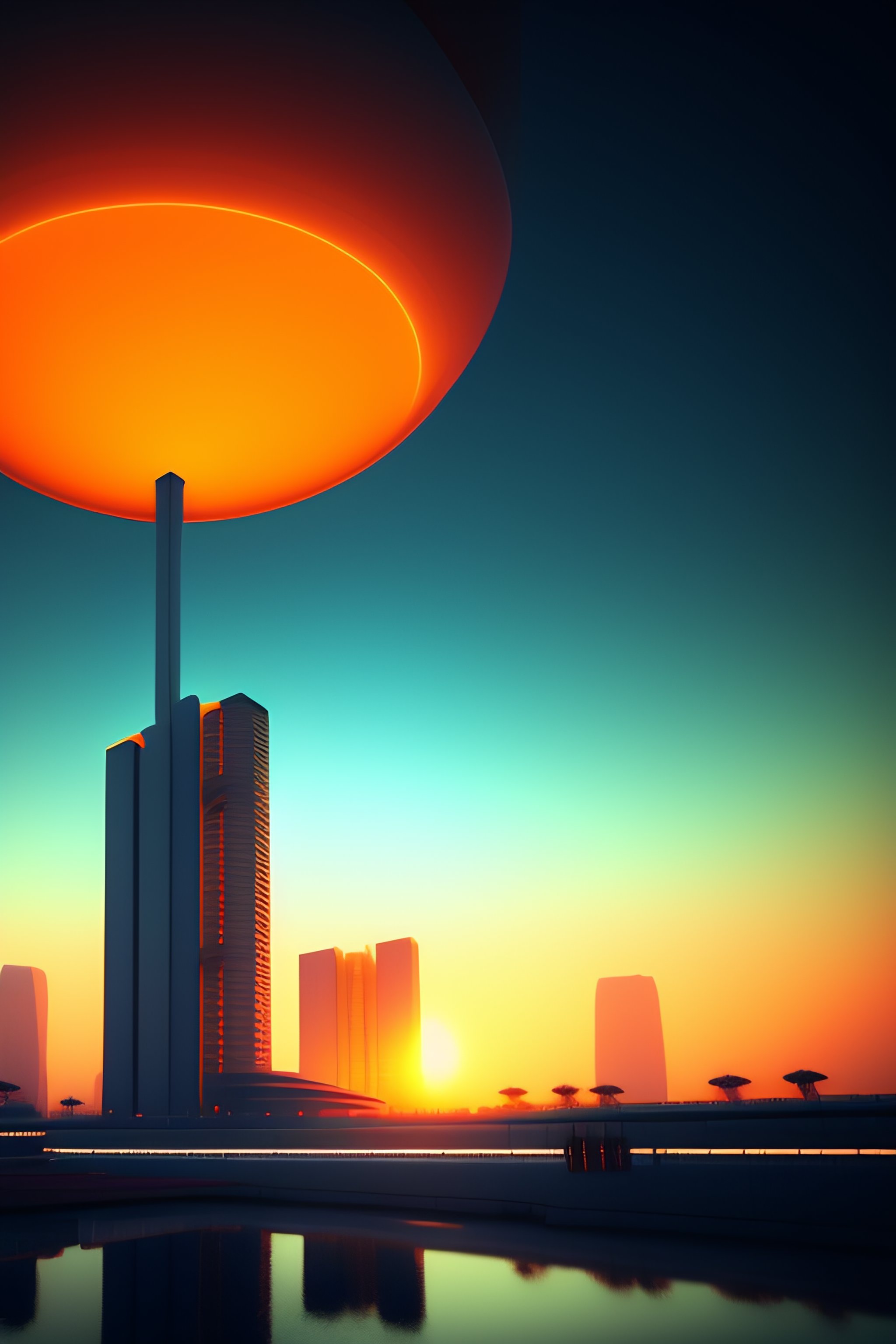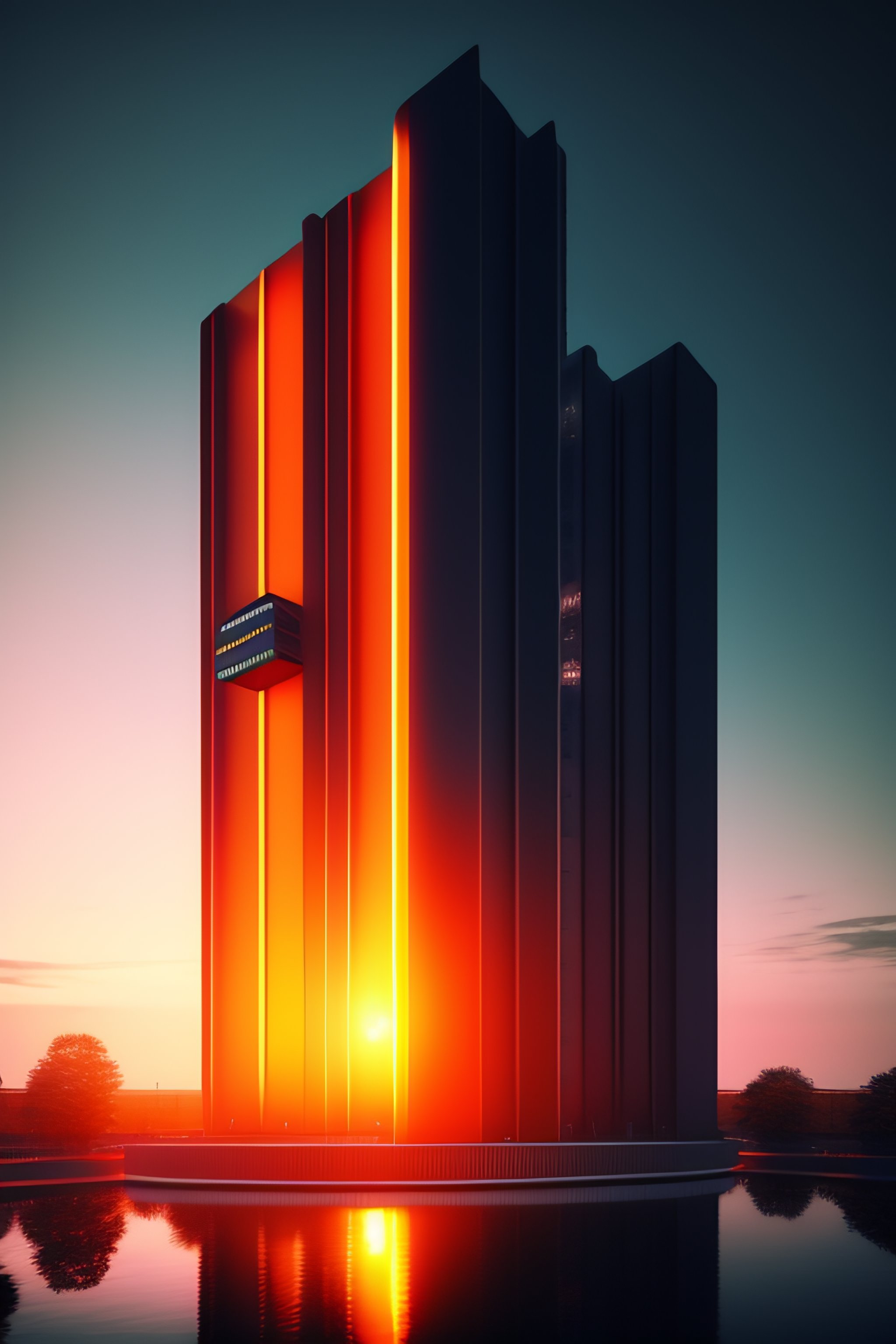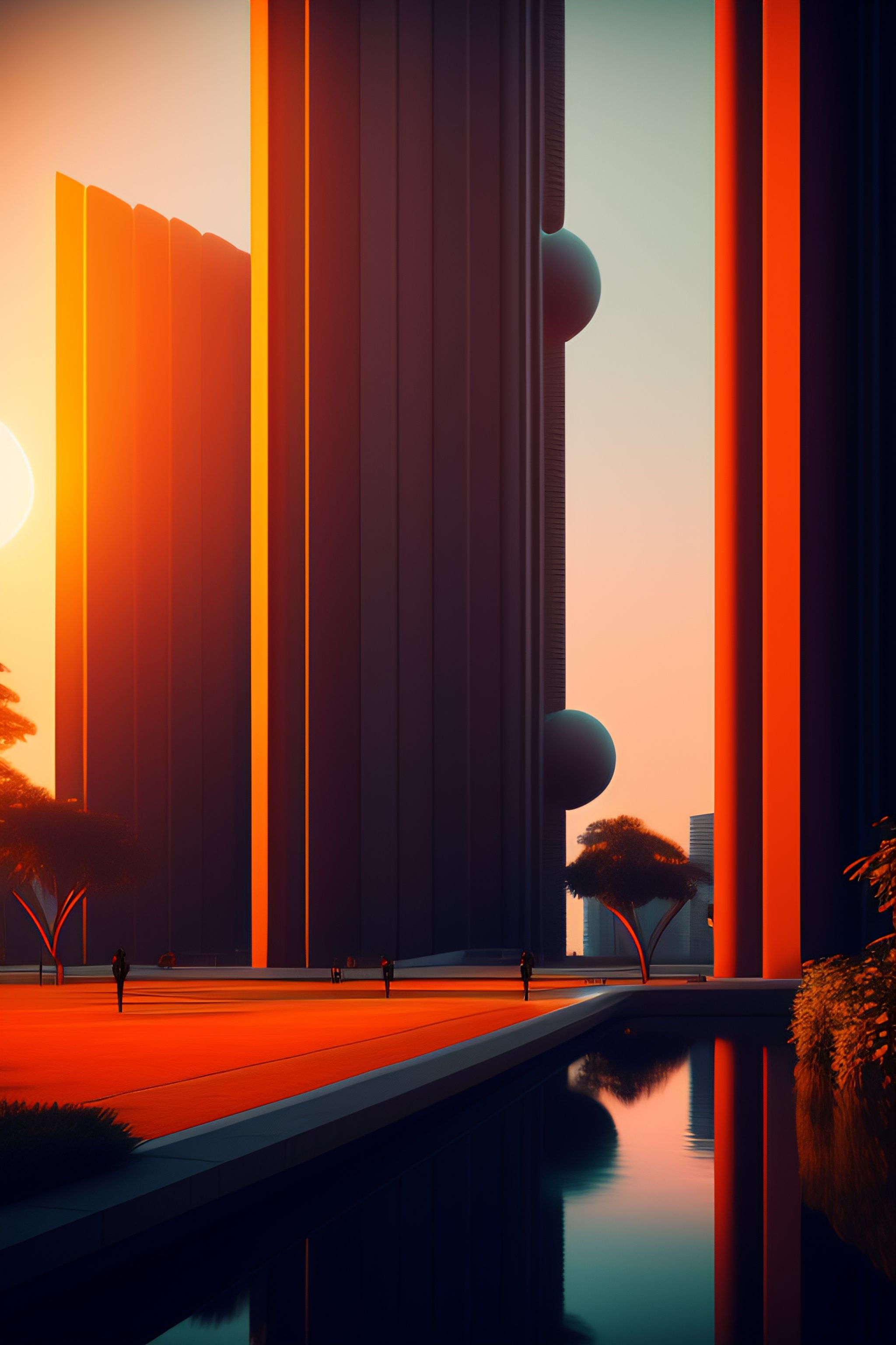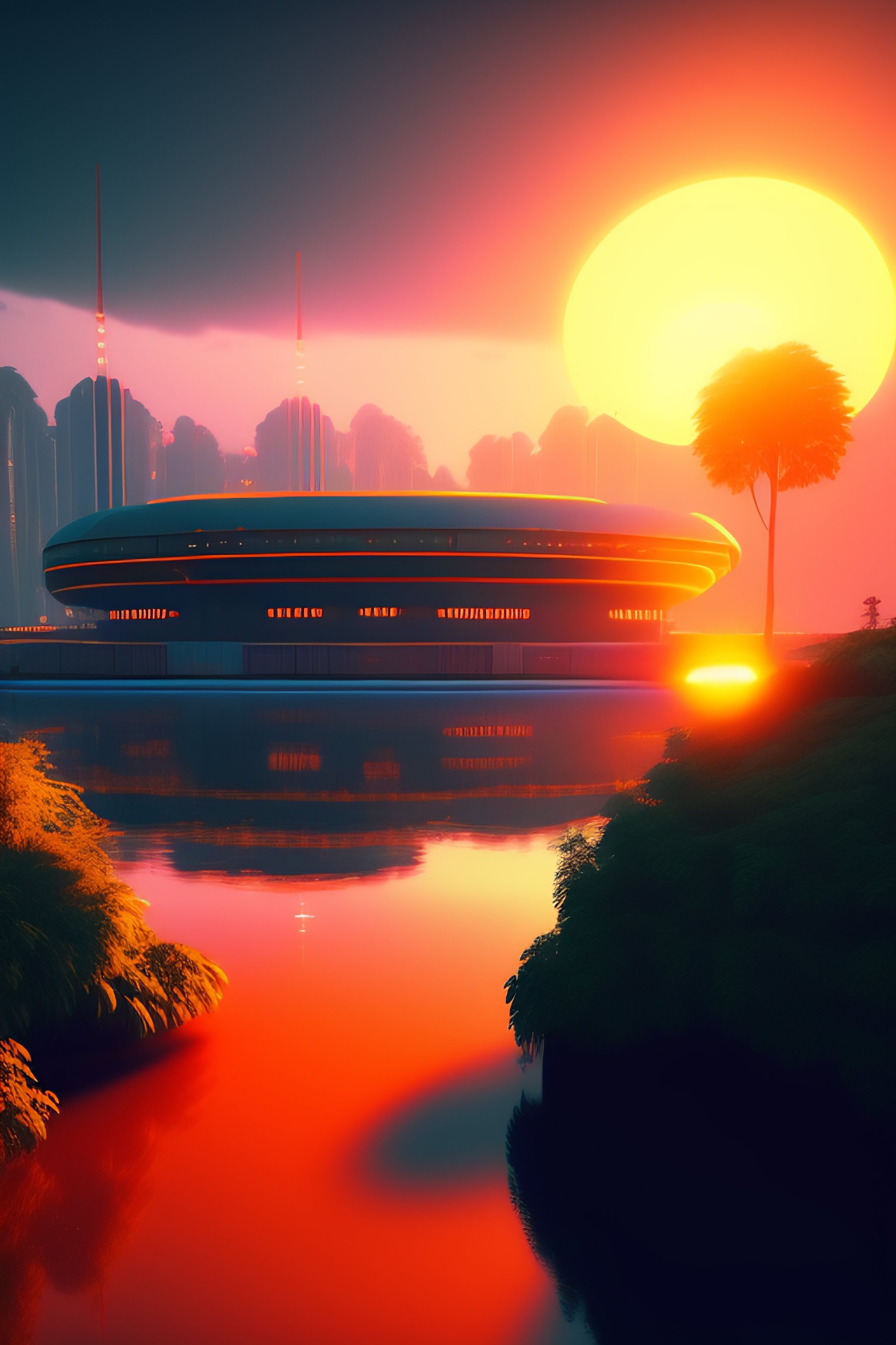 Futuristic spaceship, on the background brutalist architecture by le corbusier, good economic activity, surrounded by lush green vegetation, ground-level view, puddles of water, stunning volumetric lighting, sunset, trending on artstation, 8k, photorealistic, hyper detailed, unreal engine 5, cinematic, epic lighting, cryengine, octane render, cyberpunk, red and orange glow, dark, gloomy
