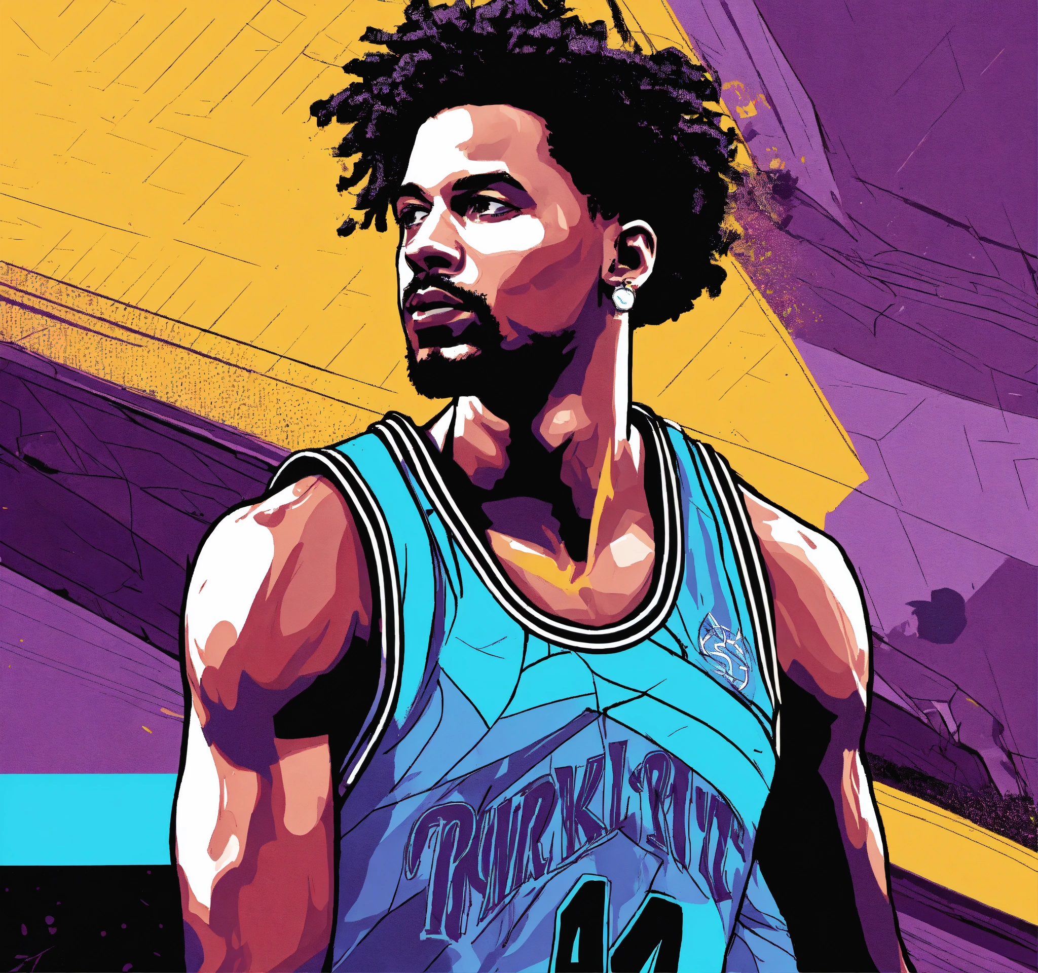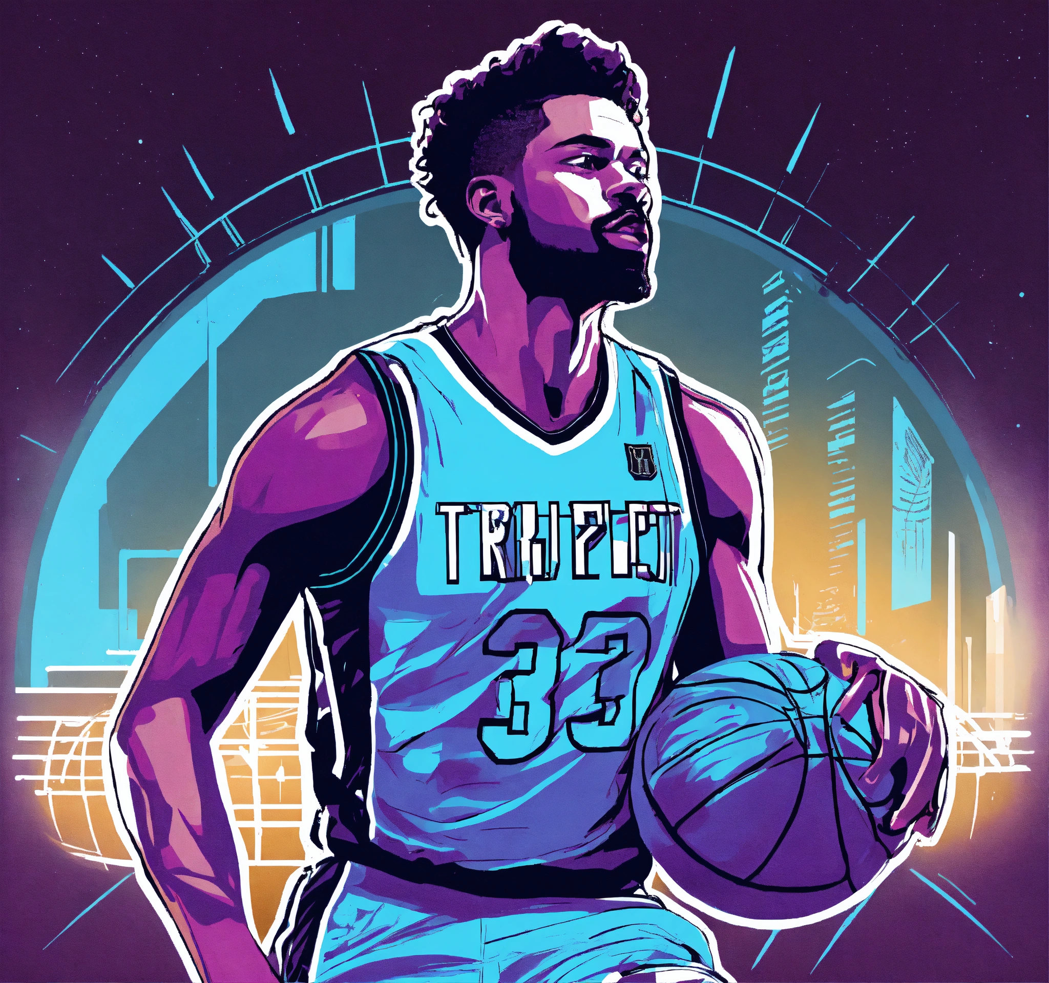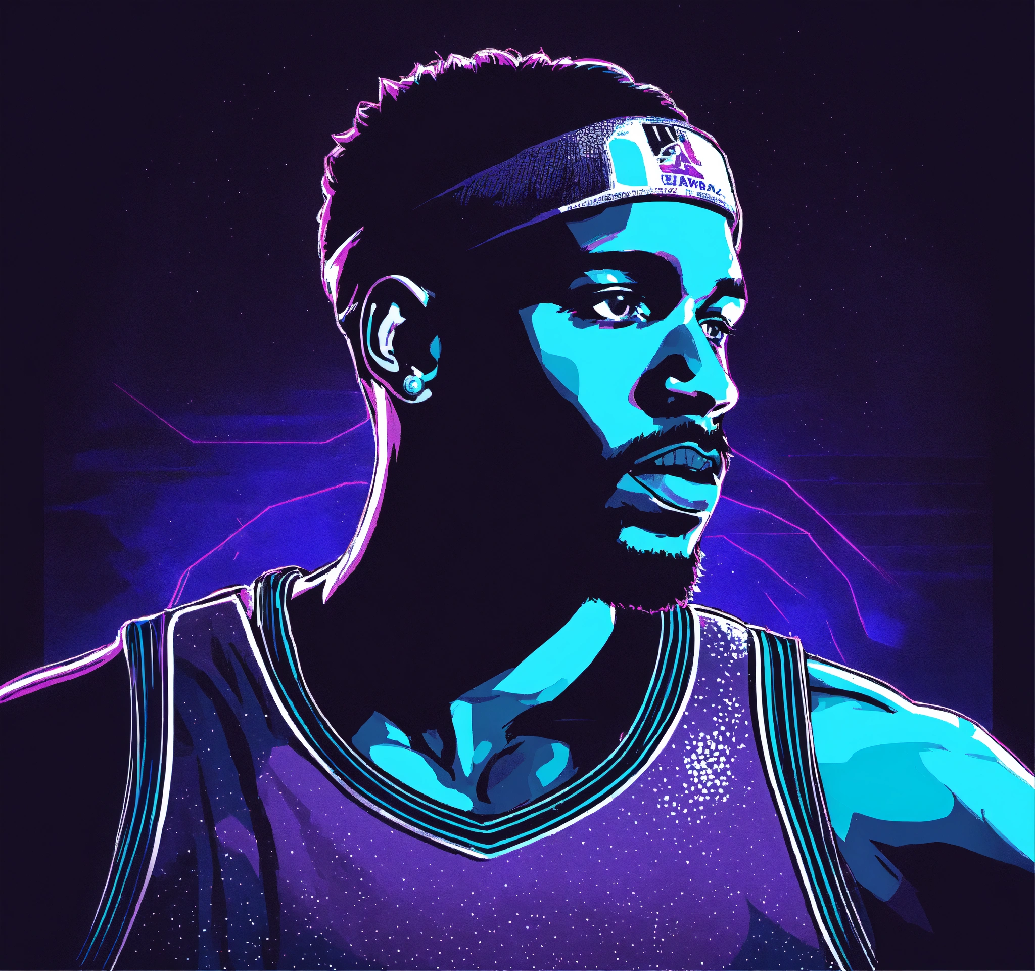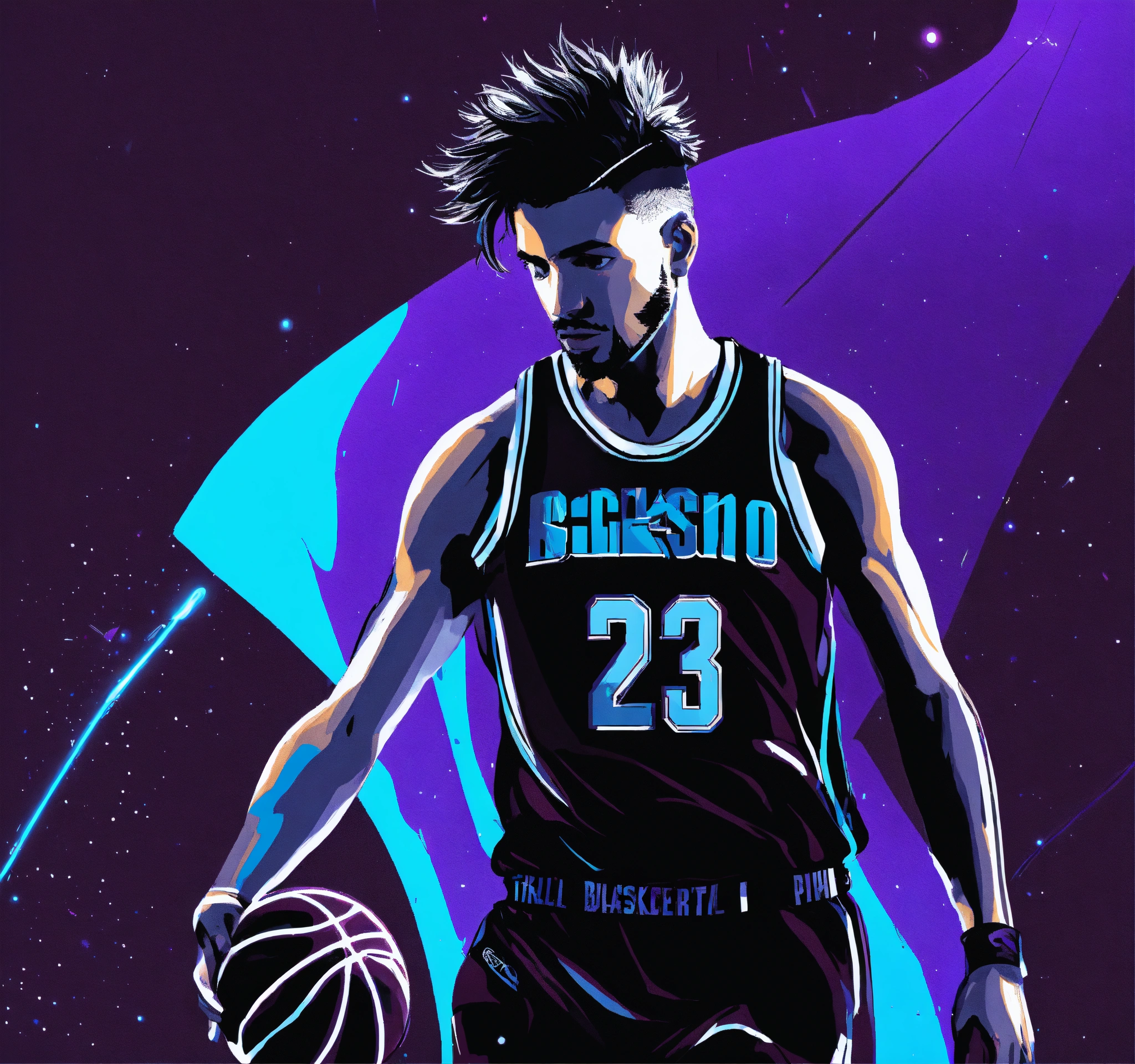 Male basketball player, vector, graphic t-shirt design, full design, white background, black and silver, in the style of dark purple and sky-blue, celebrity portraits, cinquecento, neon lights, carpetpunk, backlit photography, trillwave