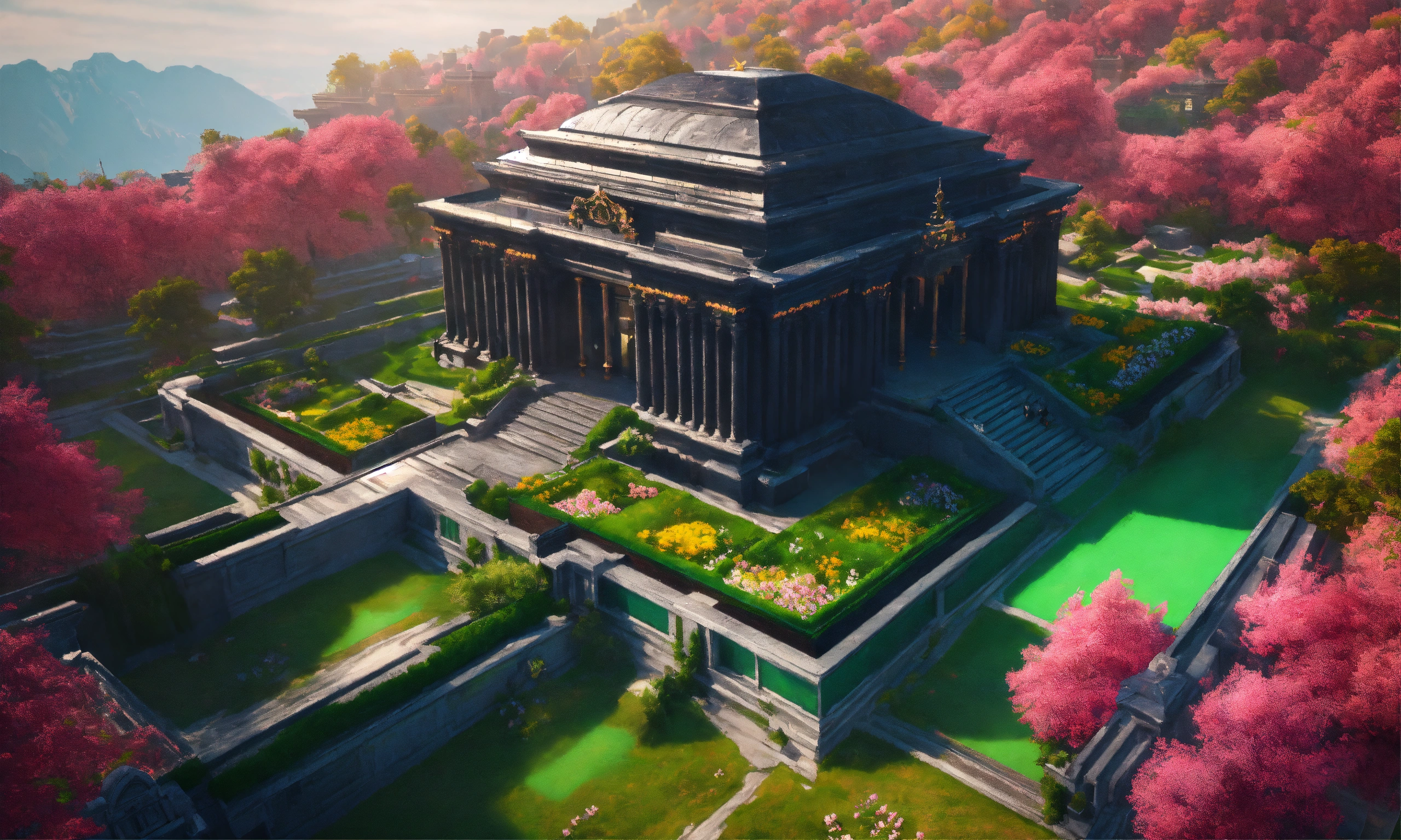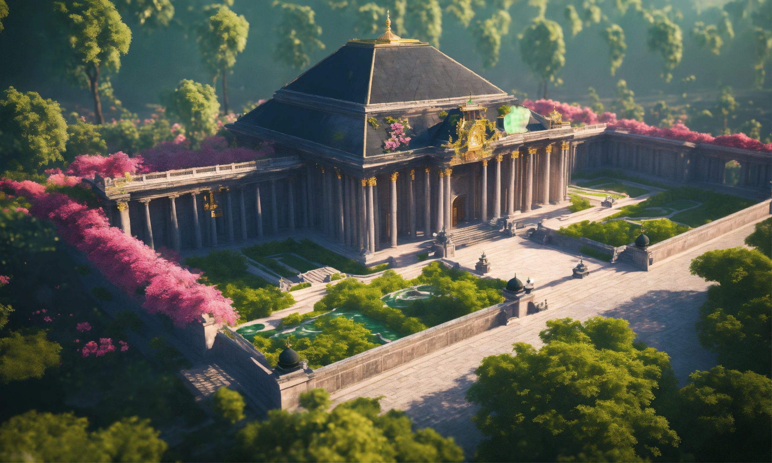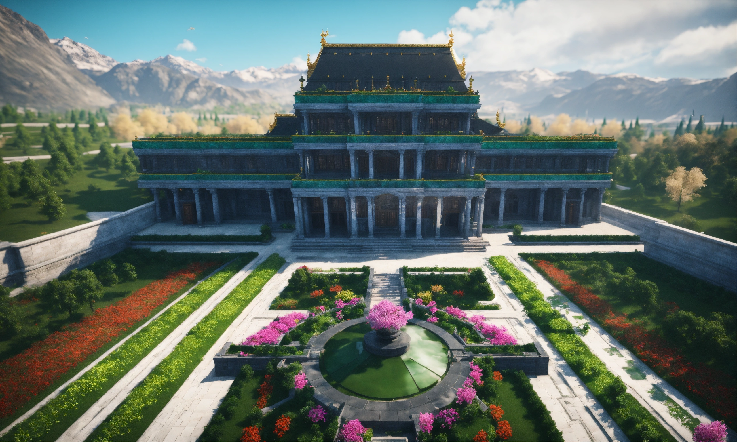 Overhead view of a black marble and jade sci fi symmetrical royal palace in spring, colorful flower gardens around the palace, russian architecture, 8k, unreal engine